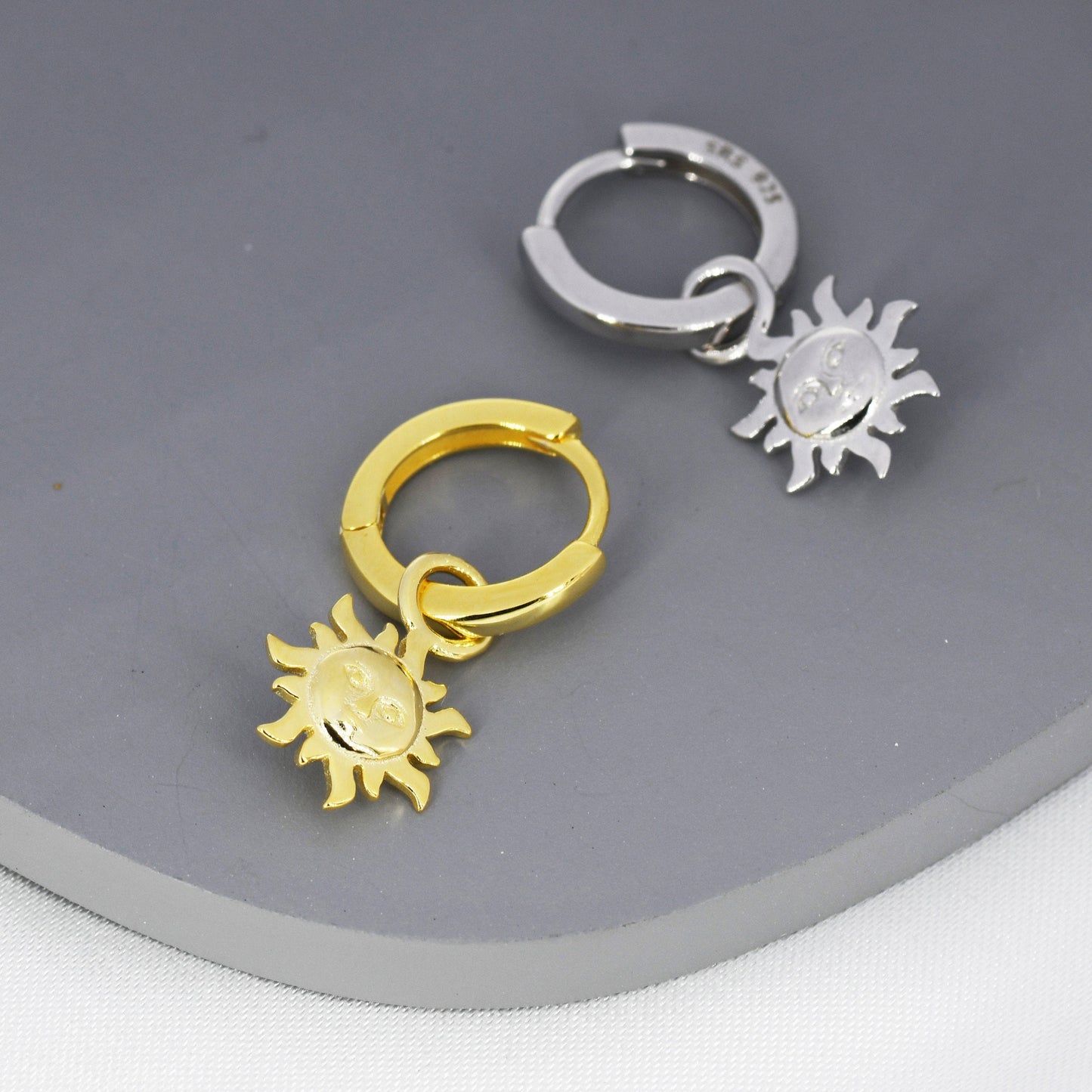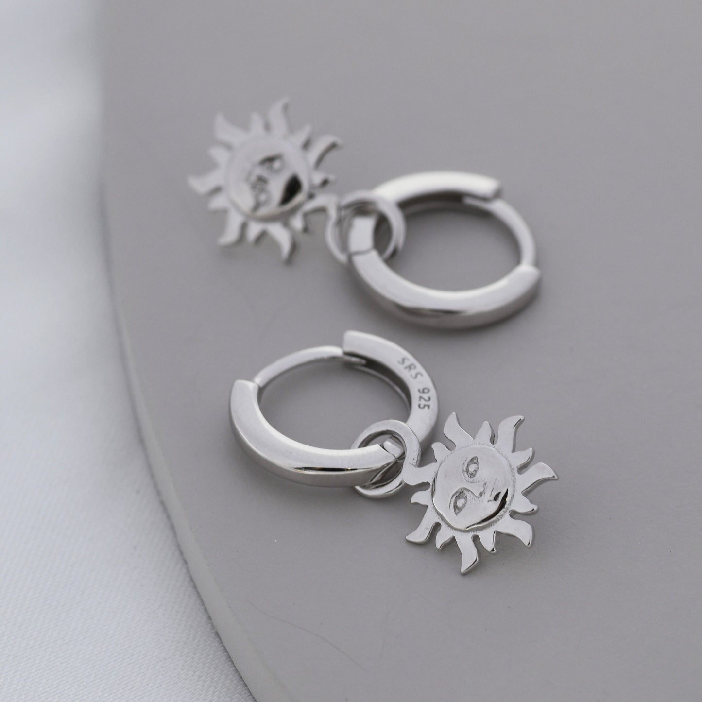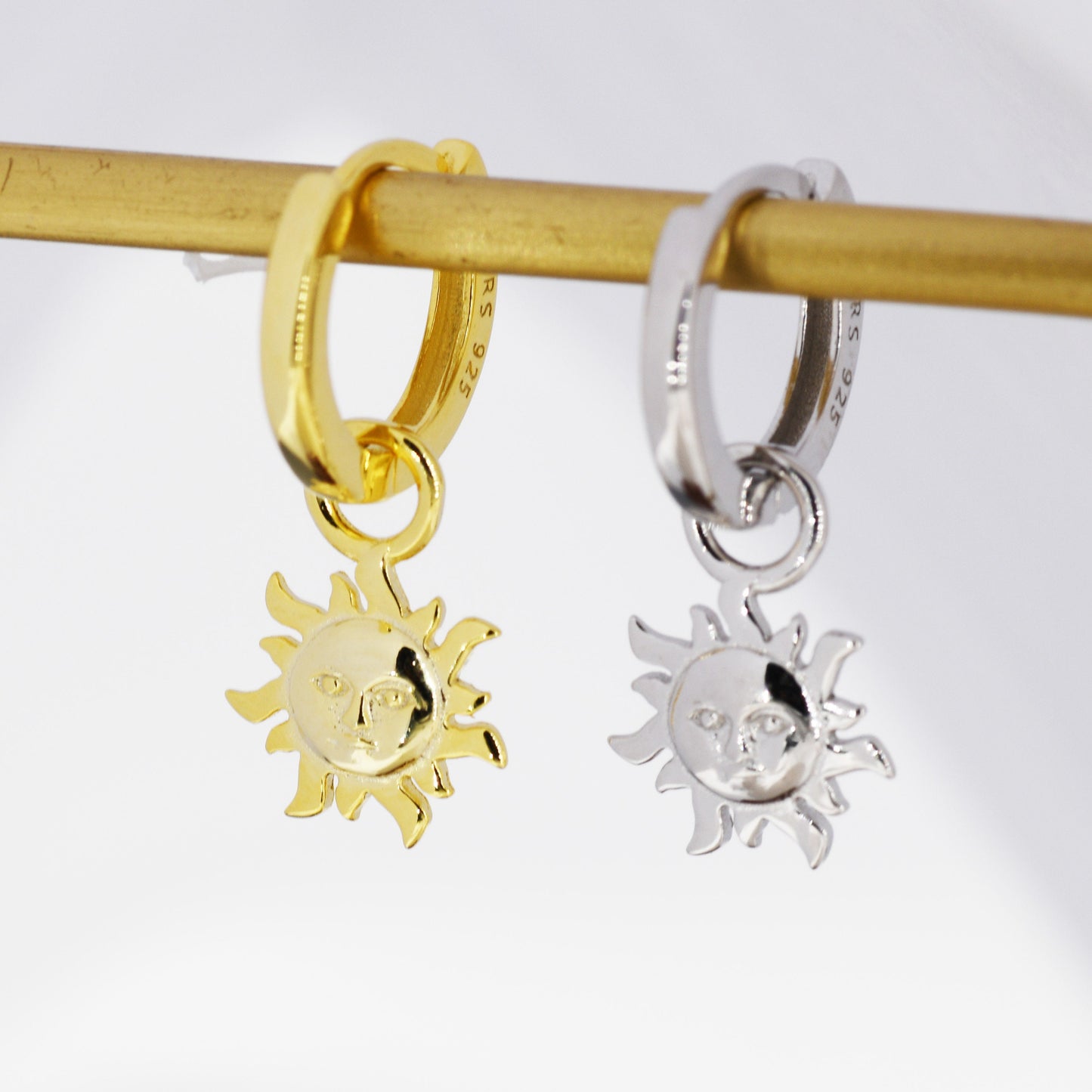 Dangling Sun with Face Hoop in Sterling Silver, Silver or Gold, Sun Face Earrings, Detachable and Interchangeable