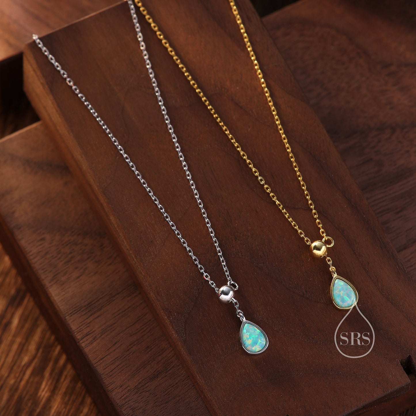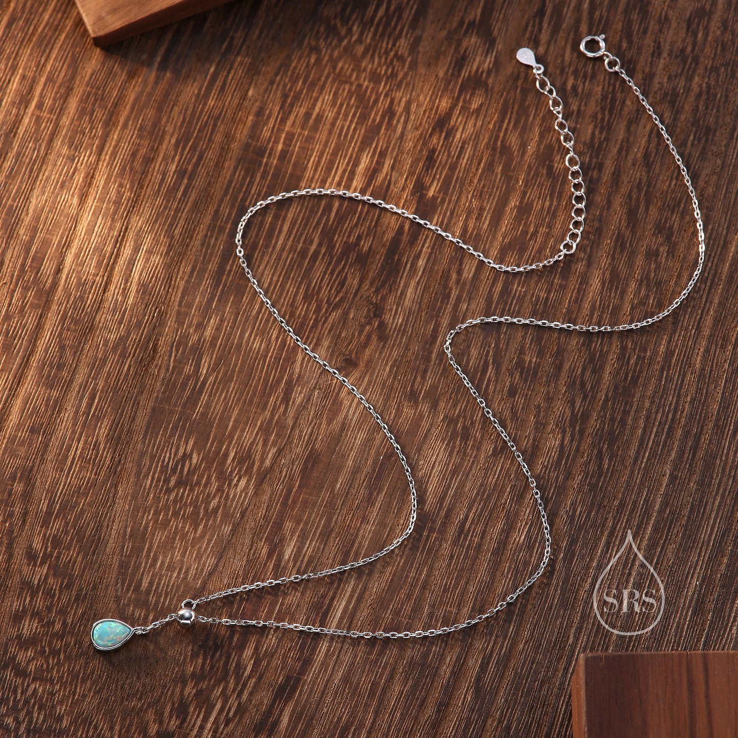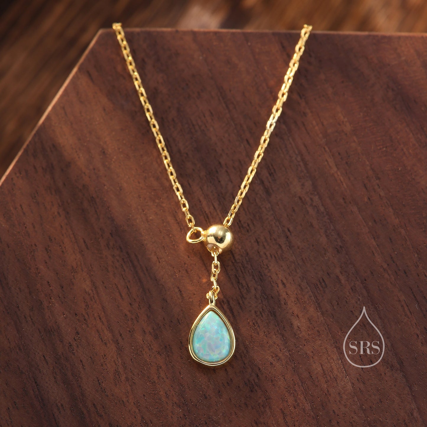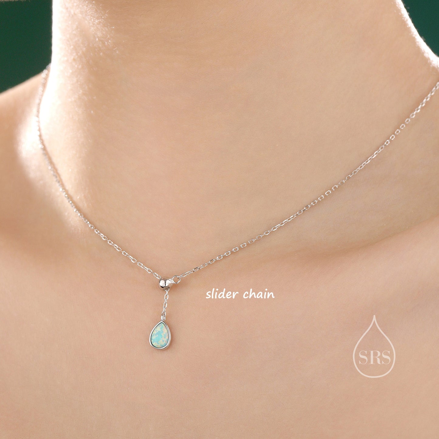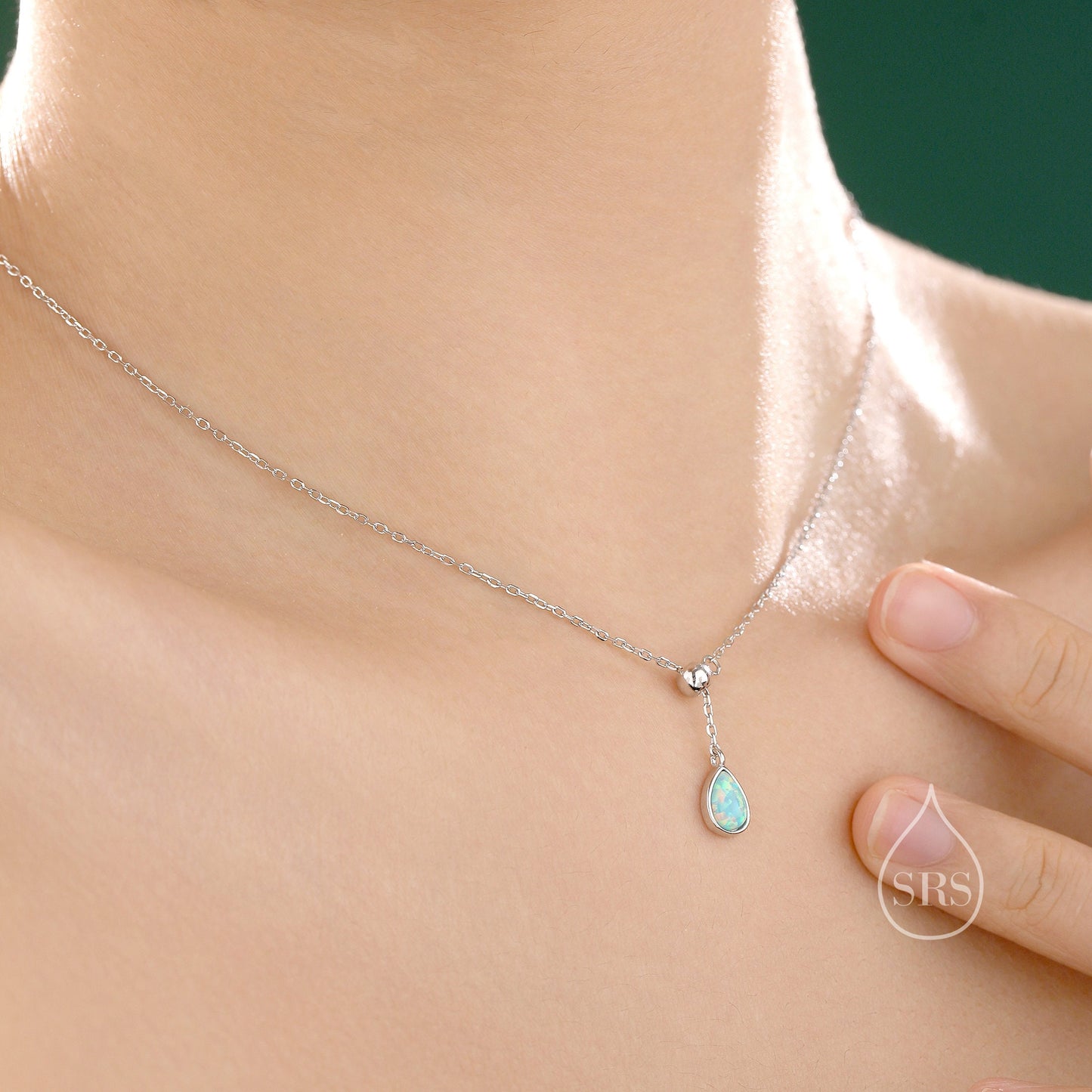 Delicate Aqua Green Opal Droplet Lariat Pendant Necklace in Sterling Silver, Silver or Gold, Pear Shape Lab Opal Adjustable Necklace