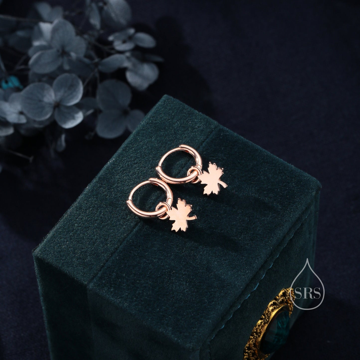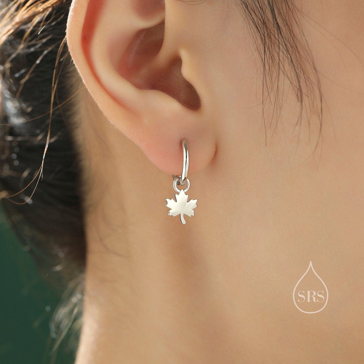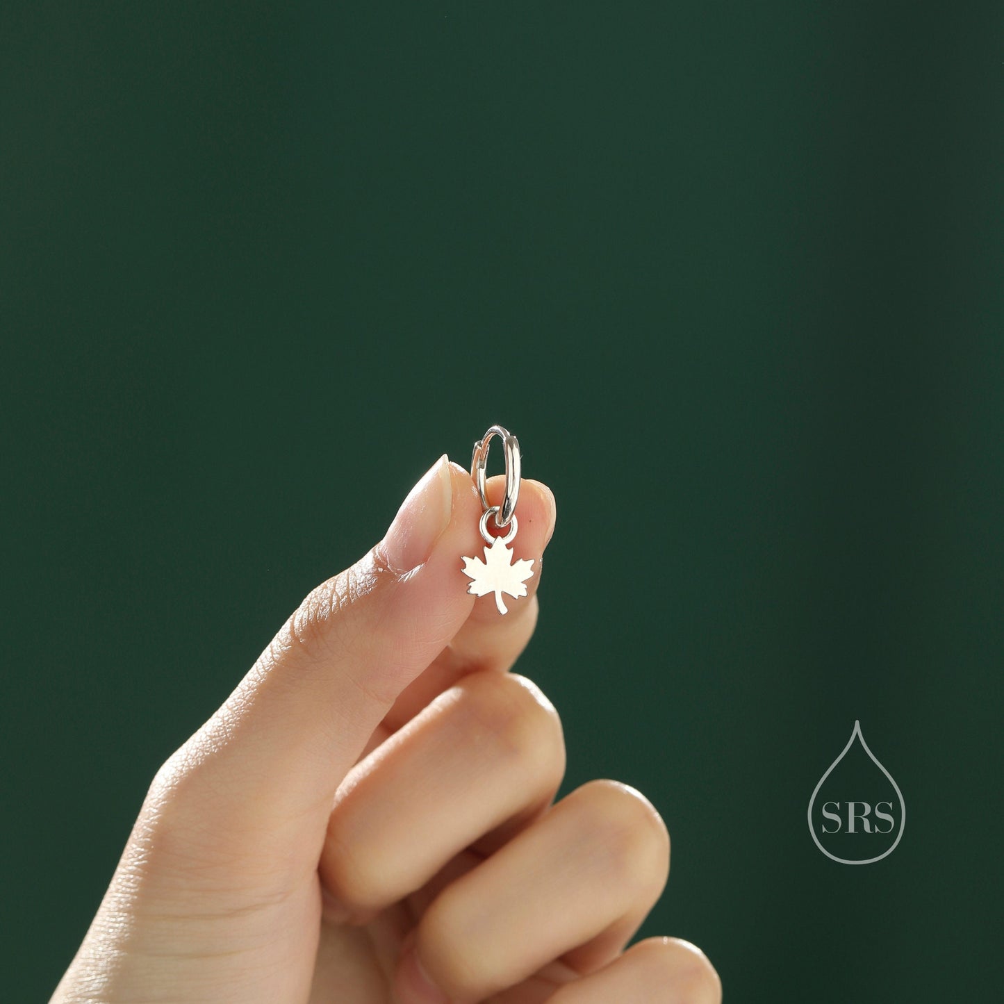 Delicate Maple Leaf Charm Huggie Hoop Earrings in Sterling Silver, Silver, Gold or Rose Gold, Maple Leaf Charm Huggies Hoops, Detachable