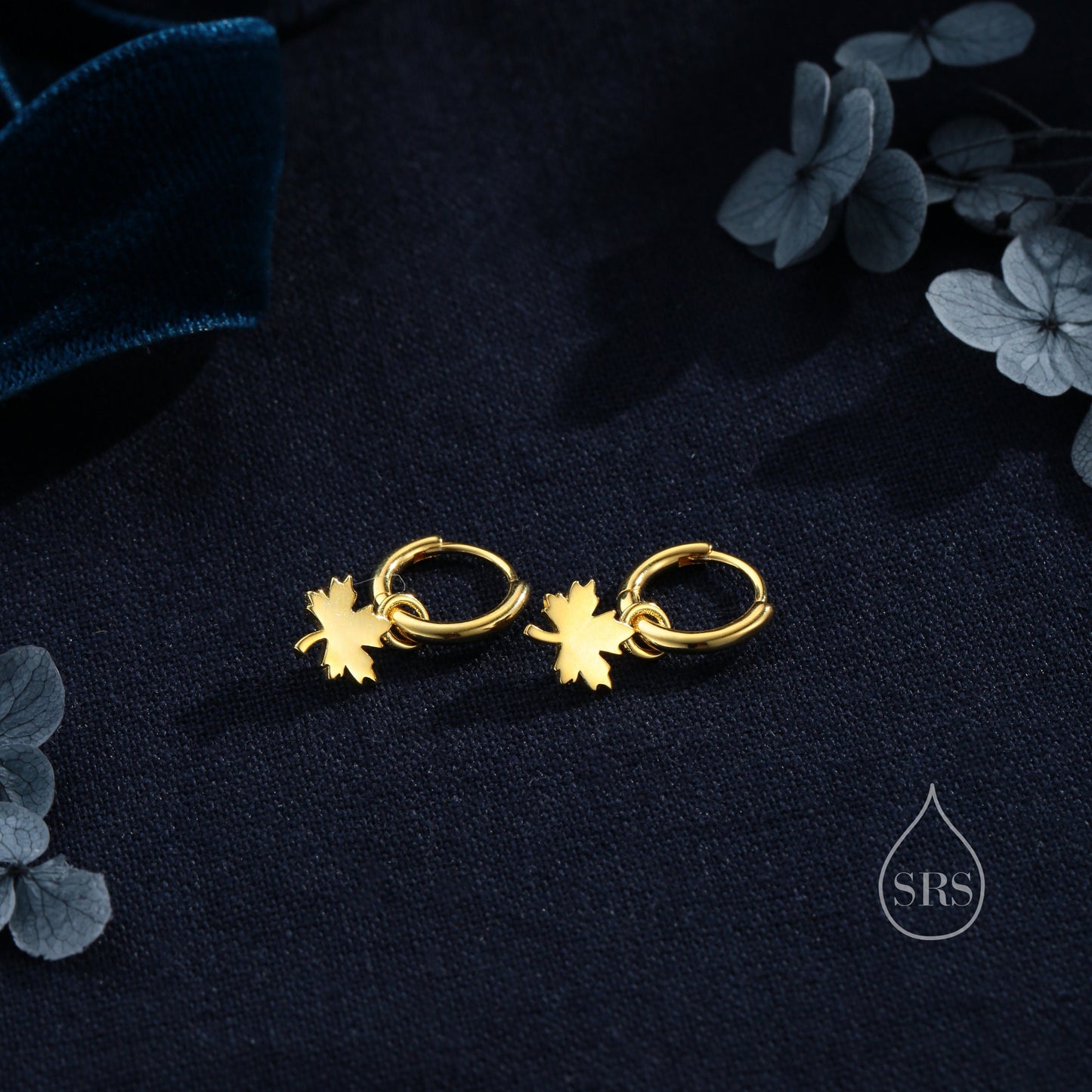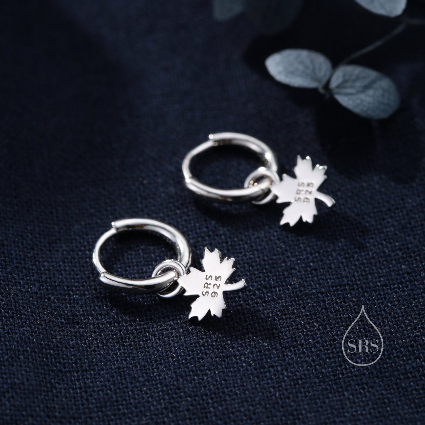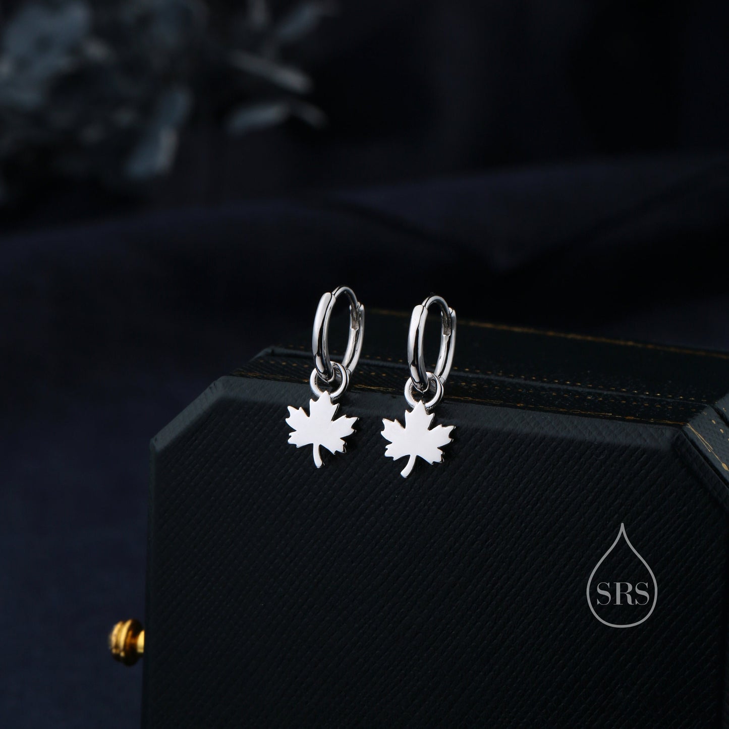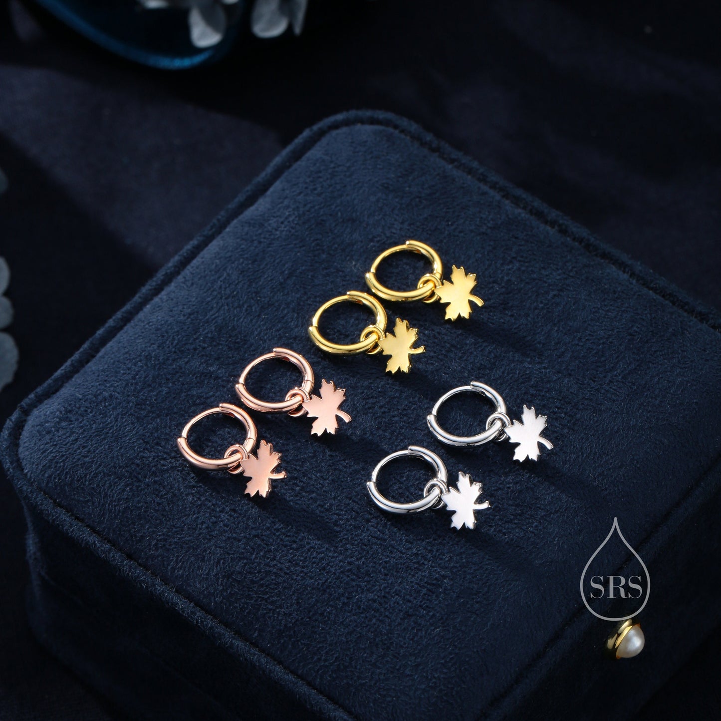 Delicate Maple Leaf Charm Huggie Hoop Earrings in Sterling Silver, Silver, Gold or Rose Gold, Maple Leaf Charm Huggies Hoops, Detachable