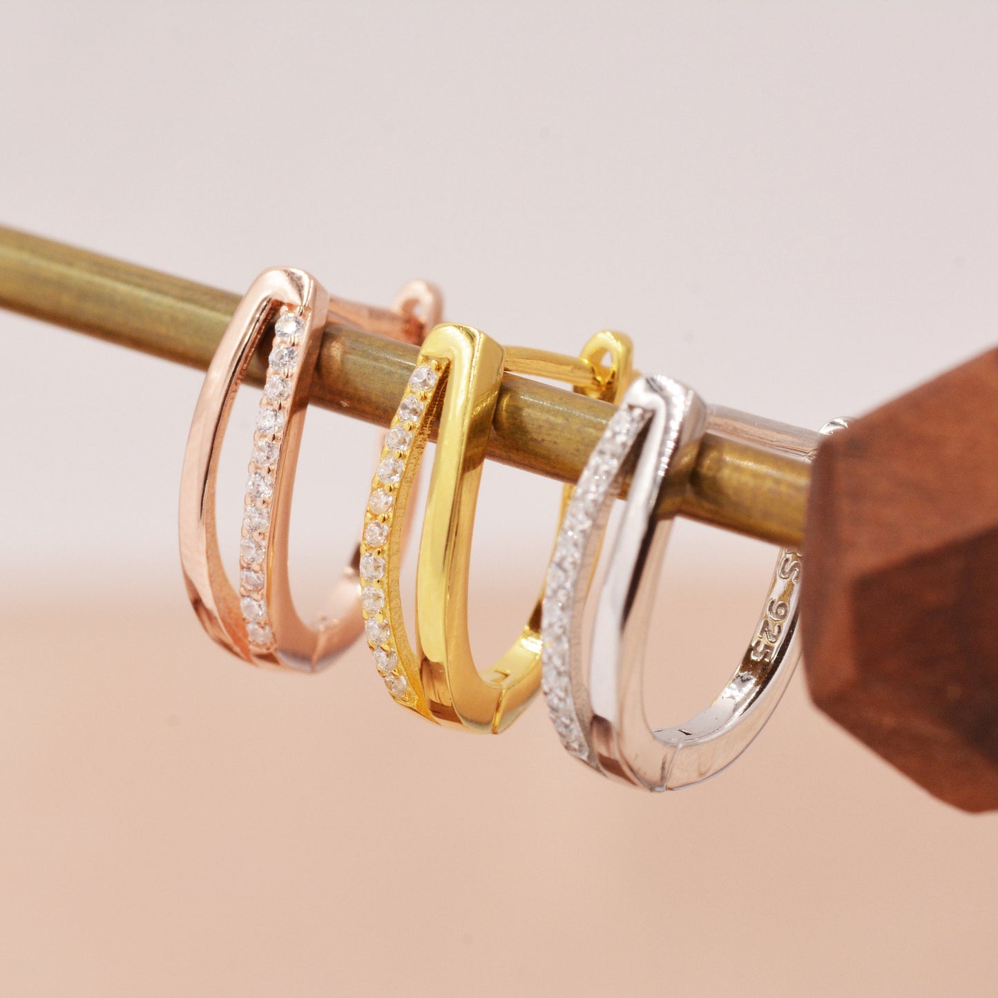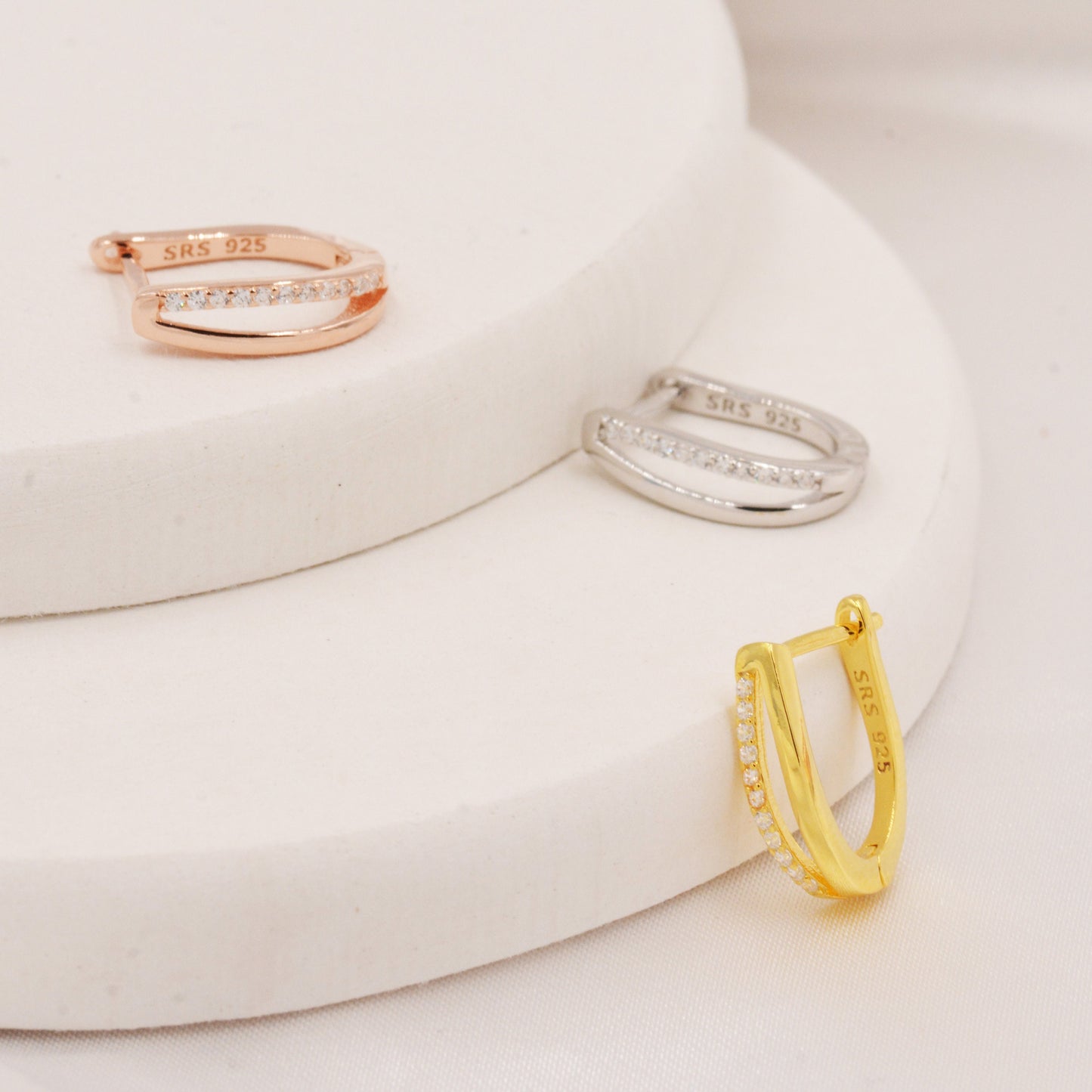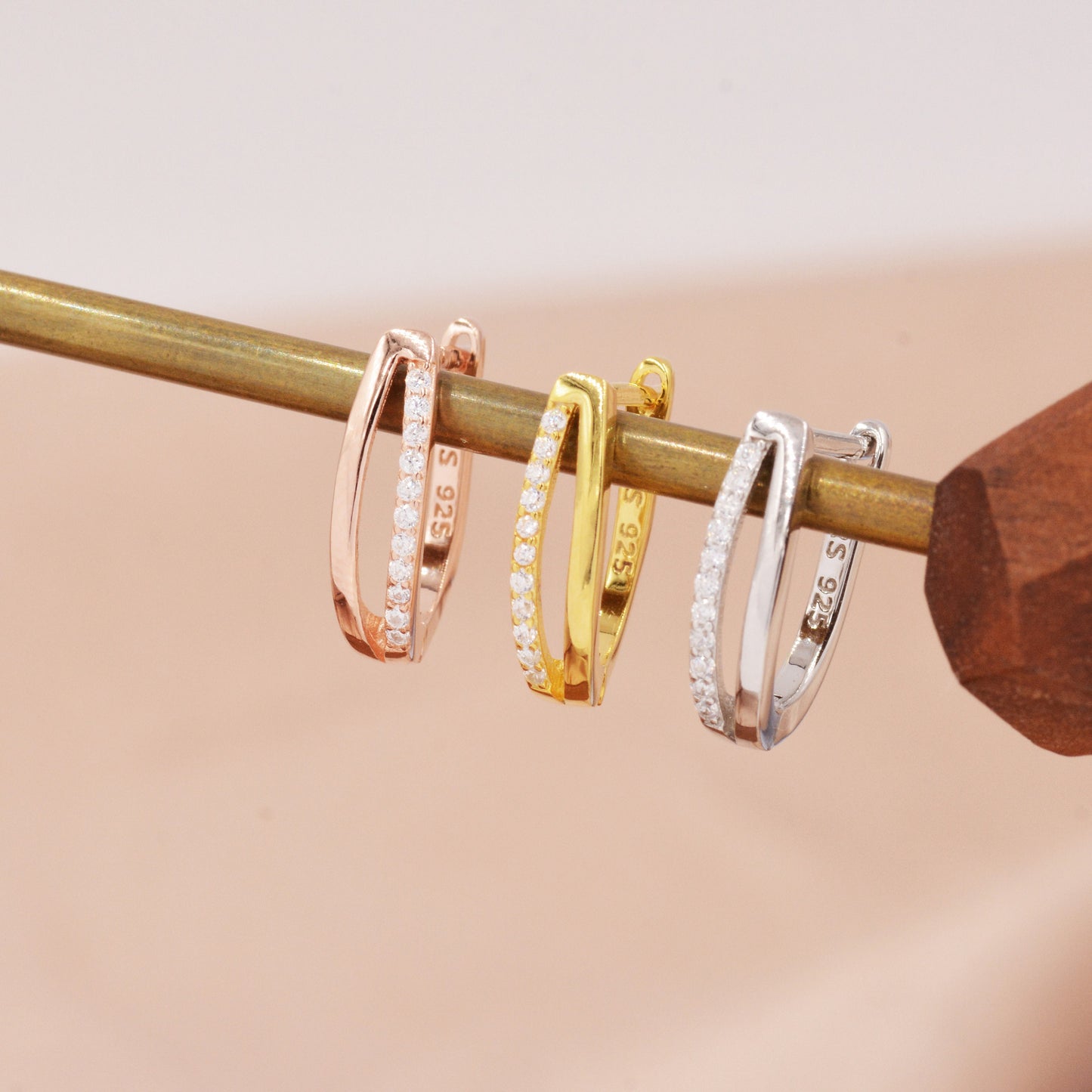 Double Huggie Hoop CZ Earrings in Sterling Silver, Geometric CZ Hoop Earrings, Silver, Gold or Rose Gold, 10mm, Minimalist Hoops