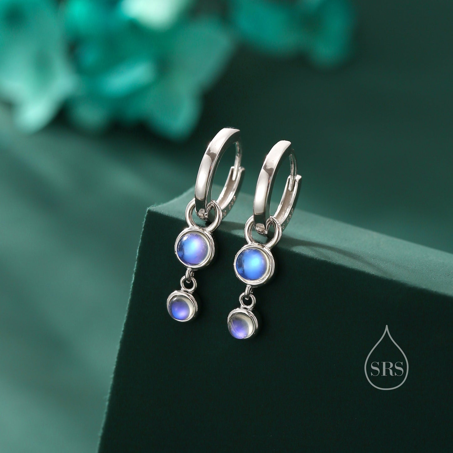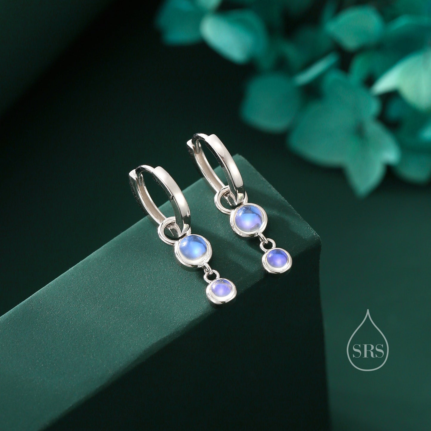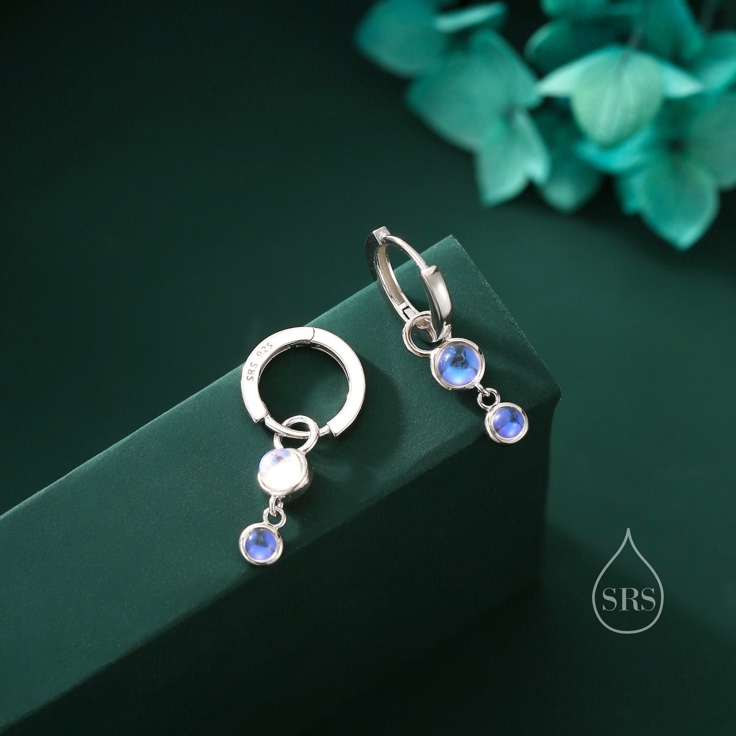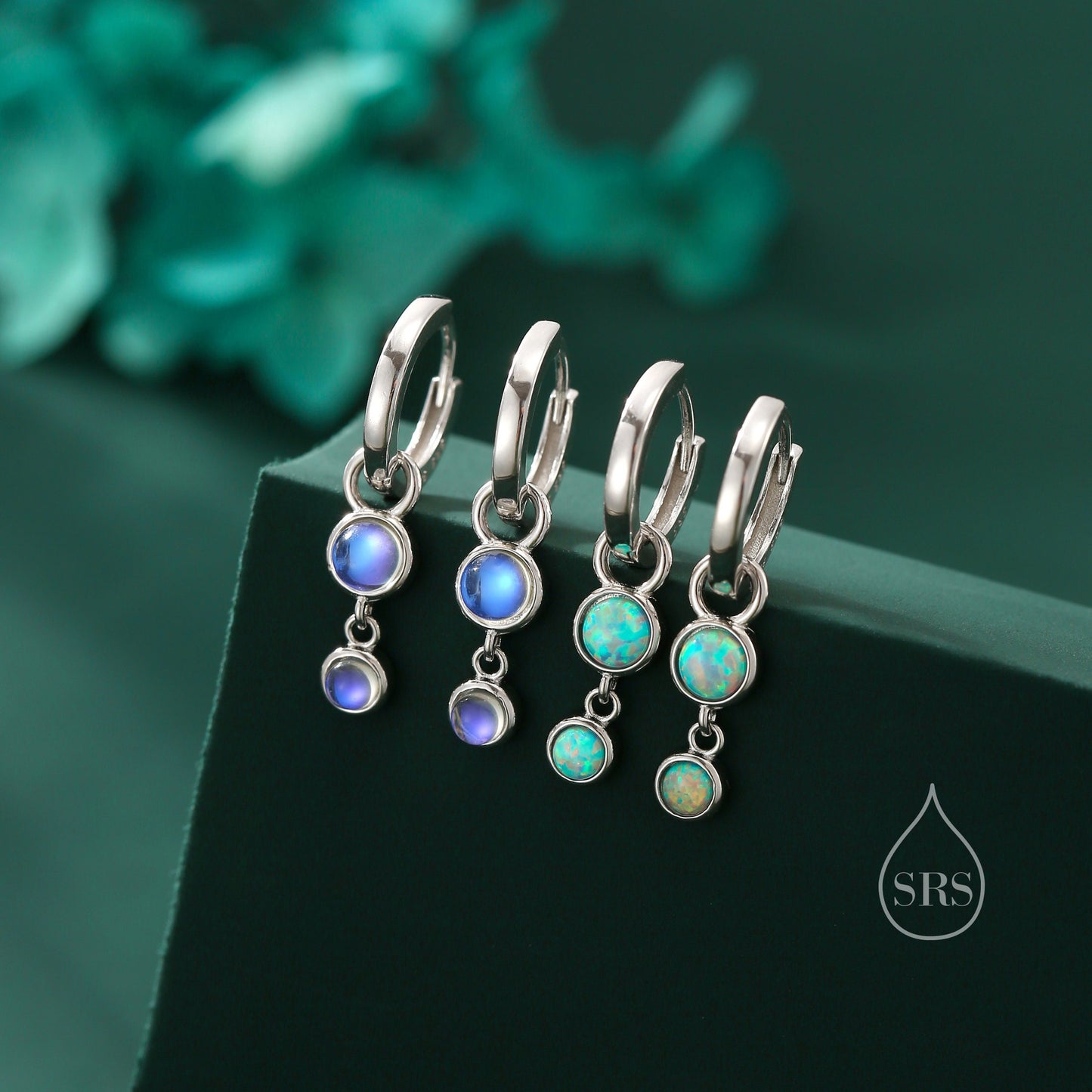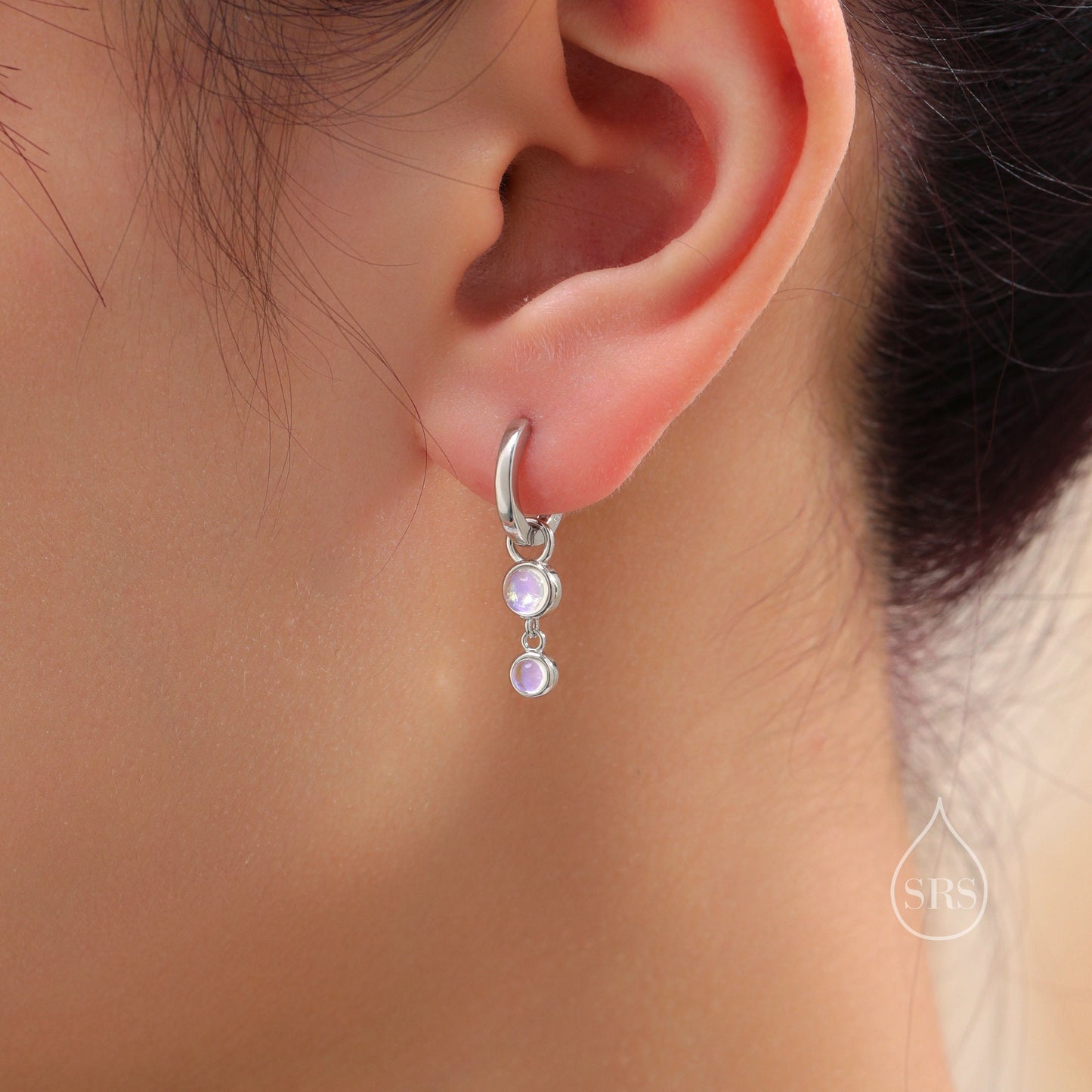 Double Moonstone Dangle Huggie Hoop Earrings in Sterling Silver, Simulated Moonstone Hoops, Silver or Gold