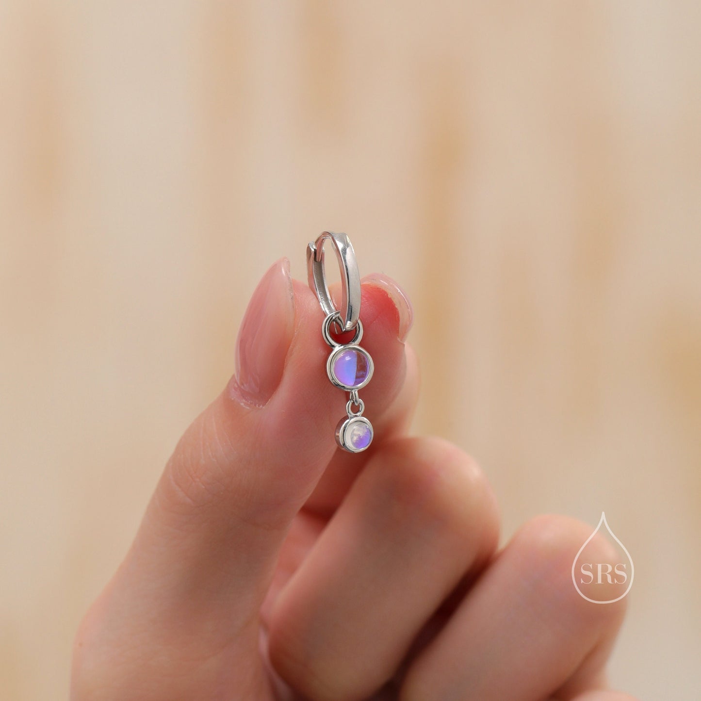 Double Moonstone Dangle Huggie Hoop Earrings in Sterling Silver, Simulated Moonstone Hoops, Silver or Gold, Detachable Charms