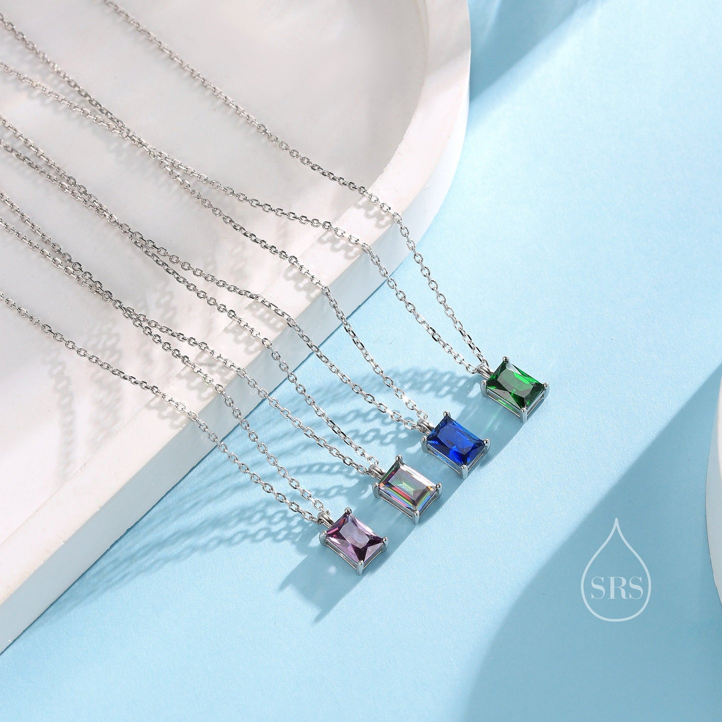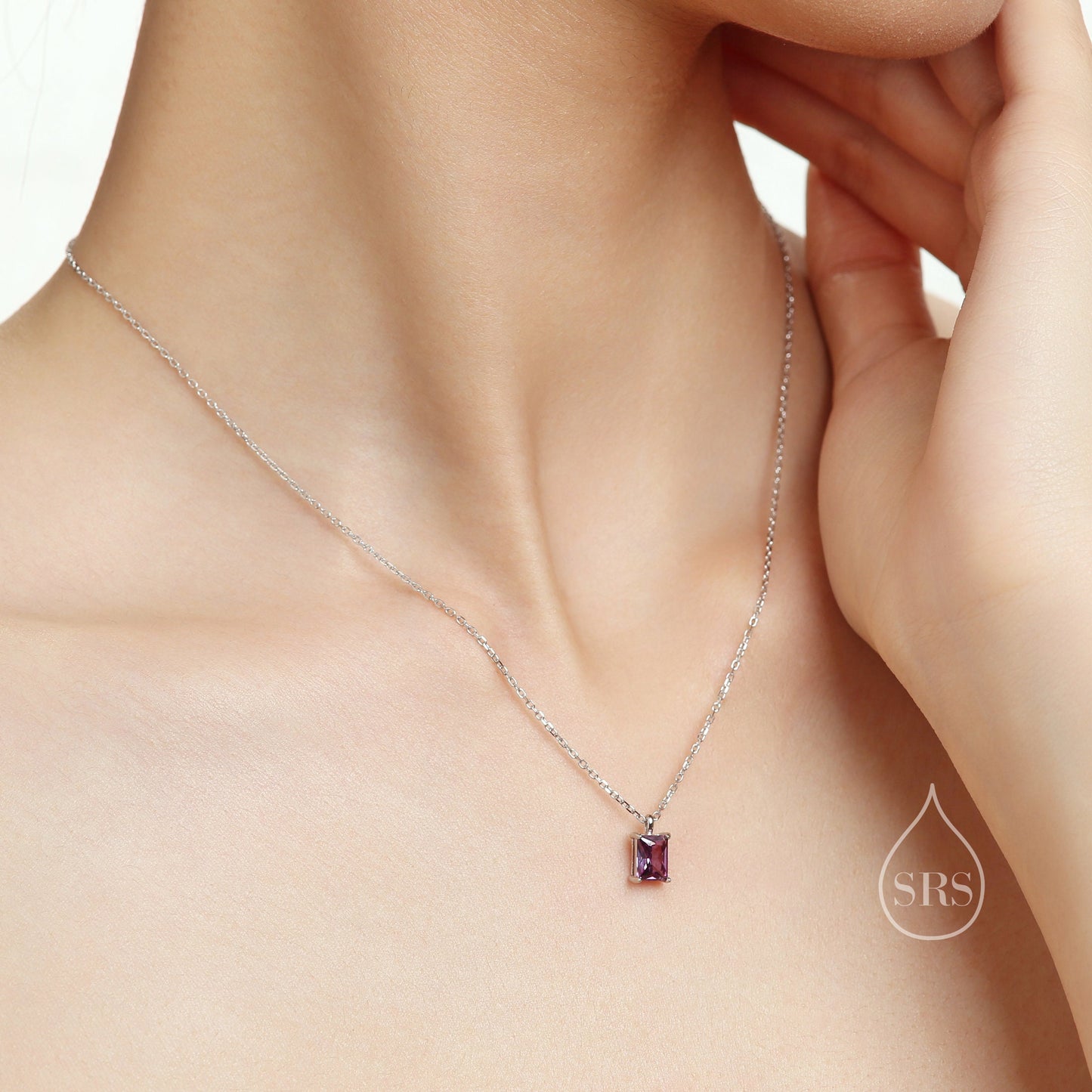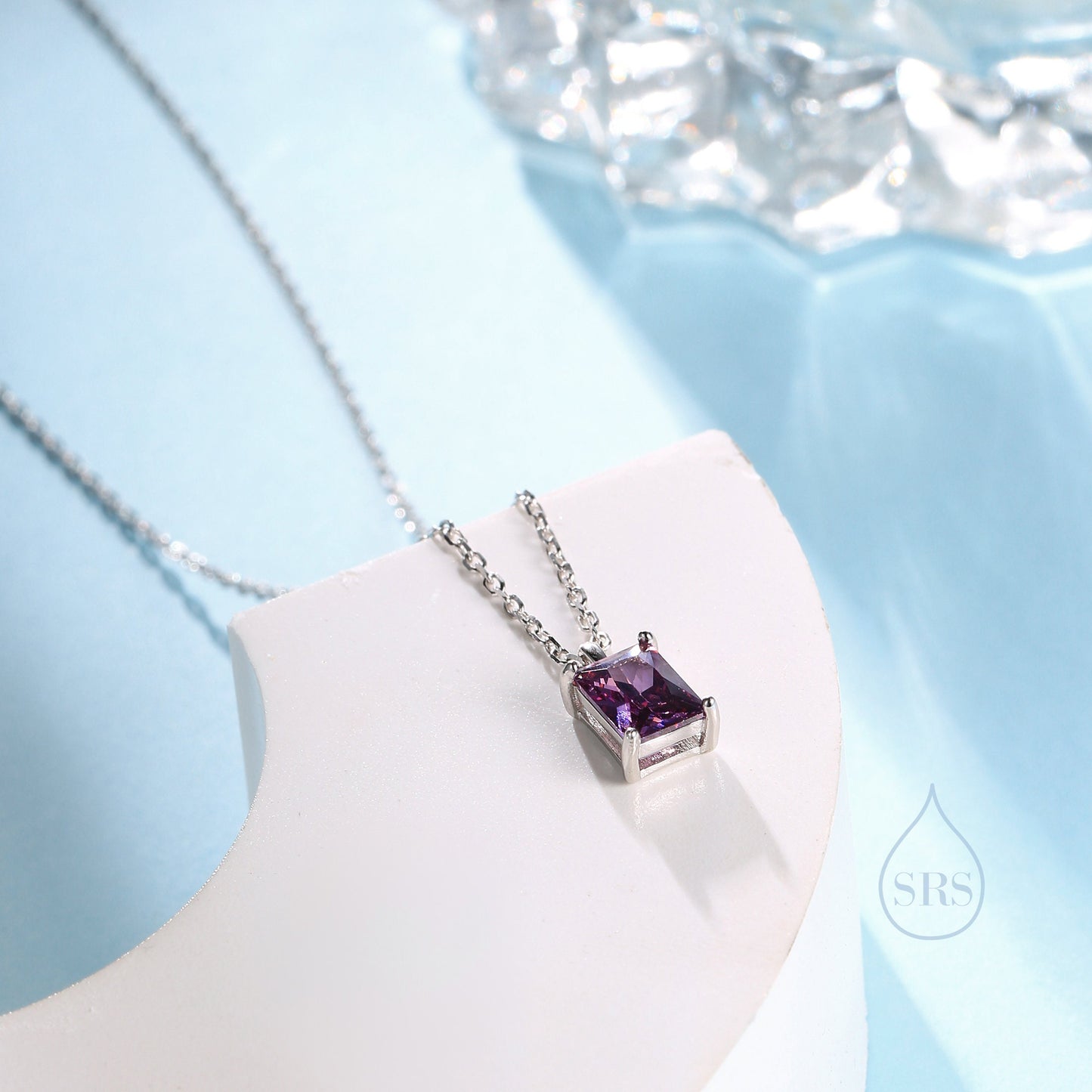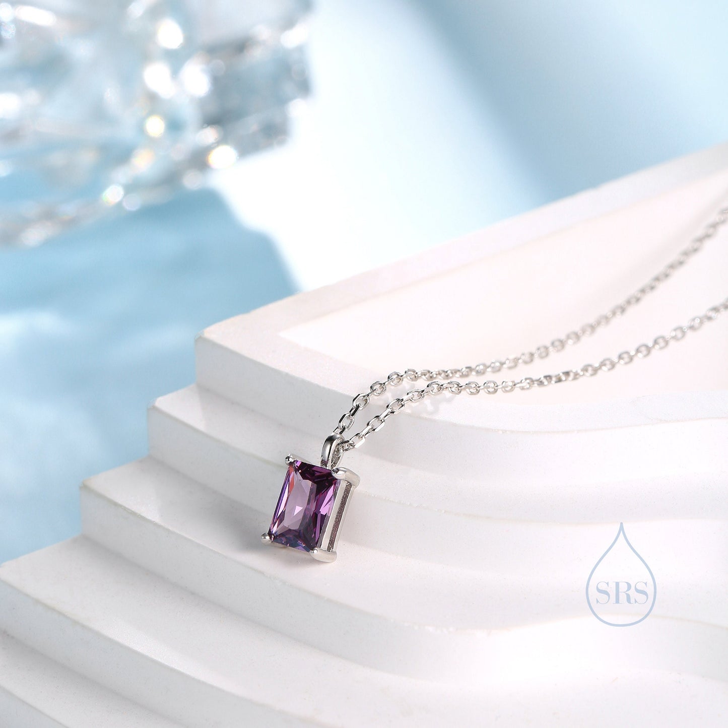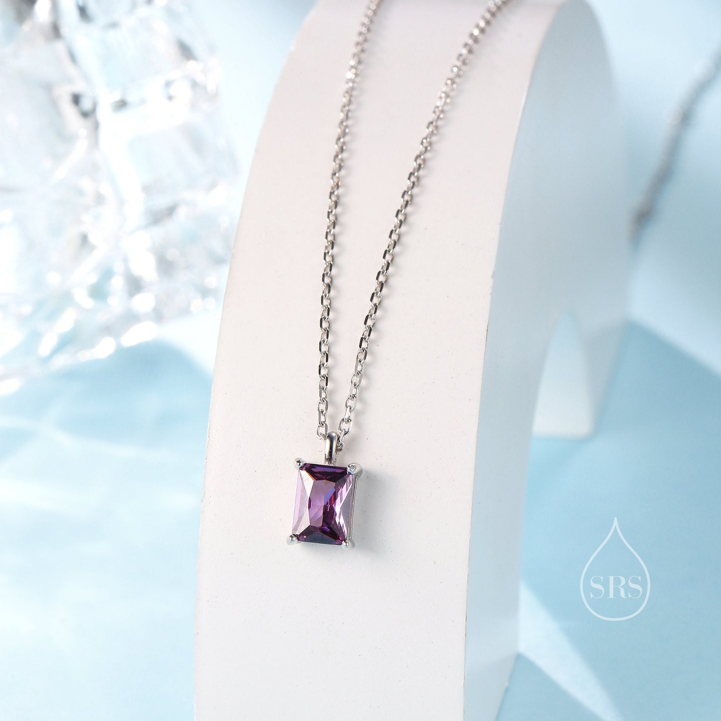 Emerald Cut Amethyst Purple CZ Pendant Necklace in Sterling Silver, Rectangular Cut Crystal Earrings, Purple CZ Necklace