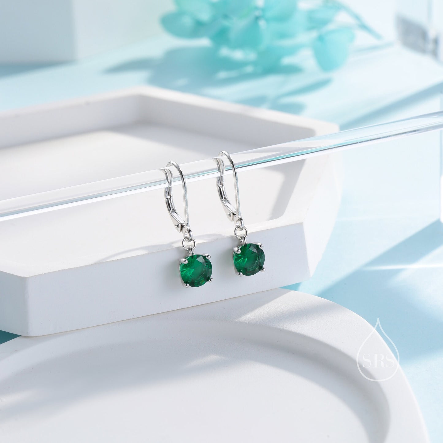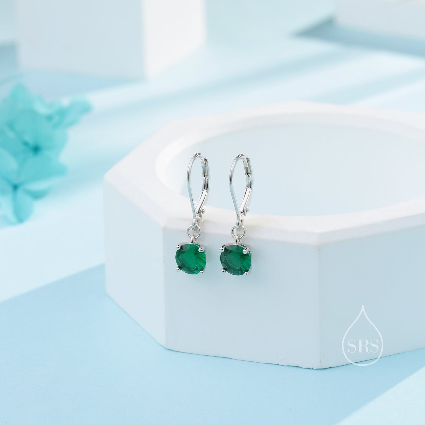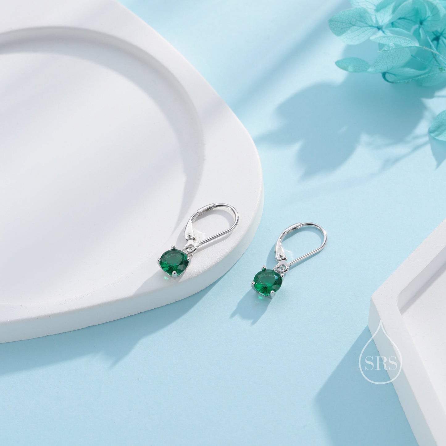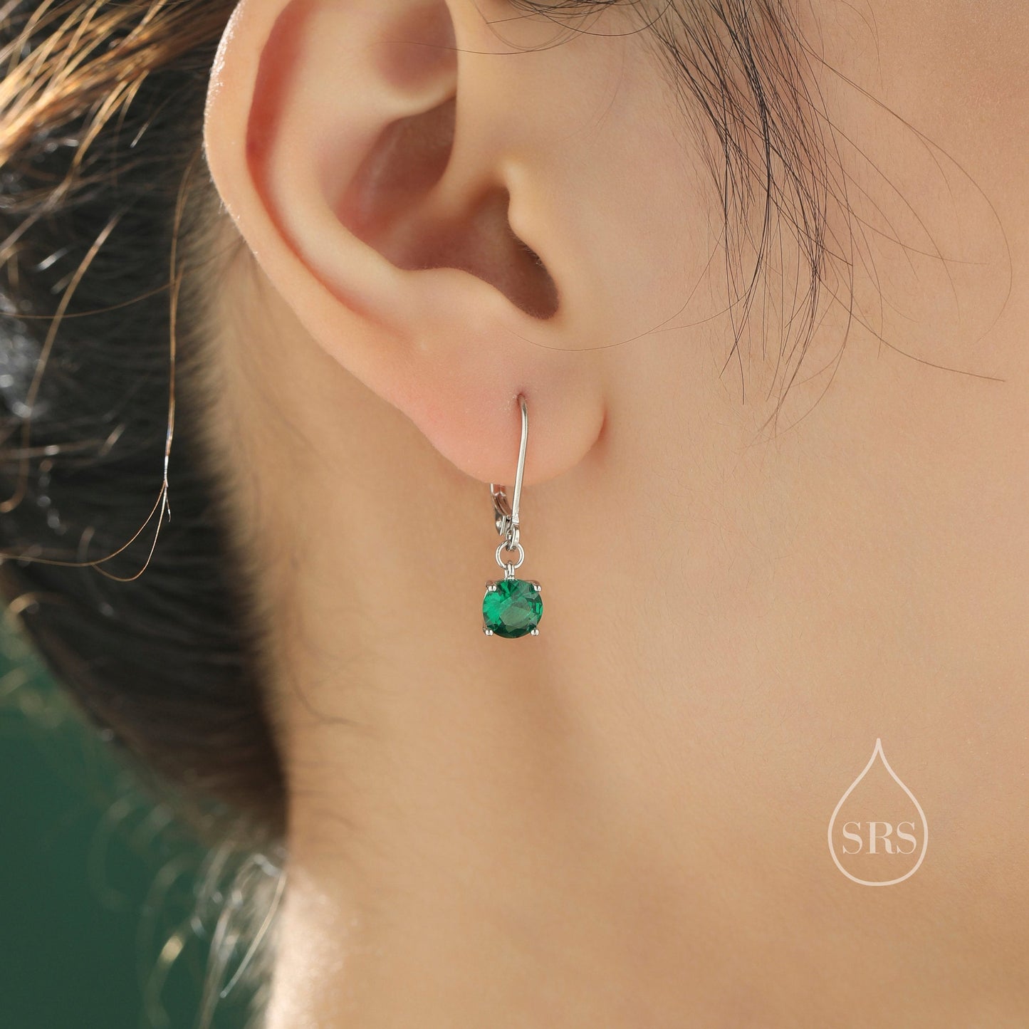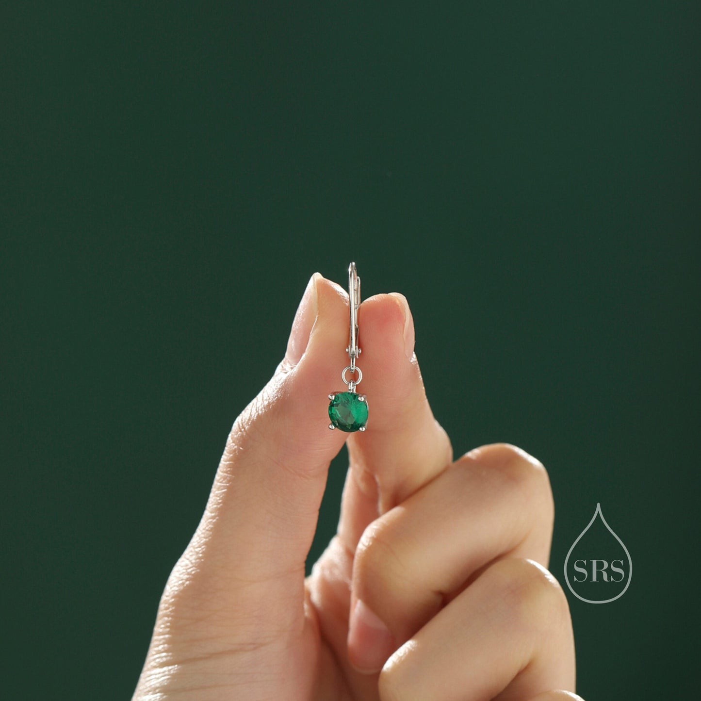 Emerald Green CZ Lever Back Hoop in Sterling Silver, 2 Sizes Available, 6mm or 6.5mm, Minimalist Simple Crystal Leverback Hoop Earrings