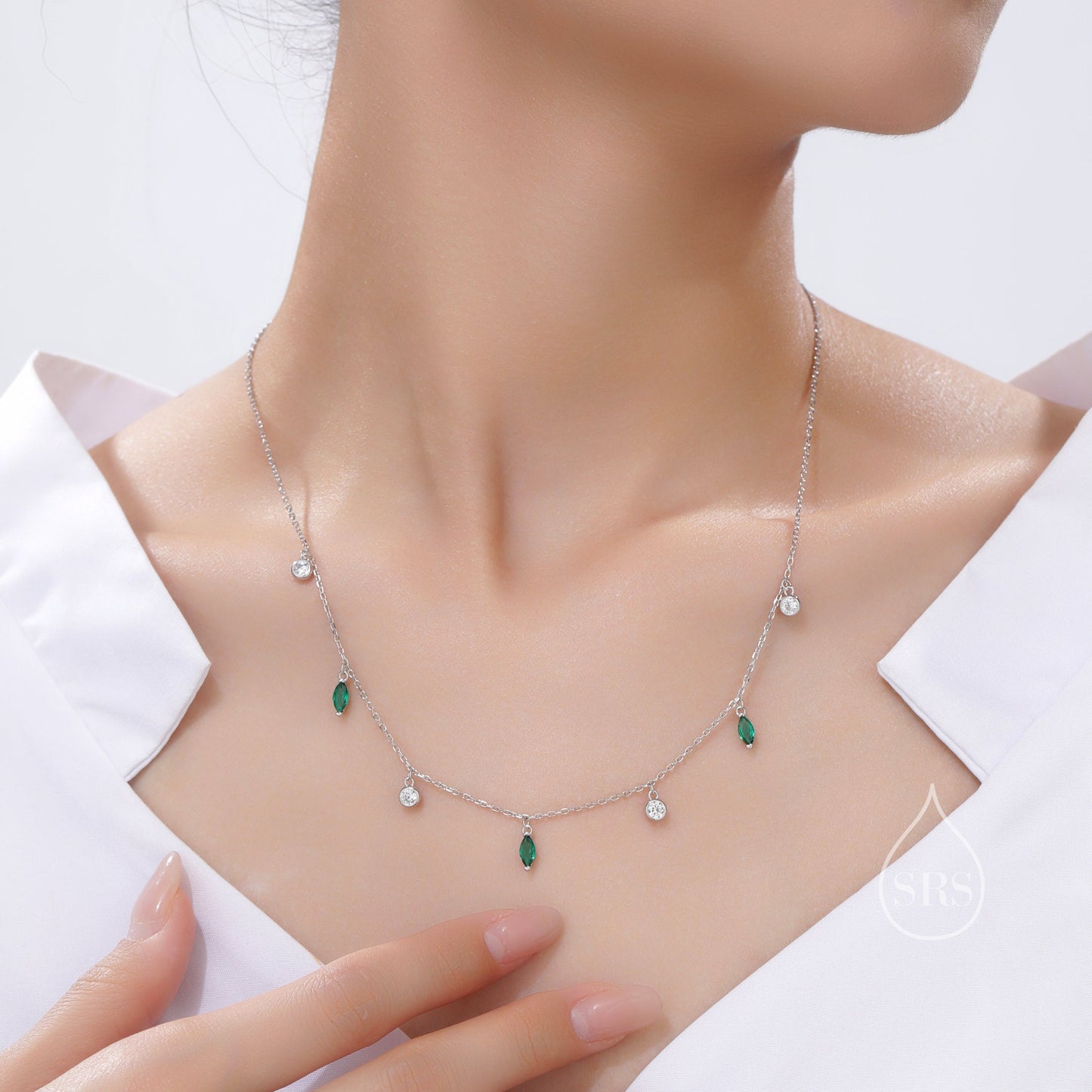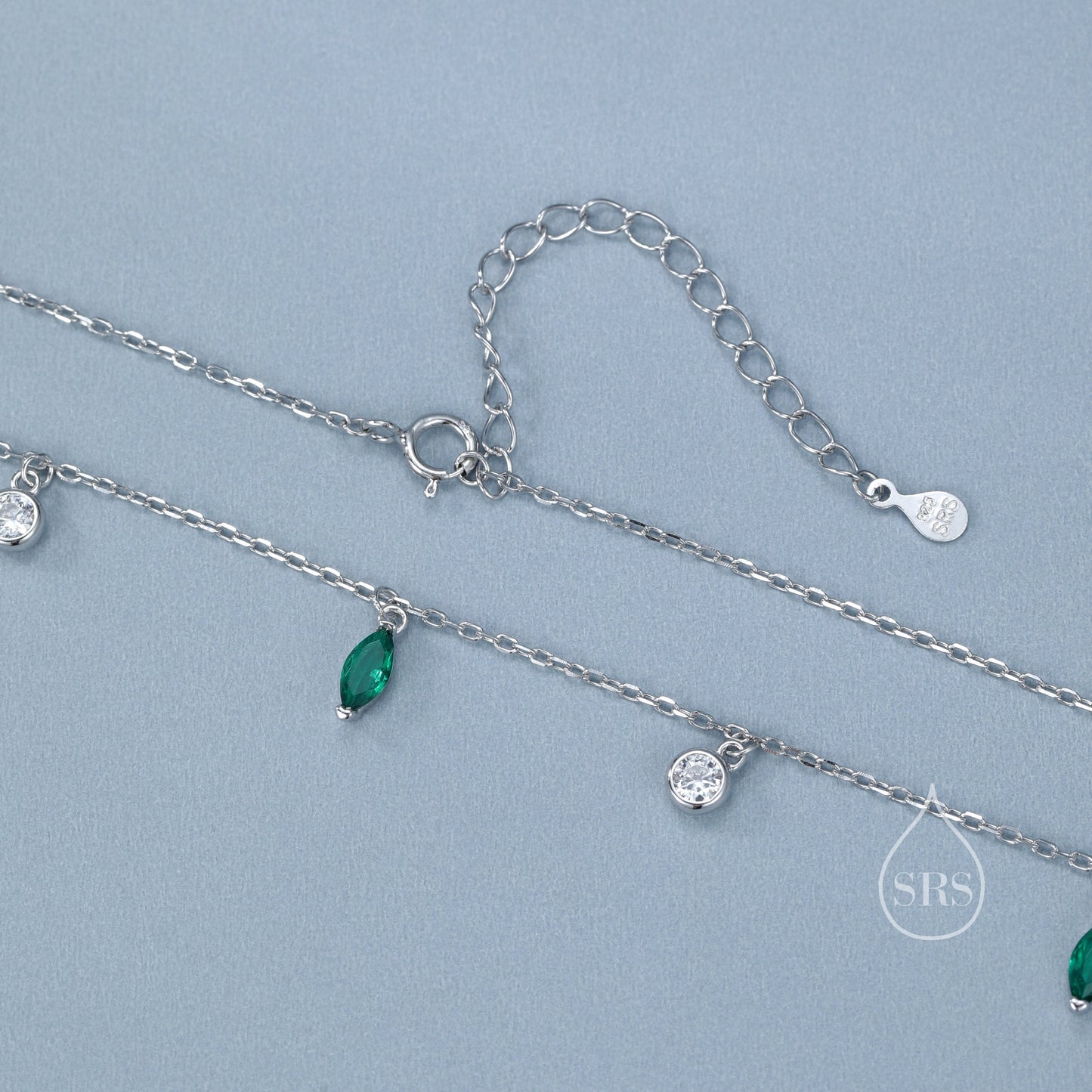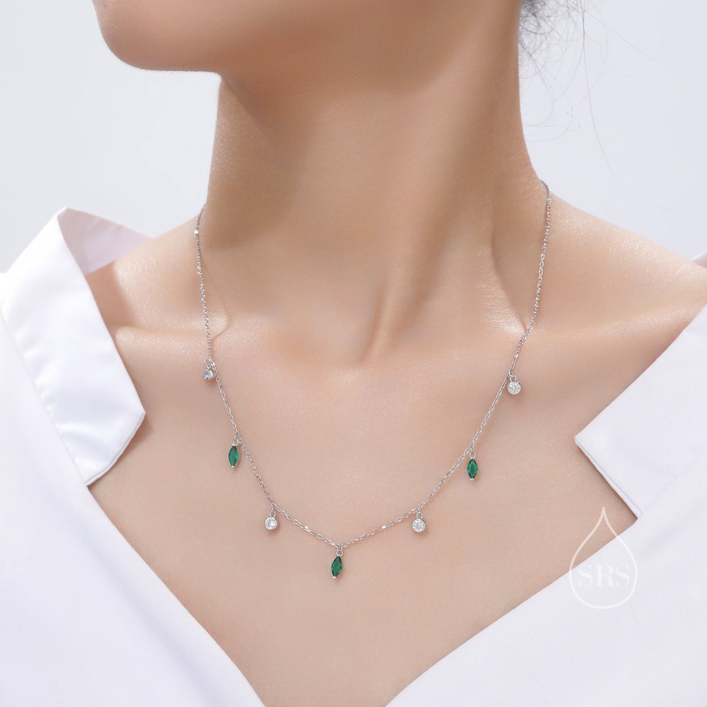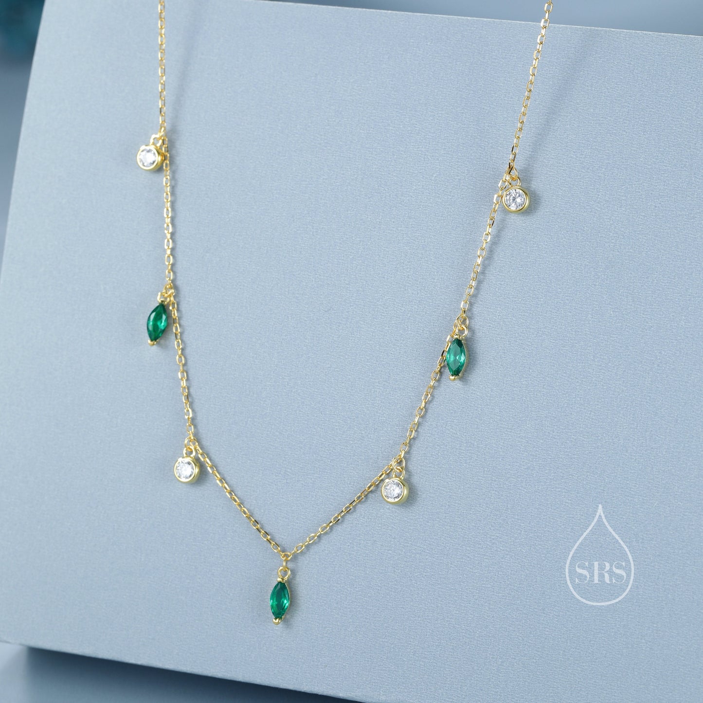 Emerald Green Marquise CZ Dangle Necklace in Sterling Silver, Silver or Gold, Satellite Crystal Necklace, Solid Silver Motif Necklace