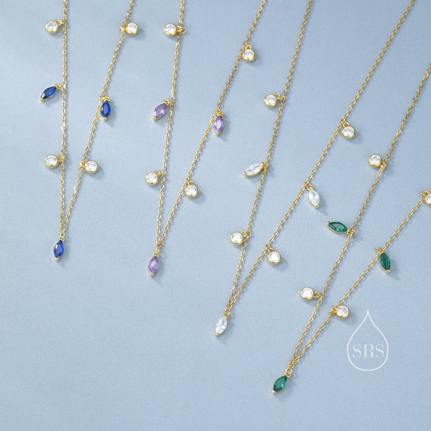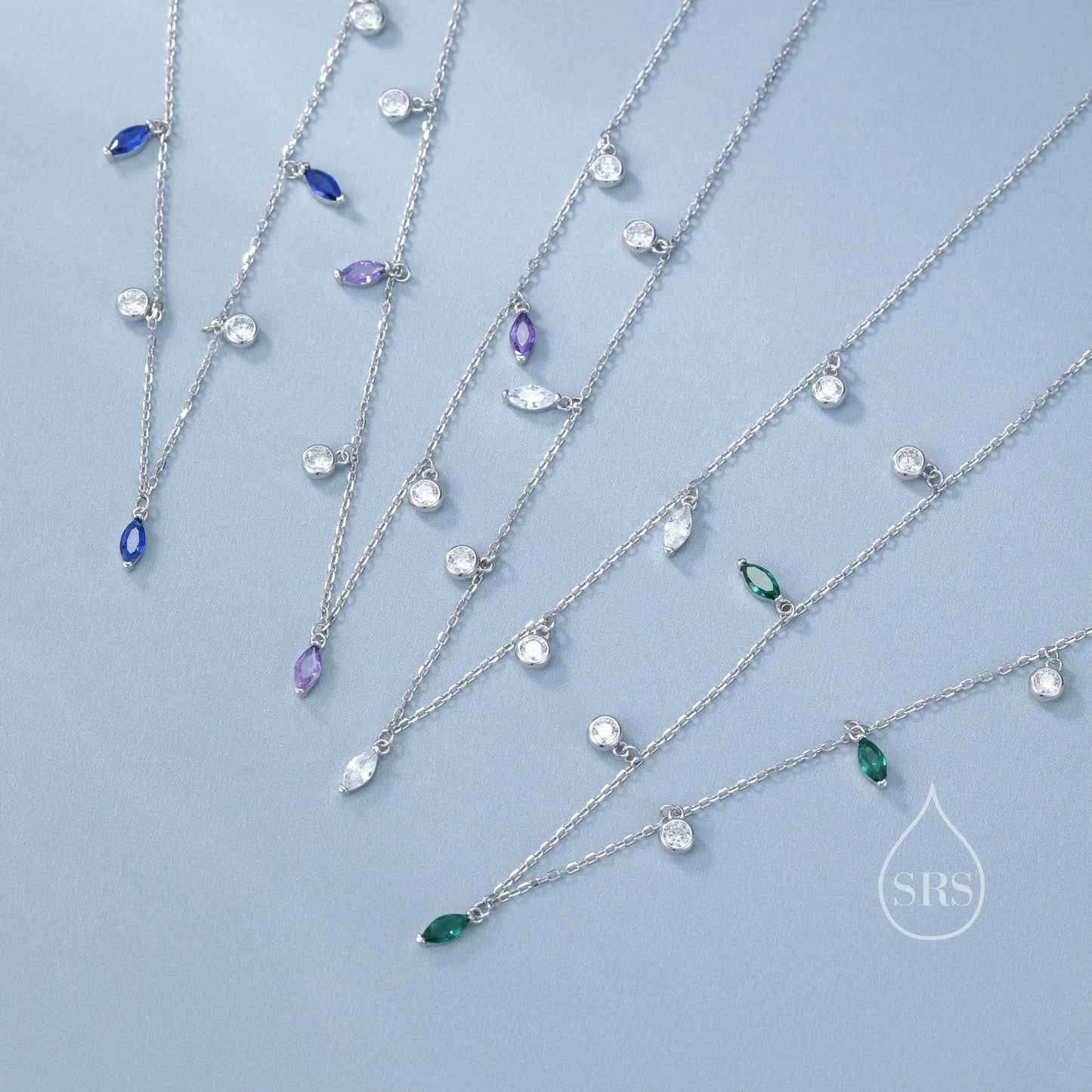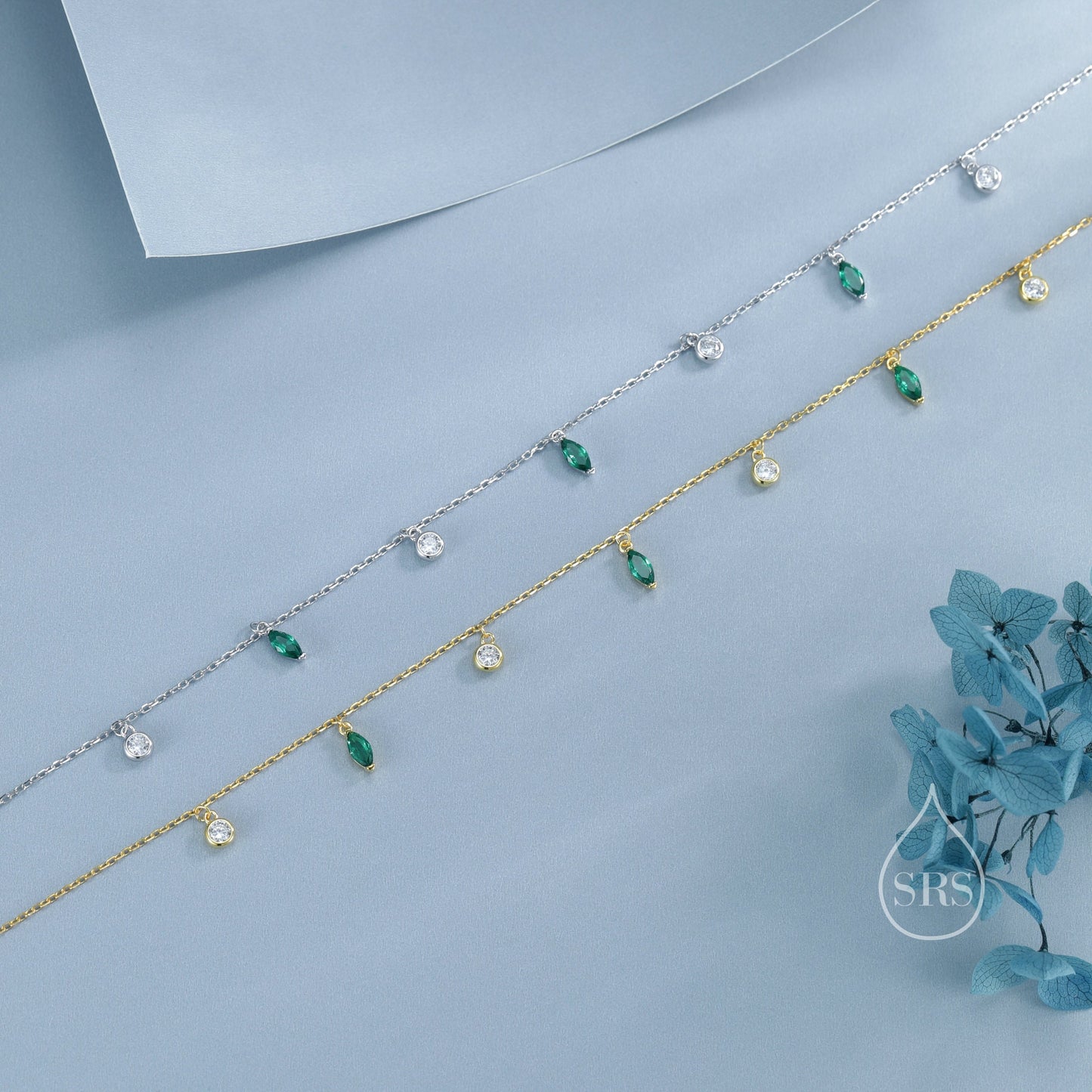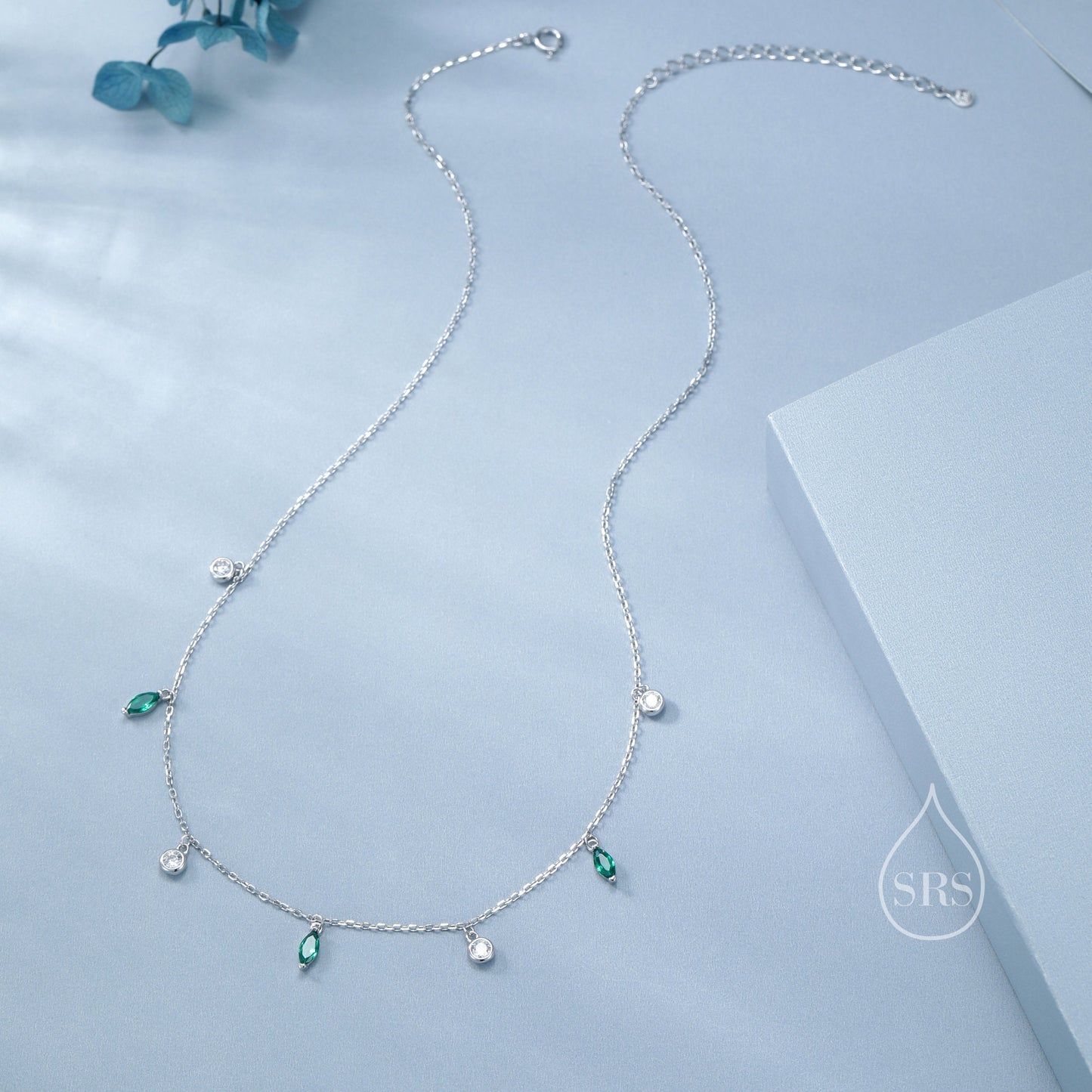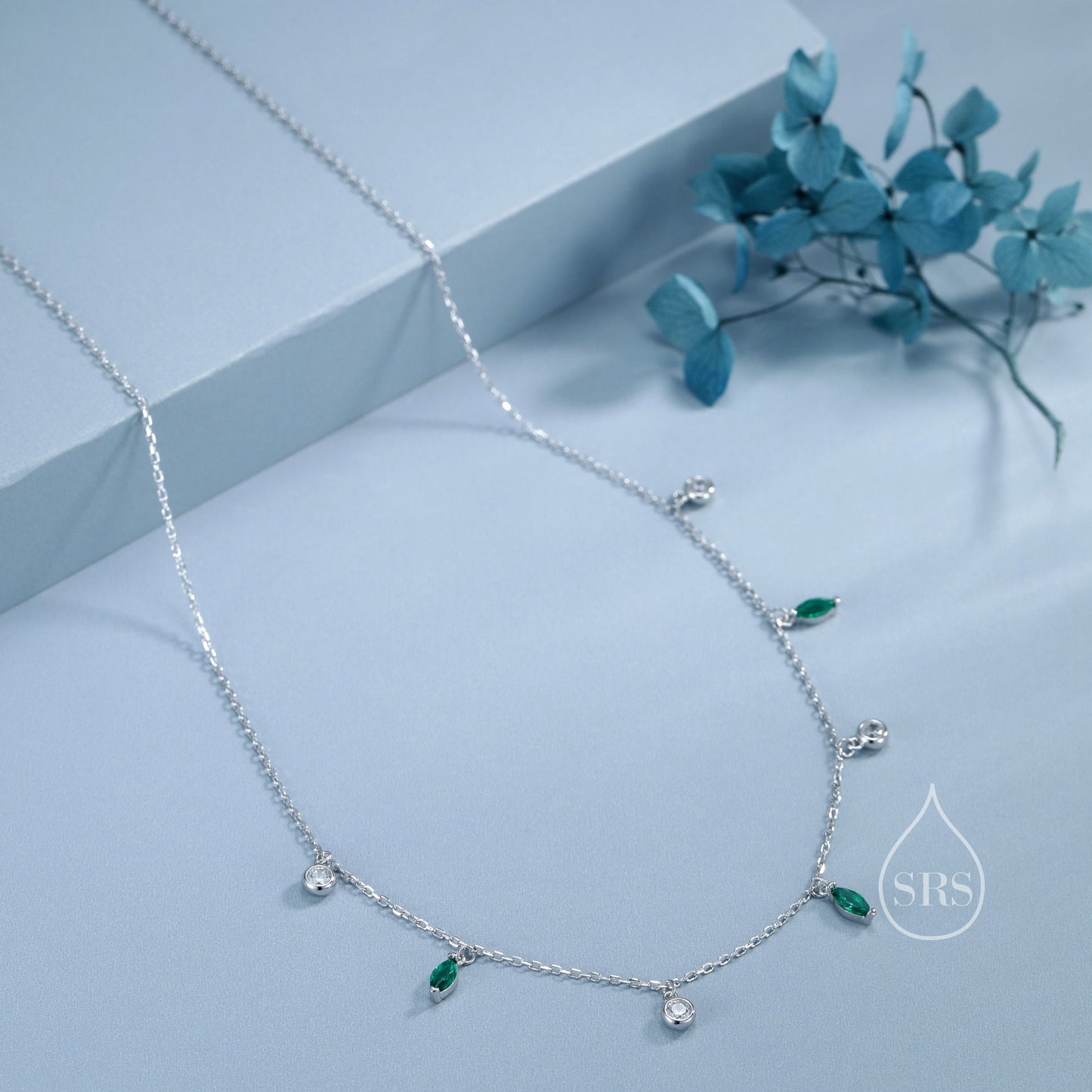 Emerald Green Marquise CZ Dangle Necklace in Sterling Silver, Silver or Gold, Satellite Crystal Necklace, Solid Silver Motif Necklace
