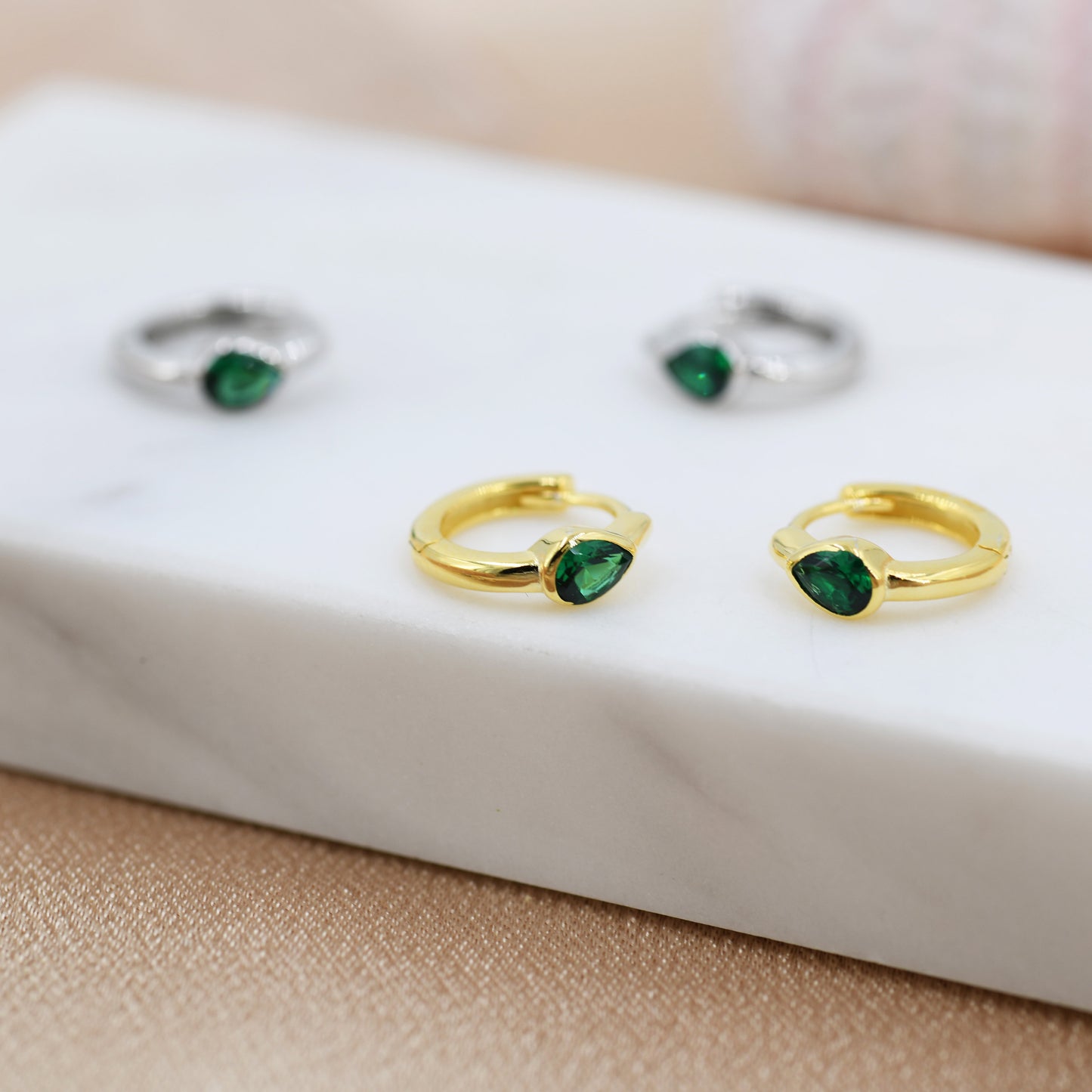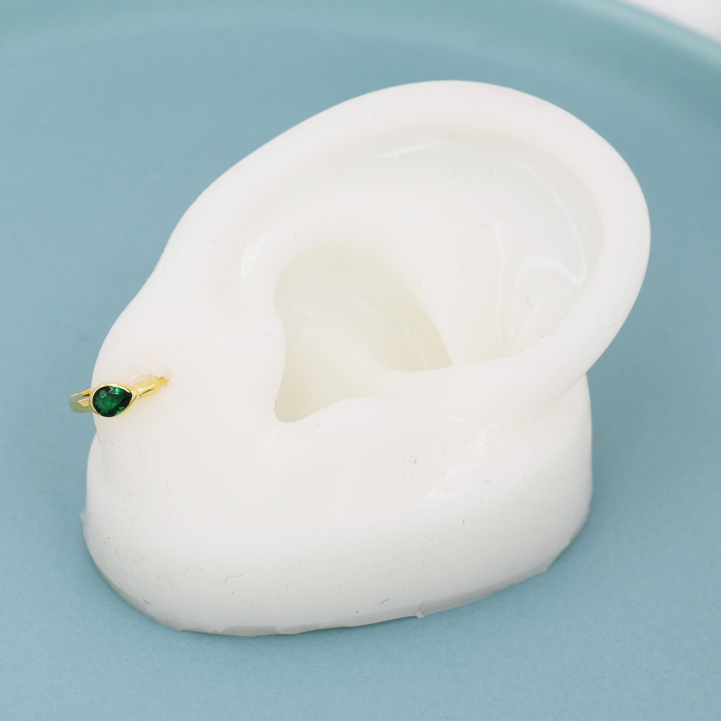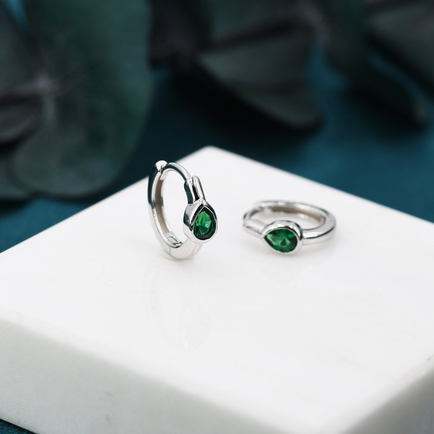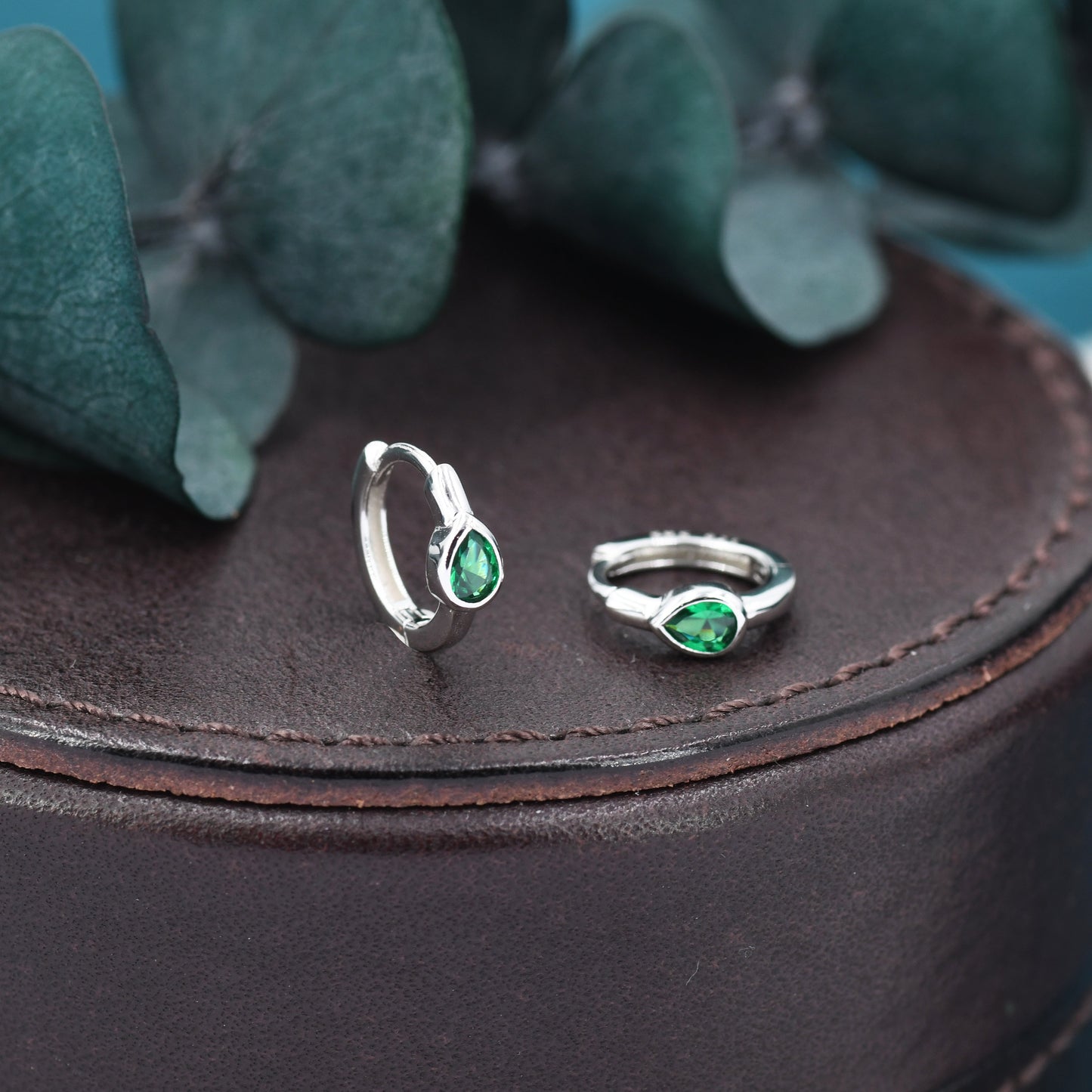 Emerald Green Single Pear Cut CZ Huggie Hoop in Sterling Silver, Silver or Gold, Minimalist Simple Green Hoop Earrings, Dainty Green Hoops