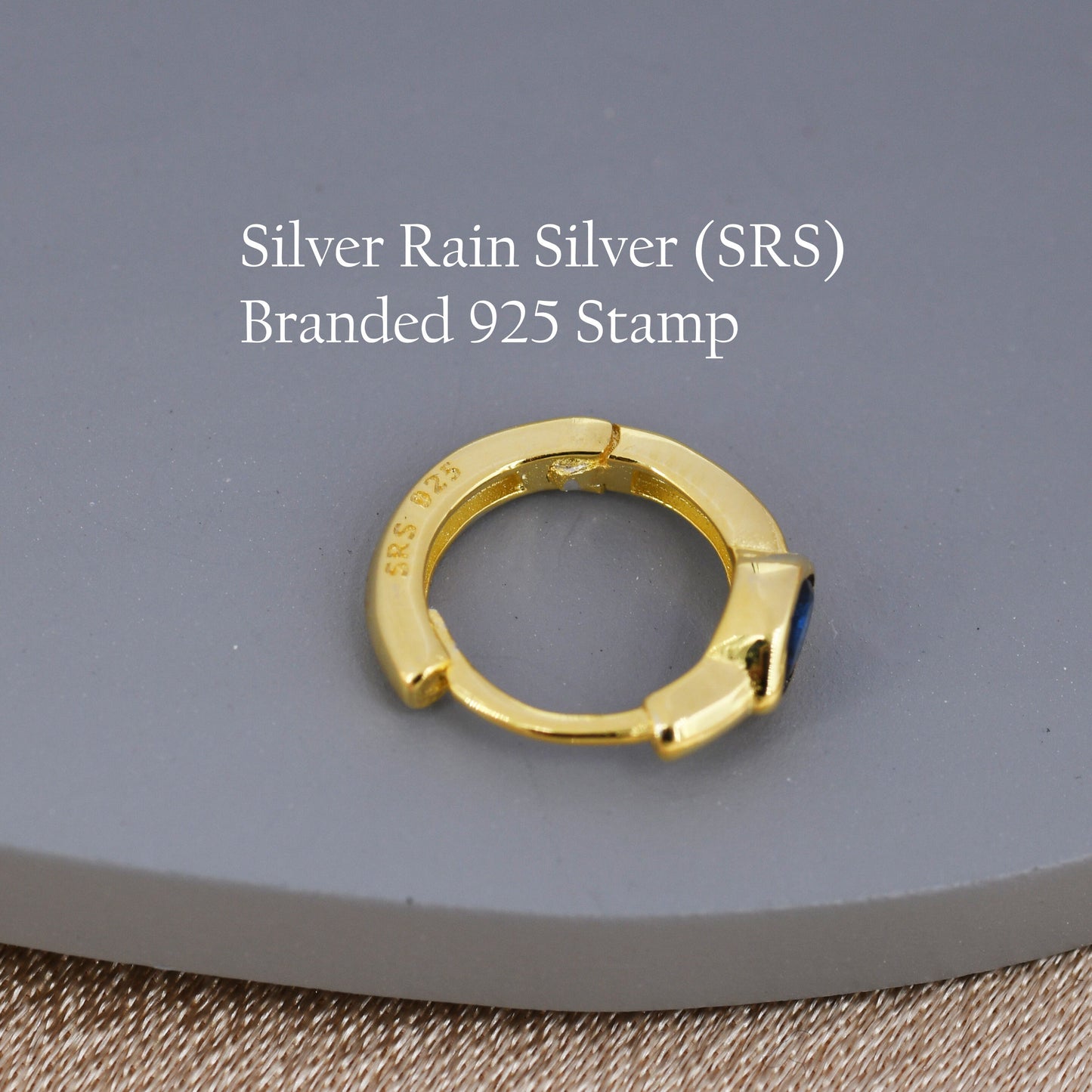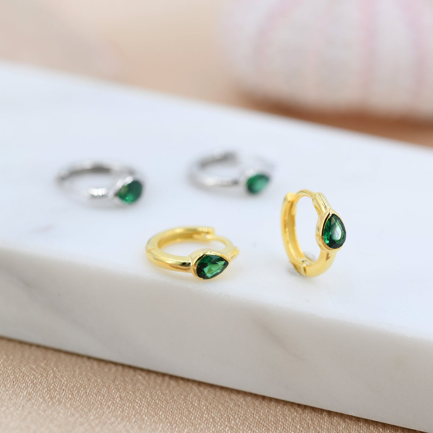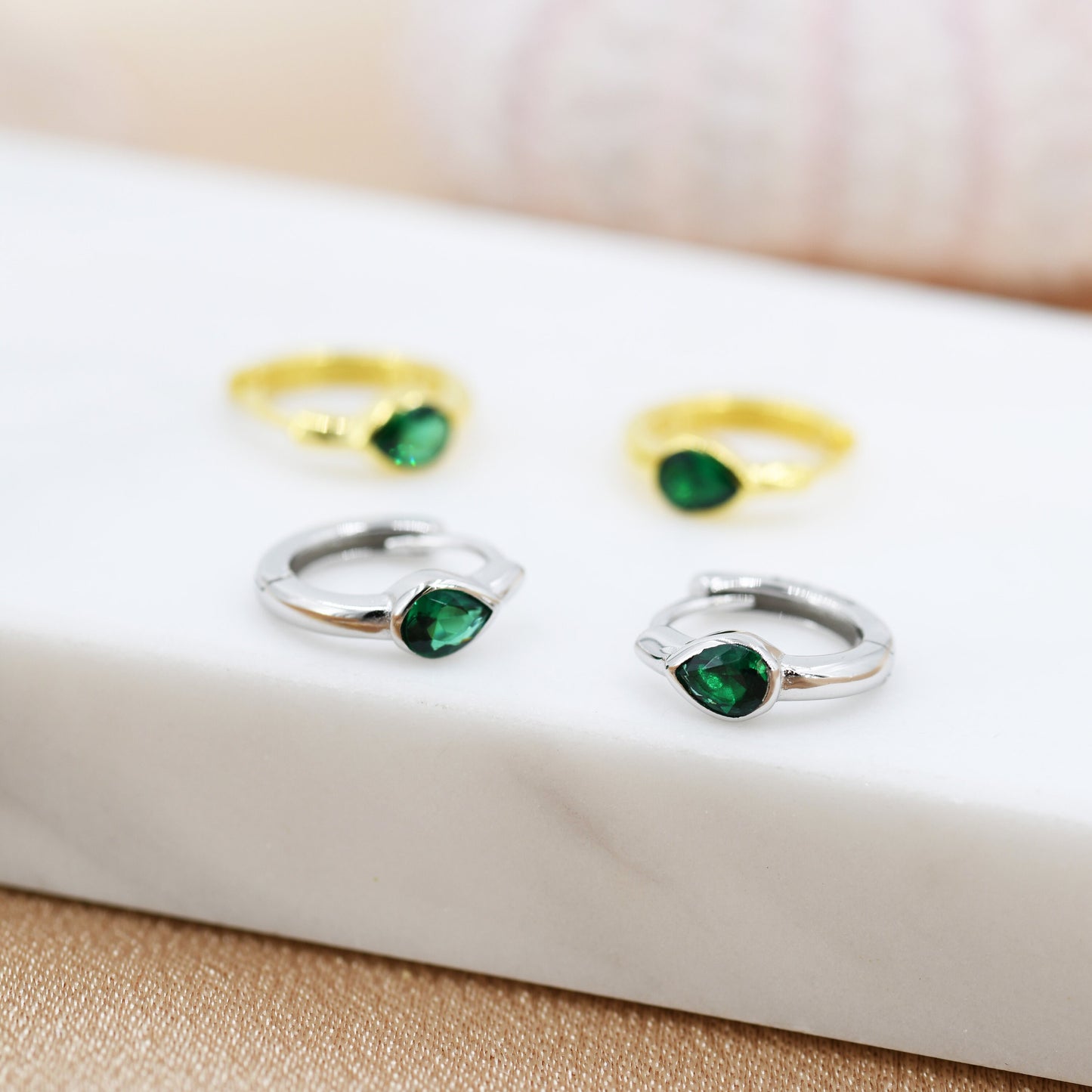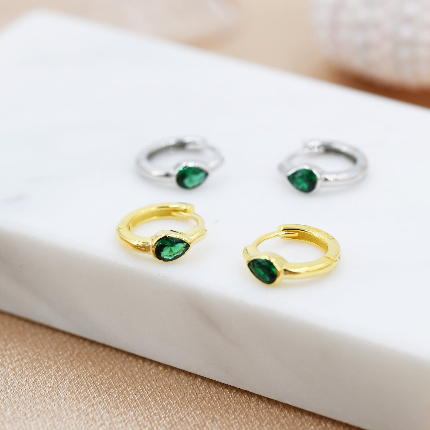 Emerald Green Single Pear Cut CZ Huggie Hoop in Sterling Silver, Silver or Gold, Minimalist Simple Green Hoop Earrings, Dainty Green Hoops