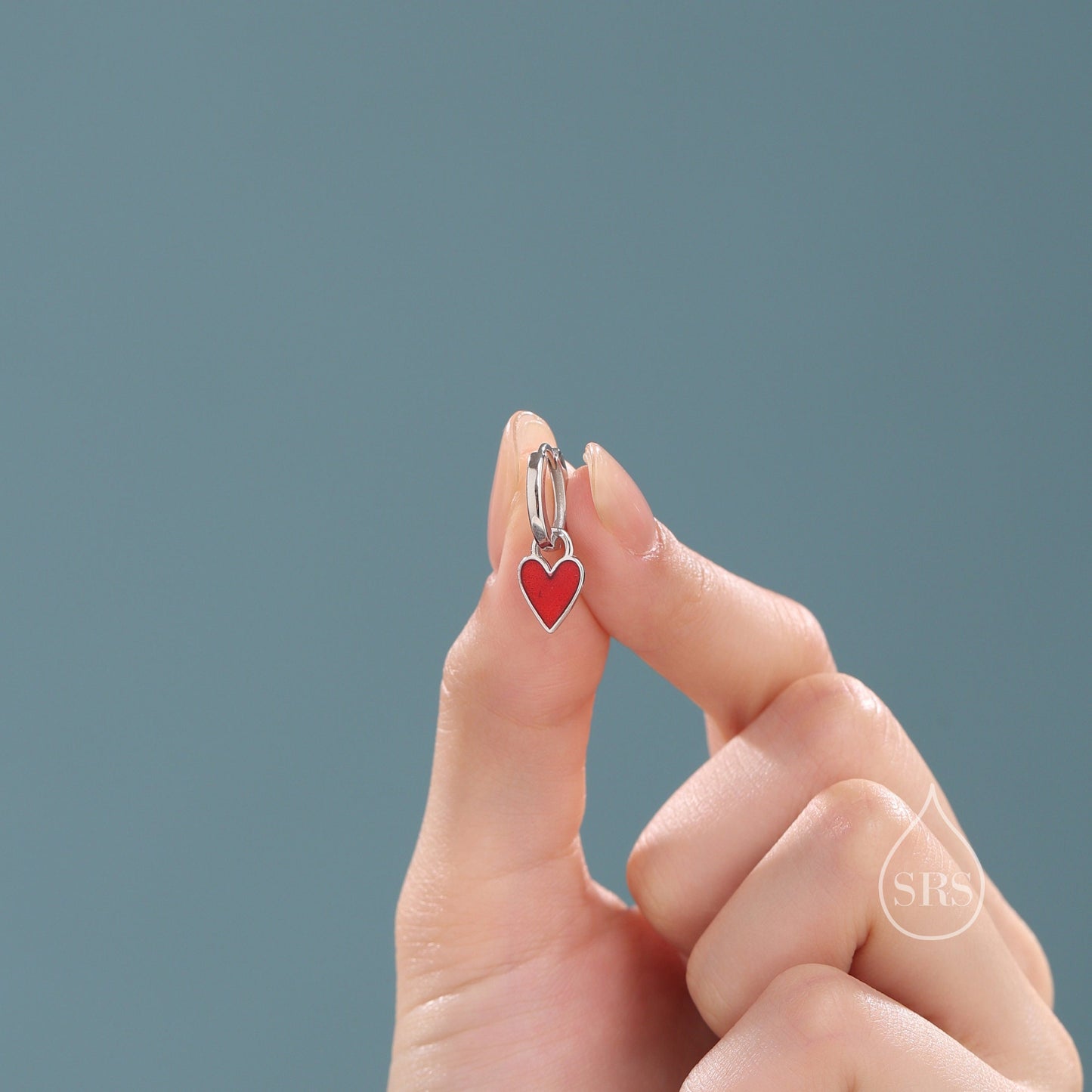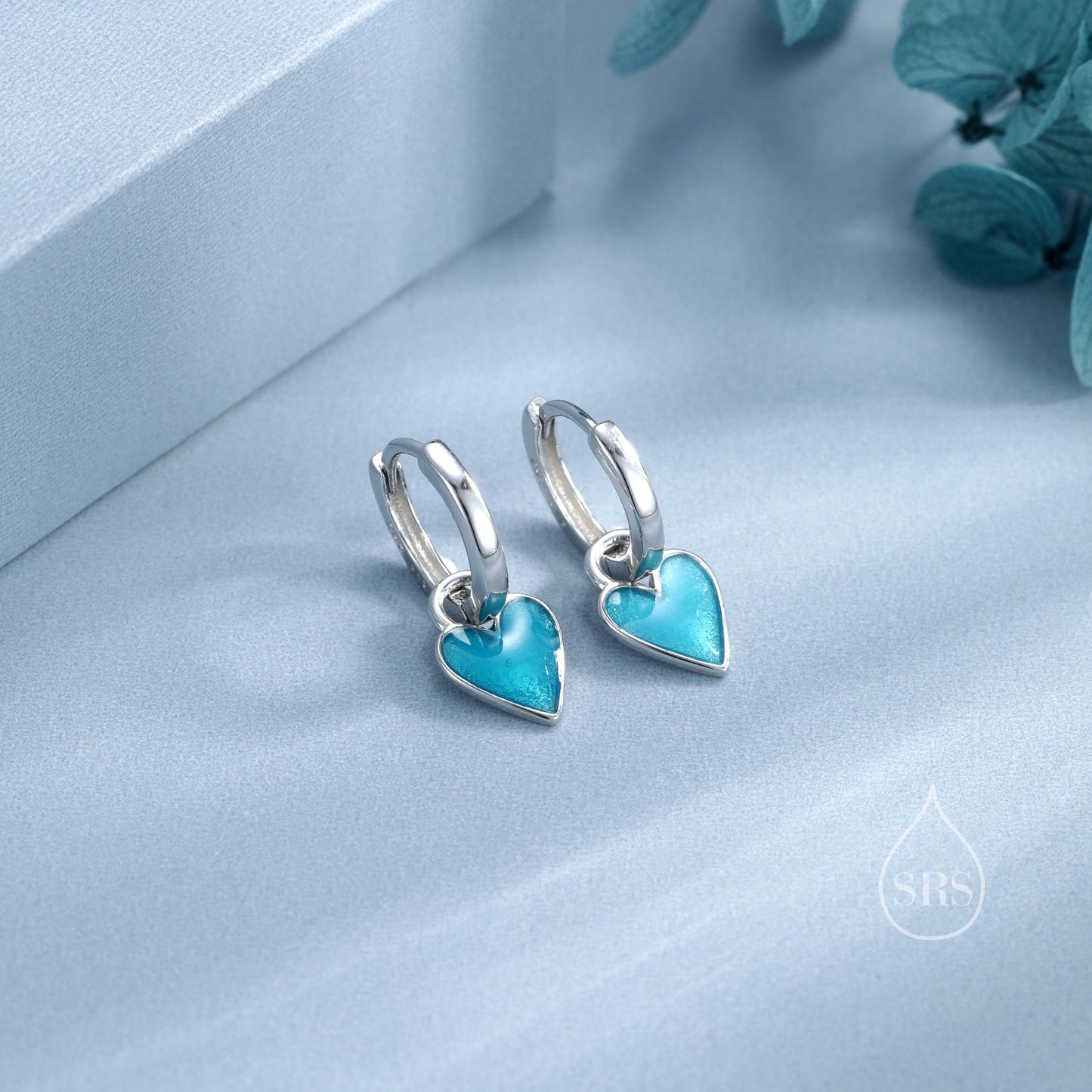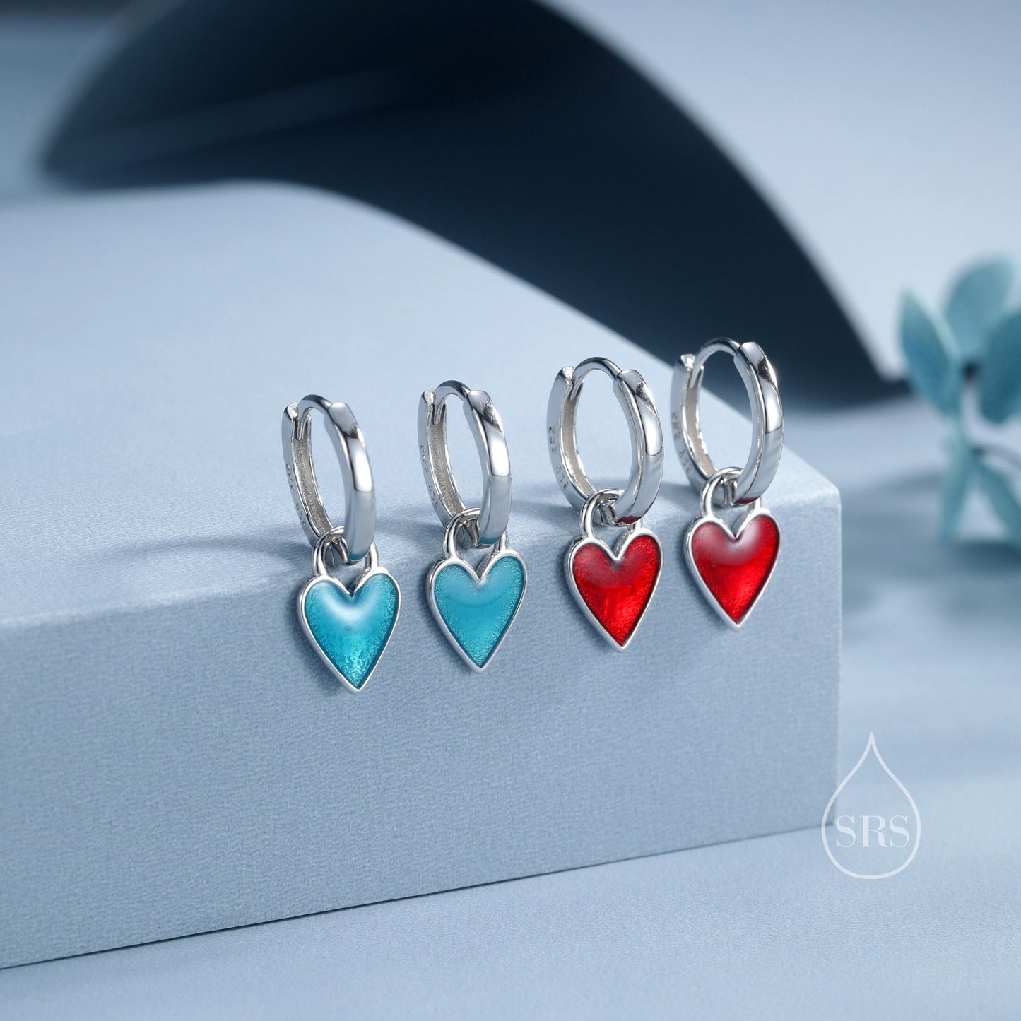 Enamel Glaze Heart Earrings in Sterling Silver, Red or Blue, Detachable Heart Charm Dangle Hoop Earrings, Interchangeable