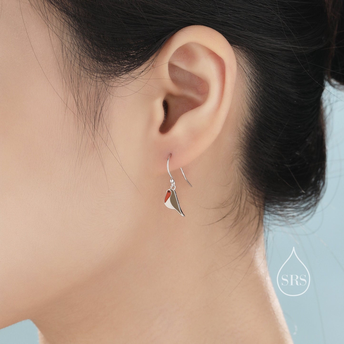 Enamel Robin Bird Drop Hook Earrings in Sterling Silver, Sterling Silver Enamel Robin Earrings, Nature Inspired