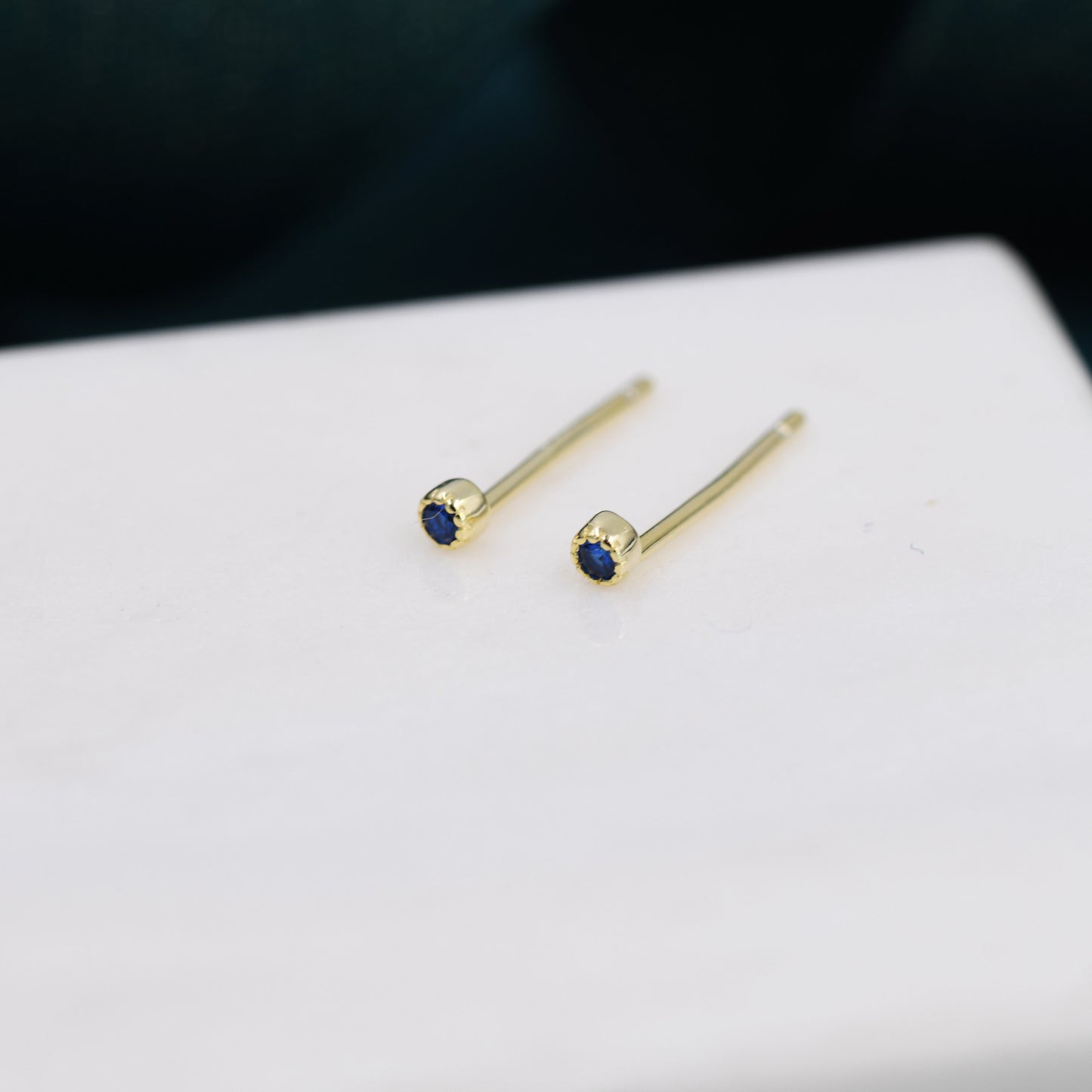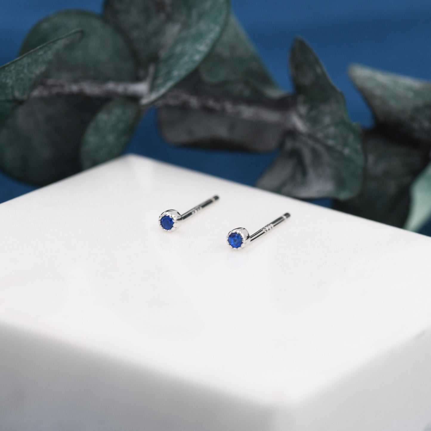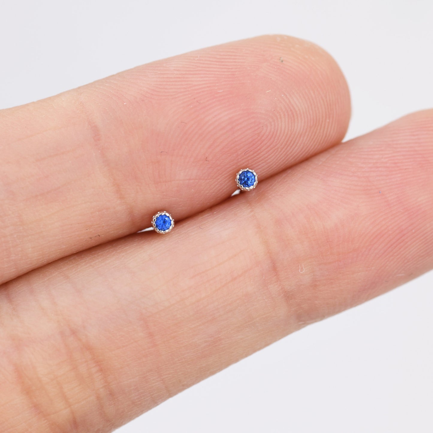 Extra Tiny 2mm Sapphire Blue CZ Stud Earrings in Sterling Silver, Barely Visible CZ Earrings, Stacking Earrings, Extra Small Stud Earrings