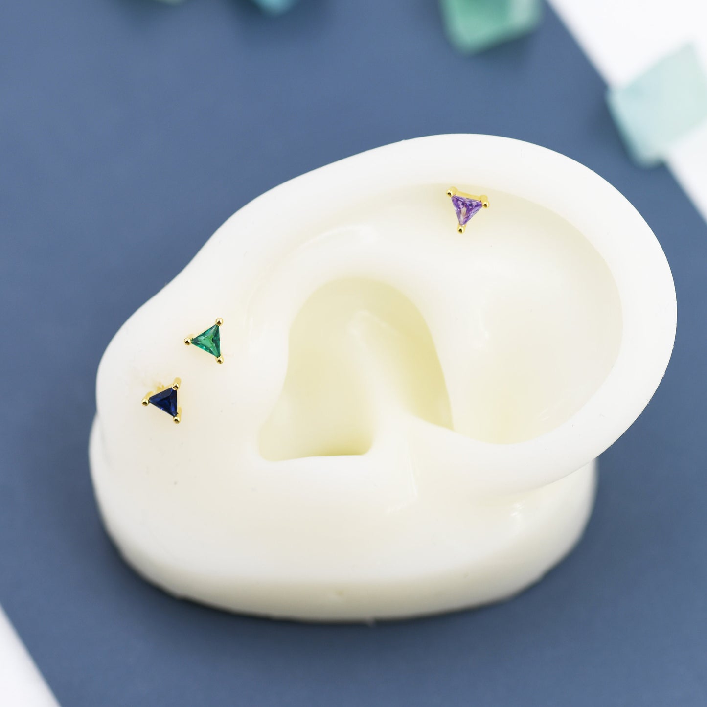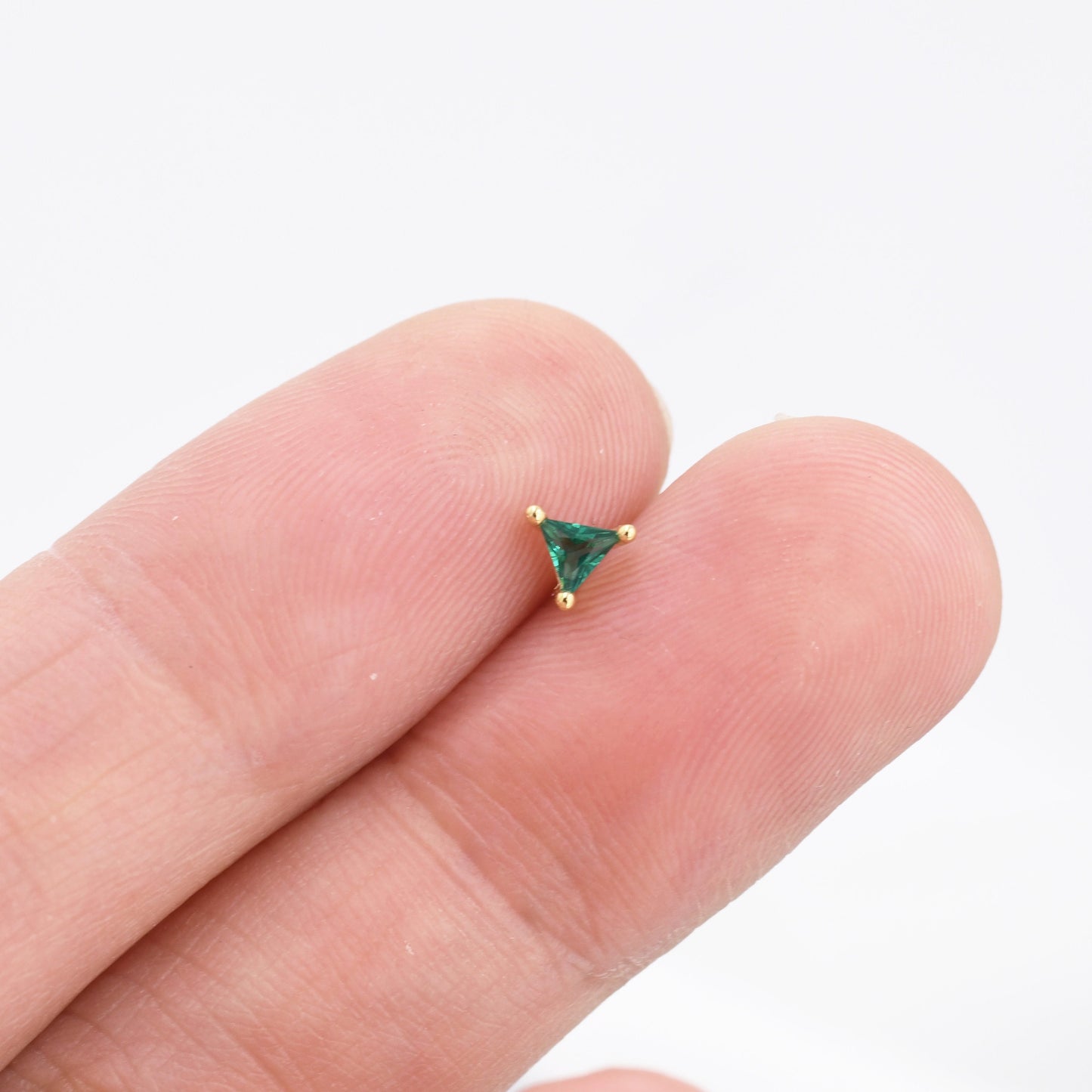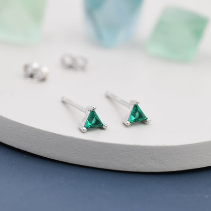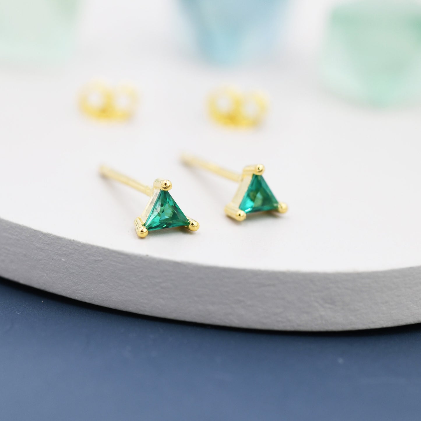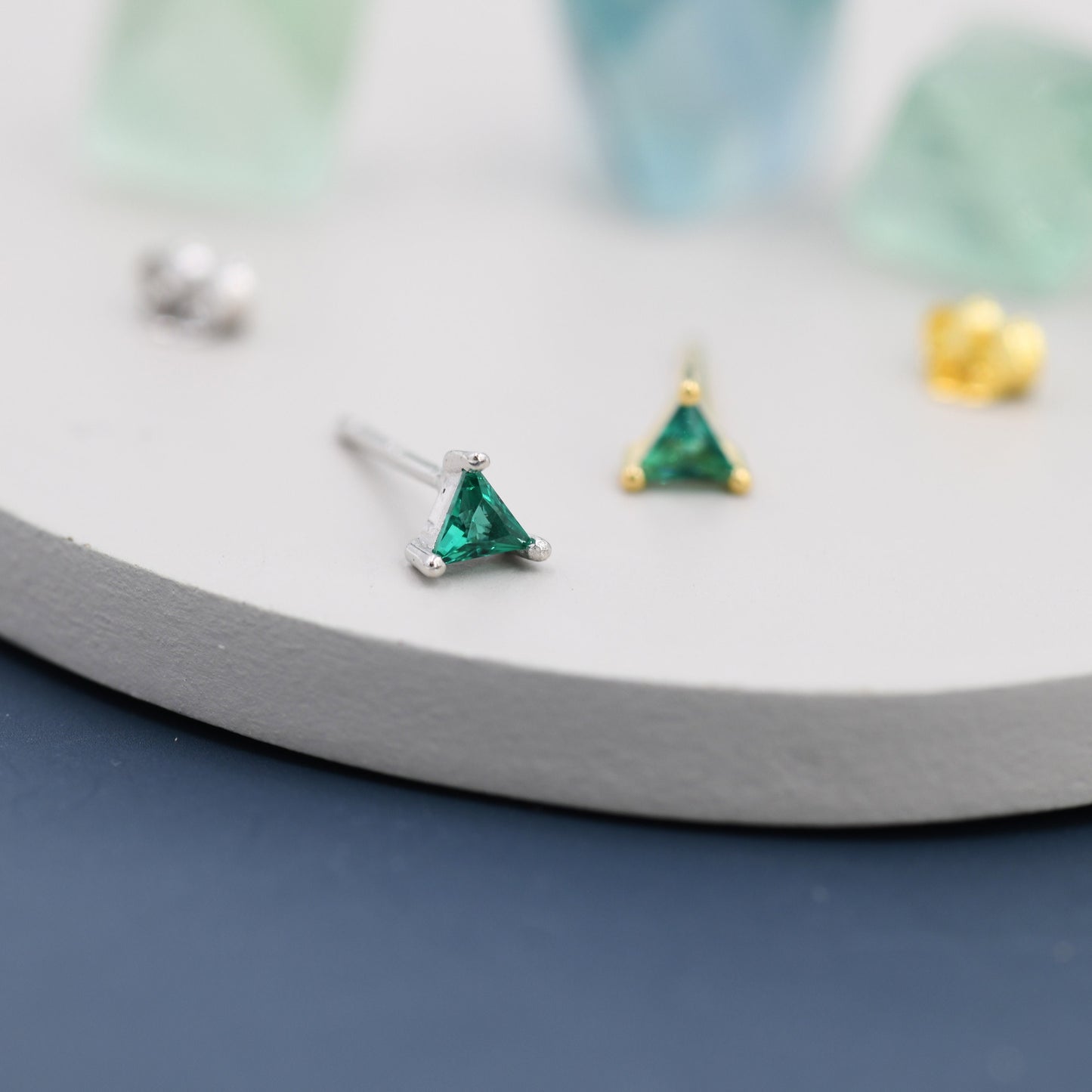 Extra Tiny Emerald Green CZ Triangle Stud Earrings in Sterling Silver, Silver or Gold, Dainty Earrings, Stacking Earrings, CZ Crystal Stud
