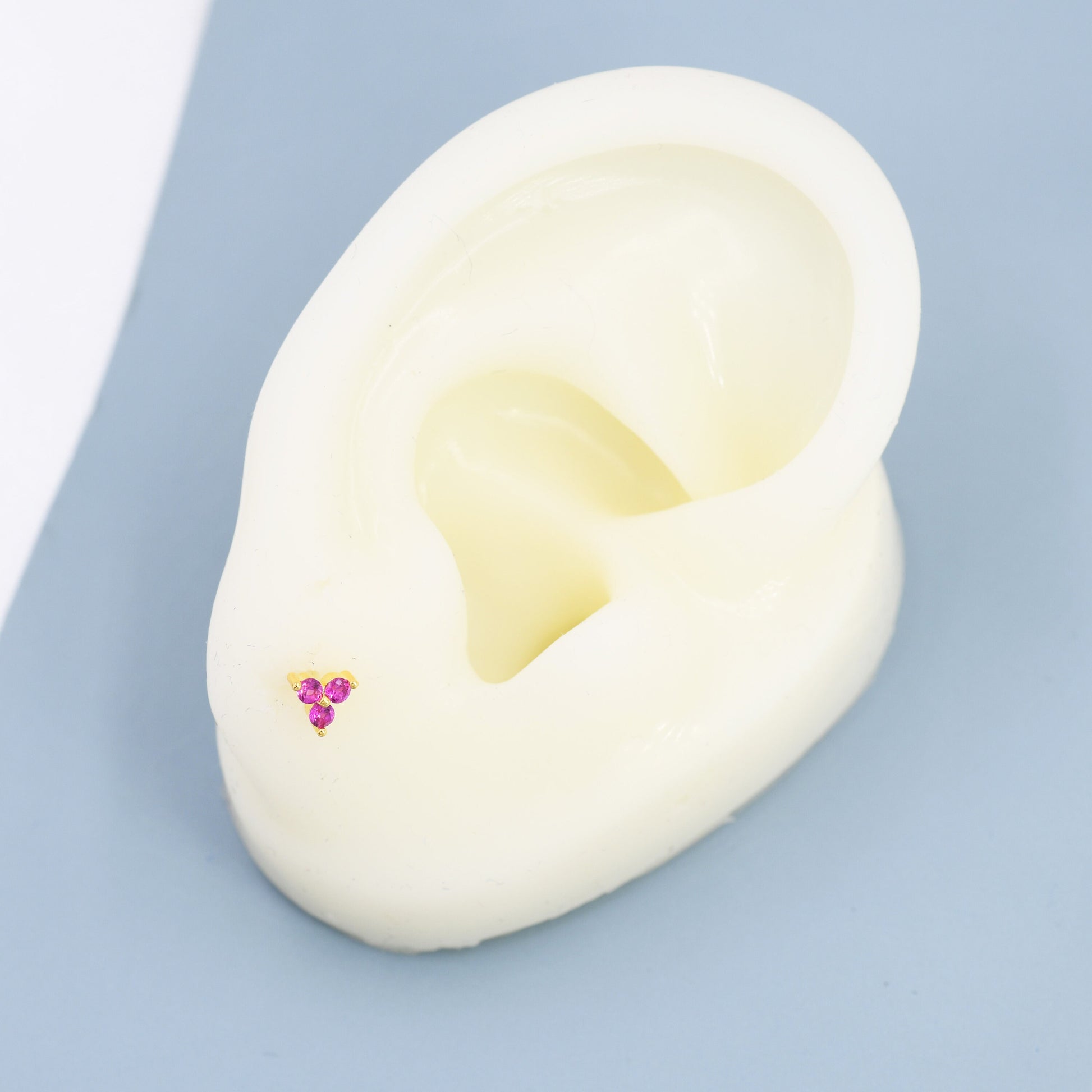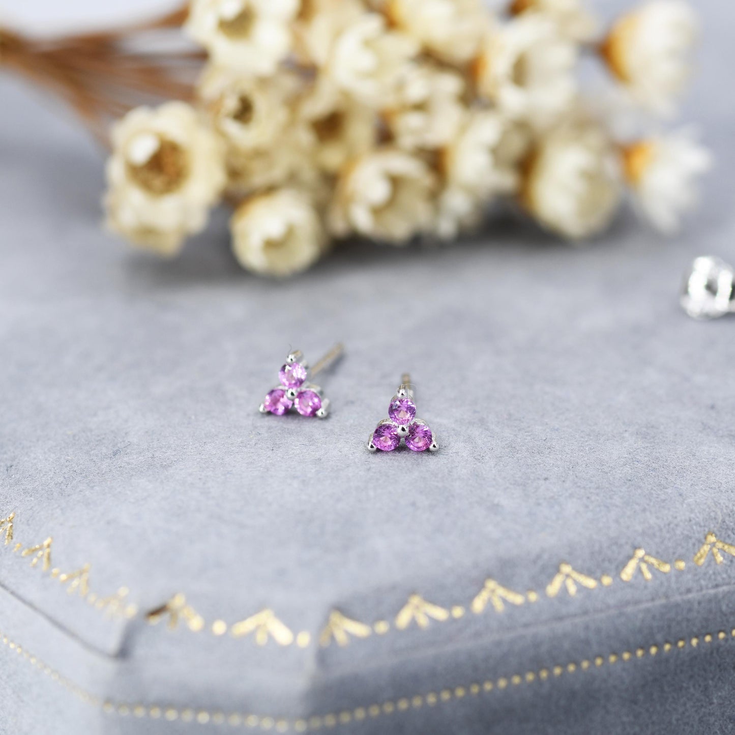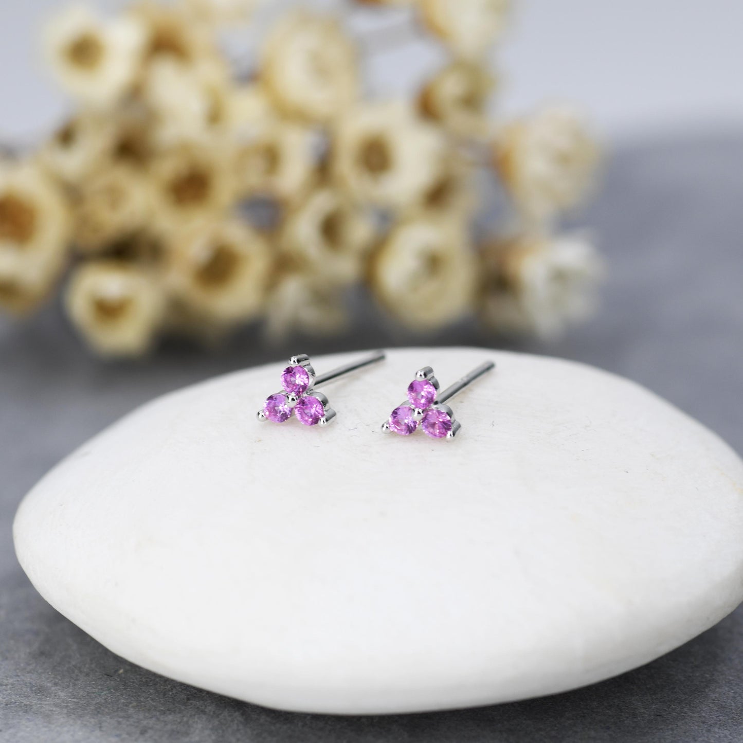 These delicate three-dot Trinity CZ earrings come in silver or gold, featuring a pale pink cubic zirconia. Sold as a pair.