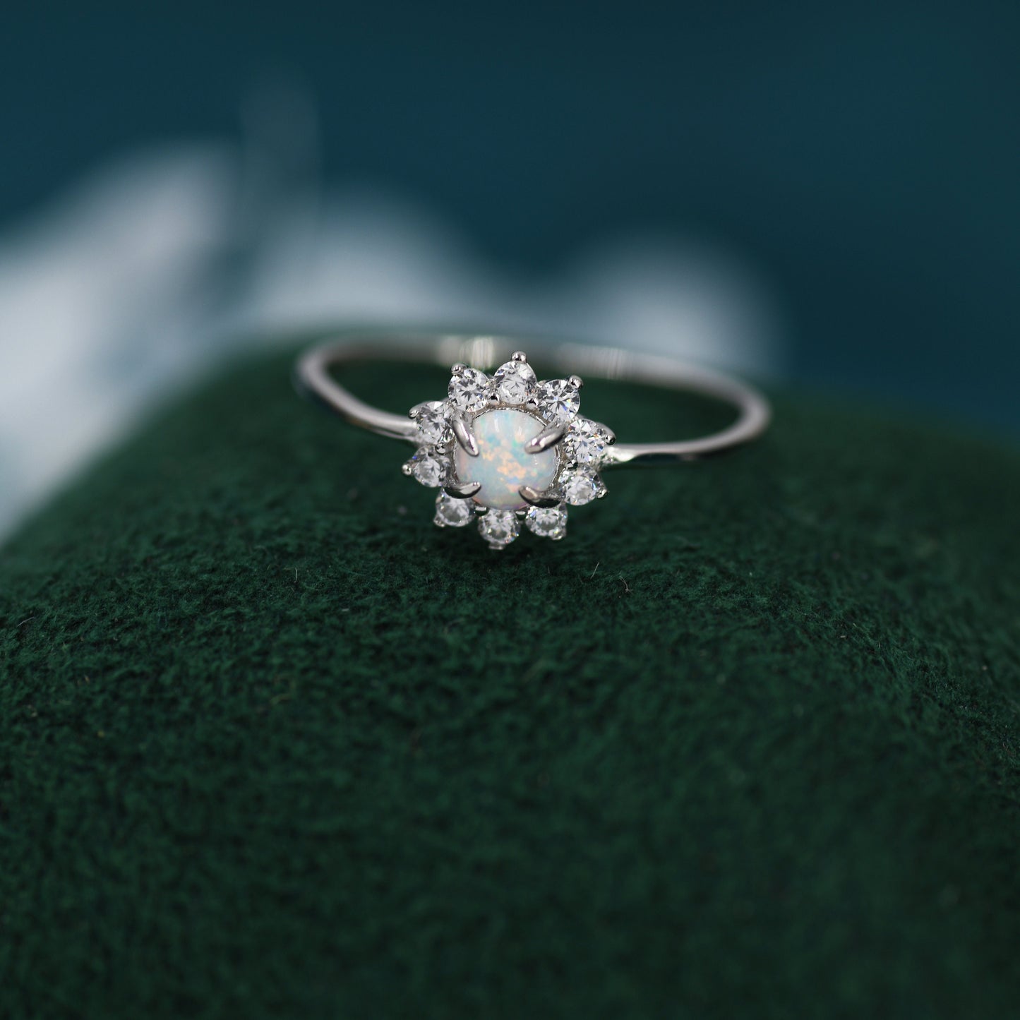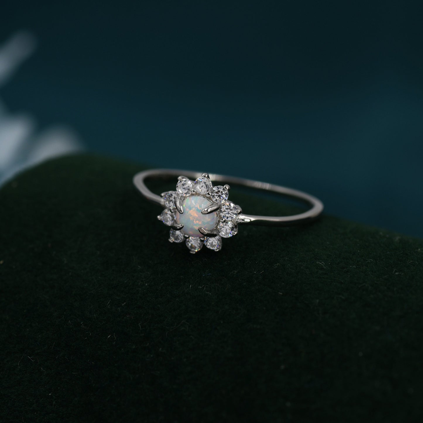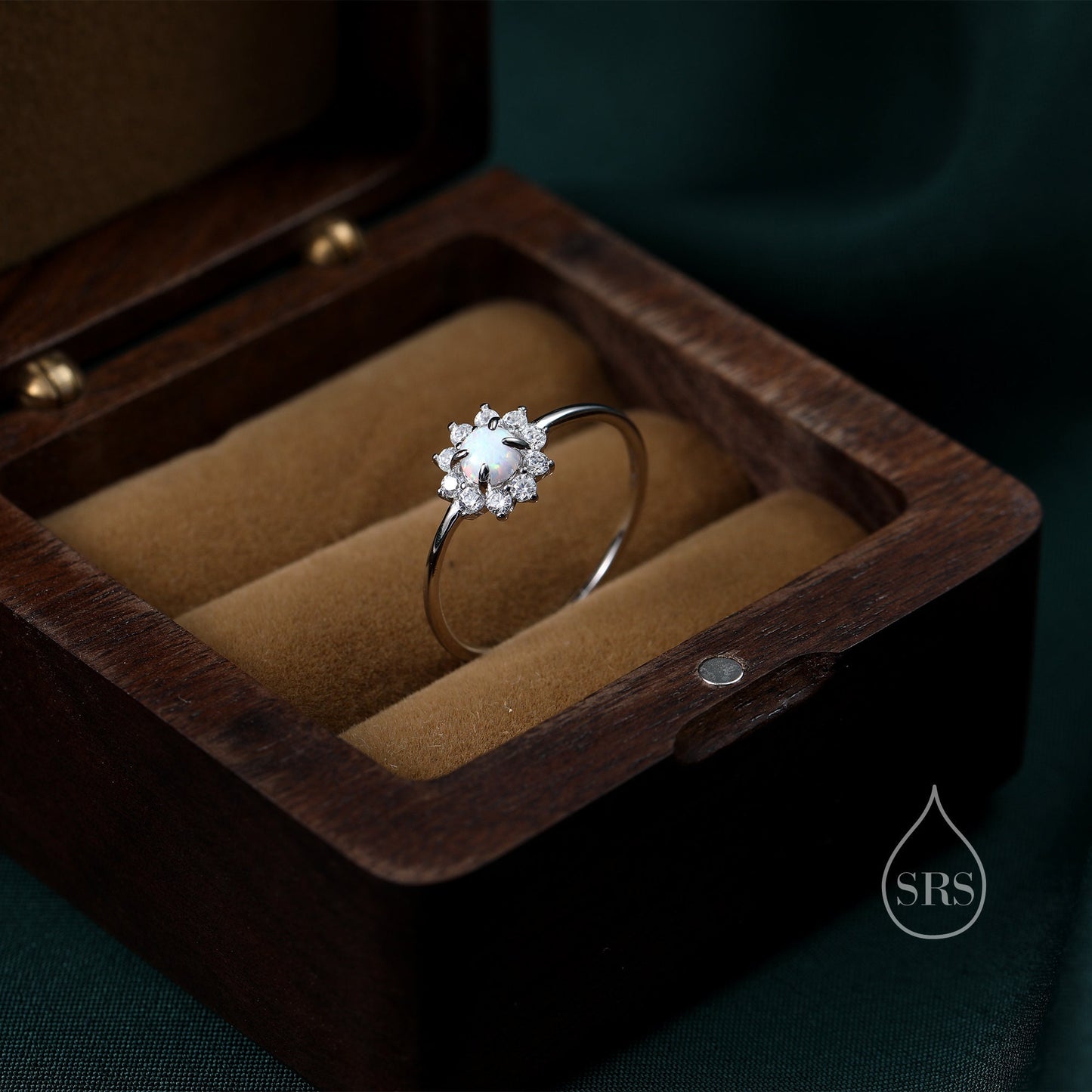 Fire Opal CZ Halo Ring in Sterling Silver, US 5 - 8, 4x6mm, Lab Opal Stone Ring, White Opal Ring