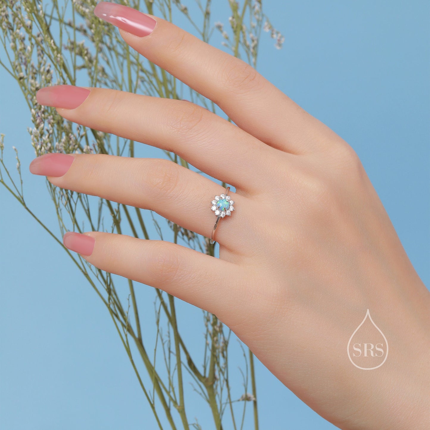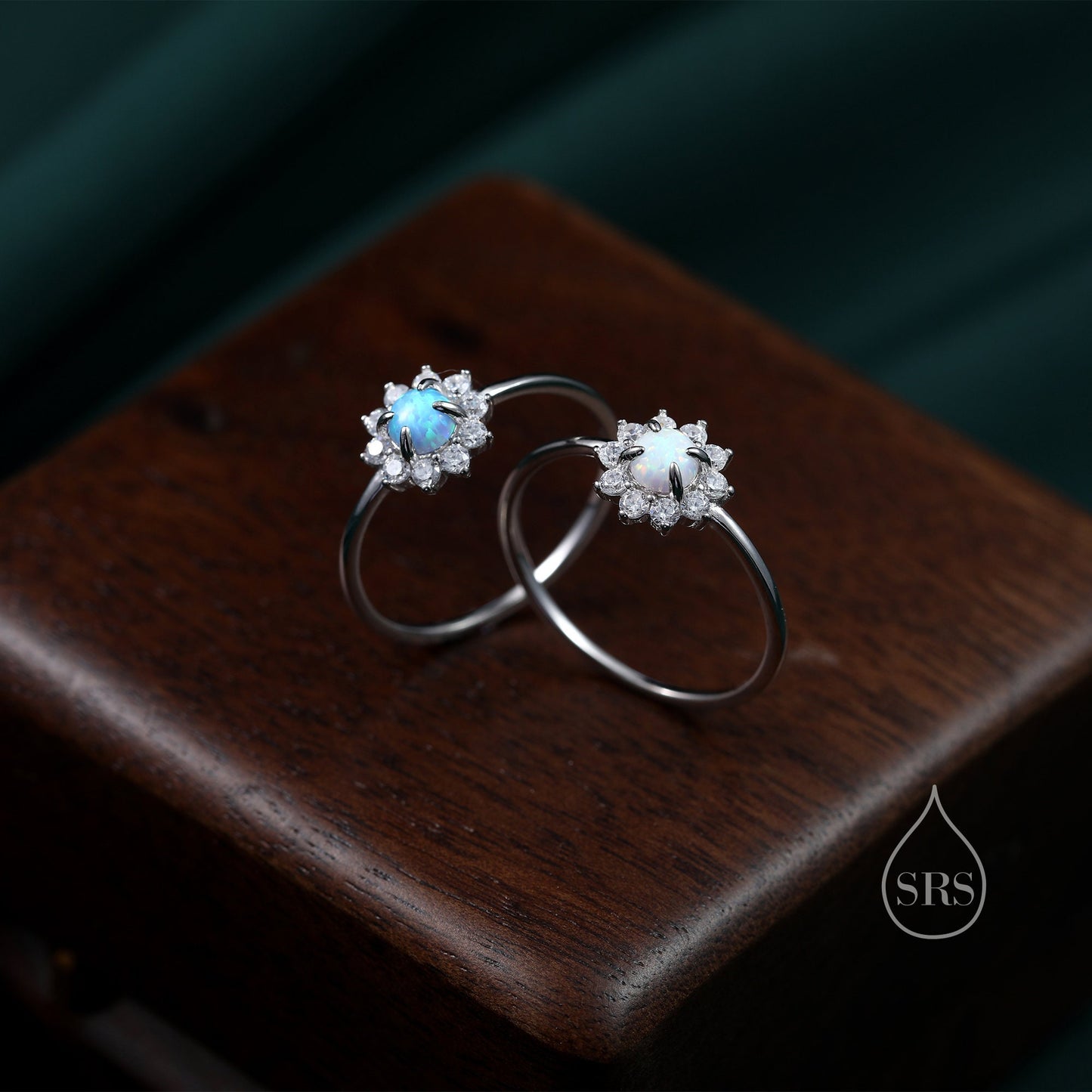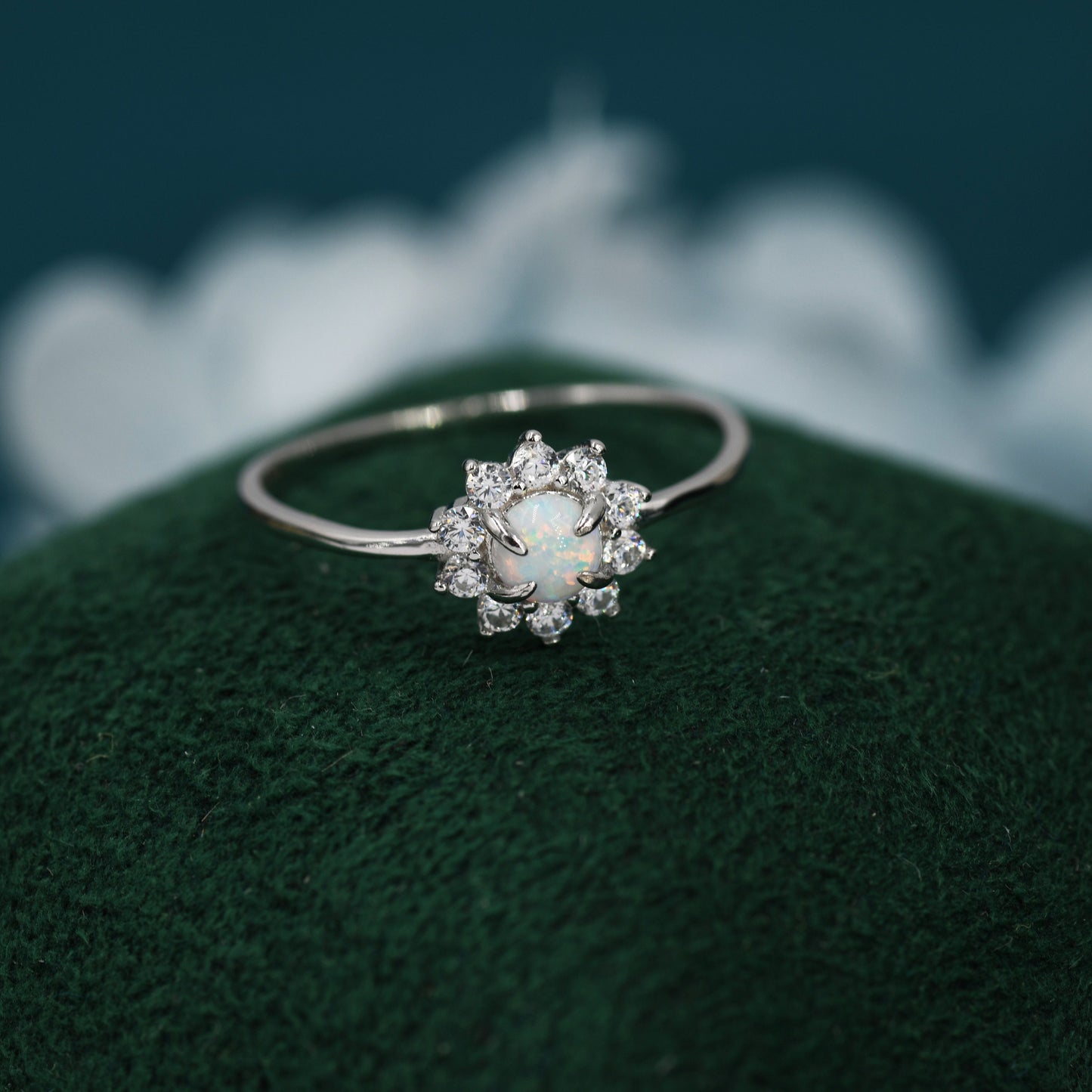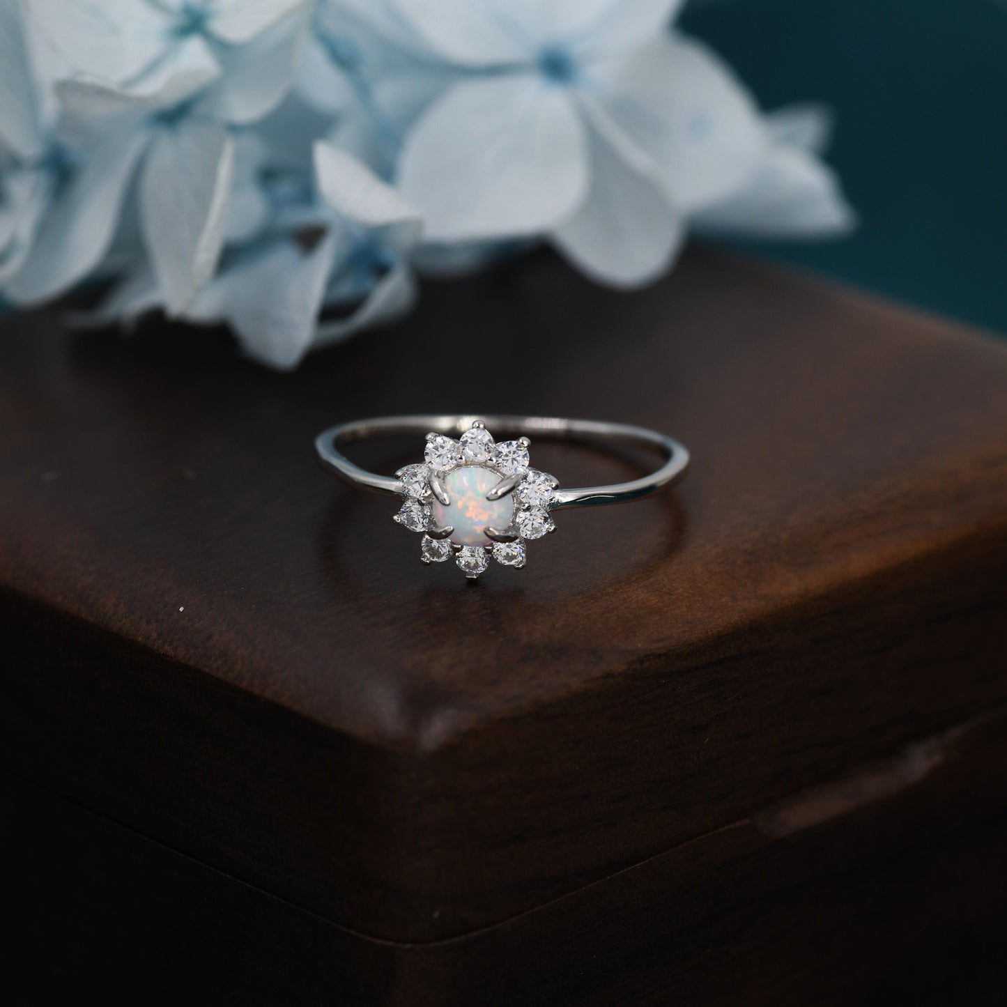 Fire Opal CZ Halo Ring in Sterling Silver, US 5 - 8, 4x6mm, Lab Opal Stone Ring, White Opal Ring
