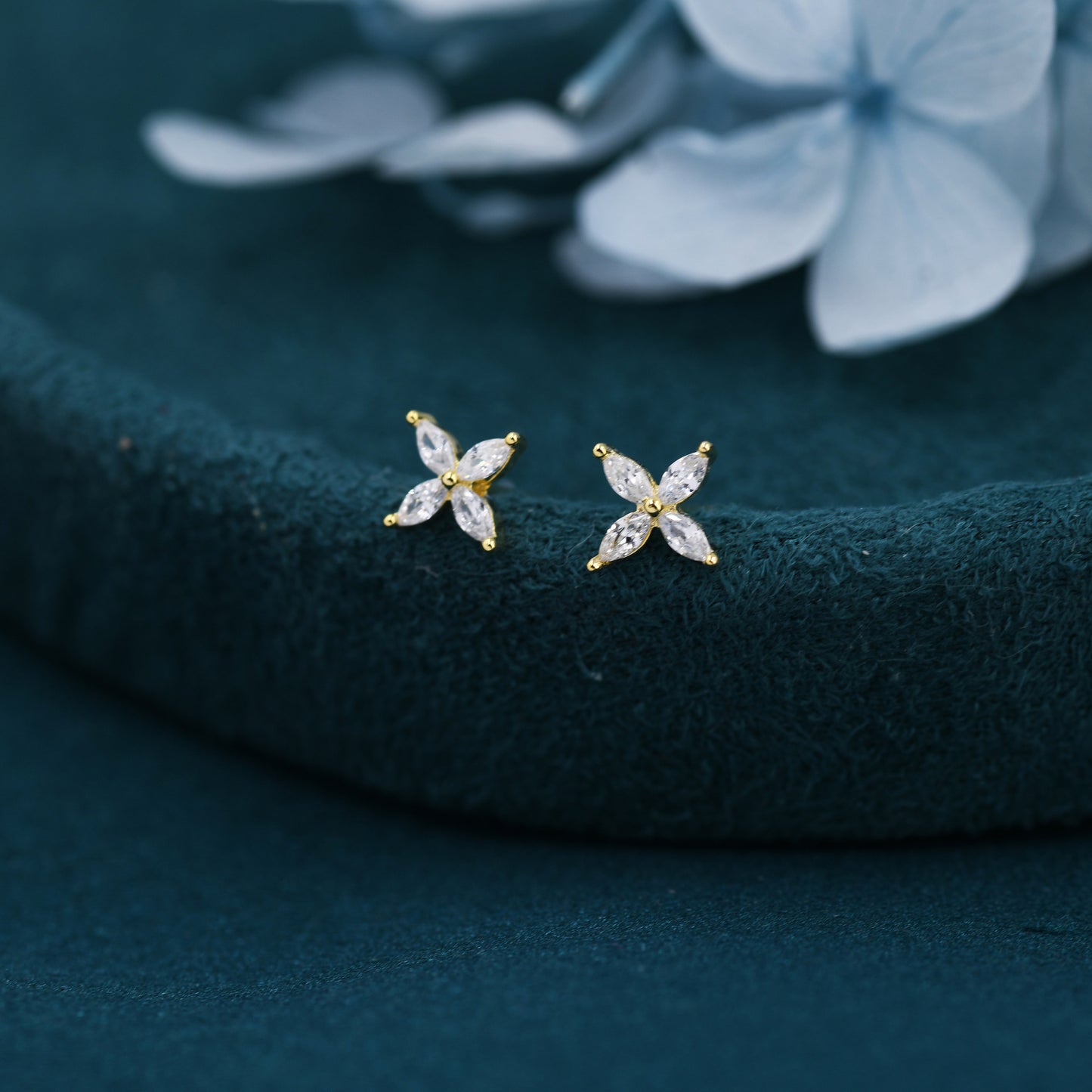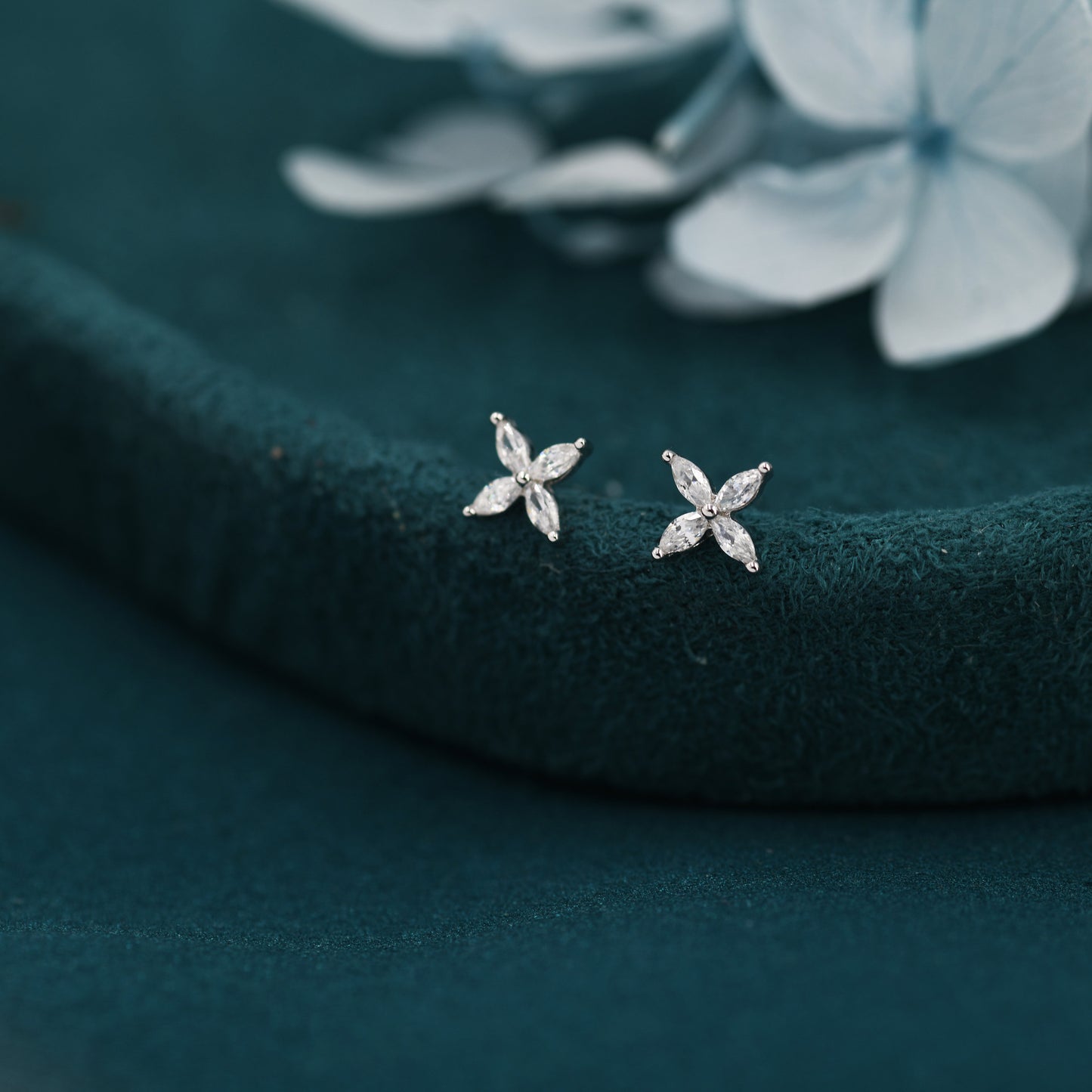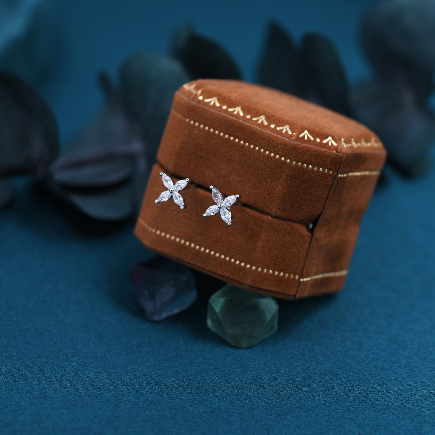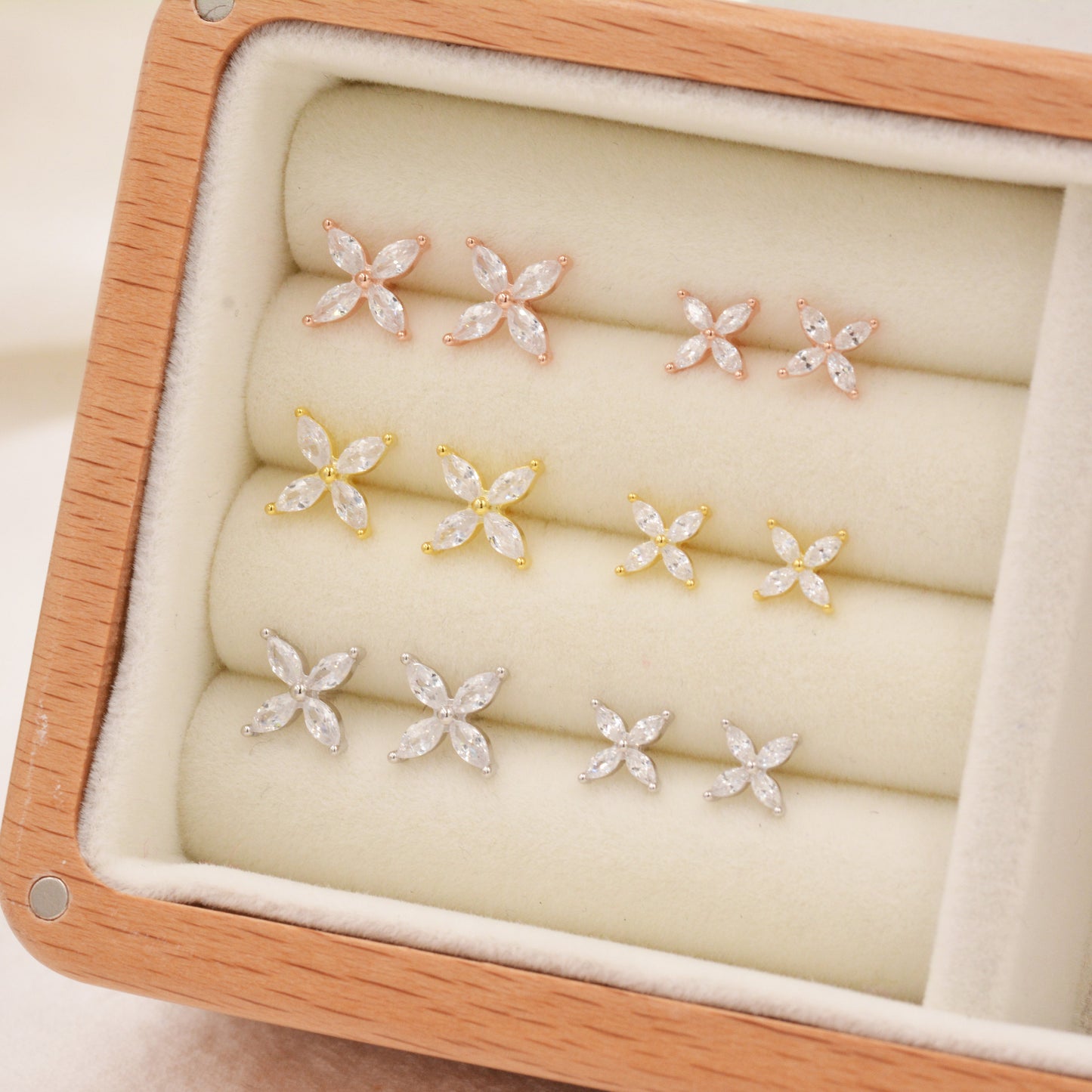 Four Marquise Flower Stud Earrings in Sterling Silver, CZ Flower Earrings, Silver, Gold or Rose Gold, Two Sizes Available
