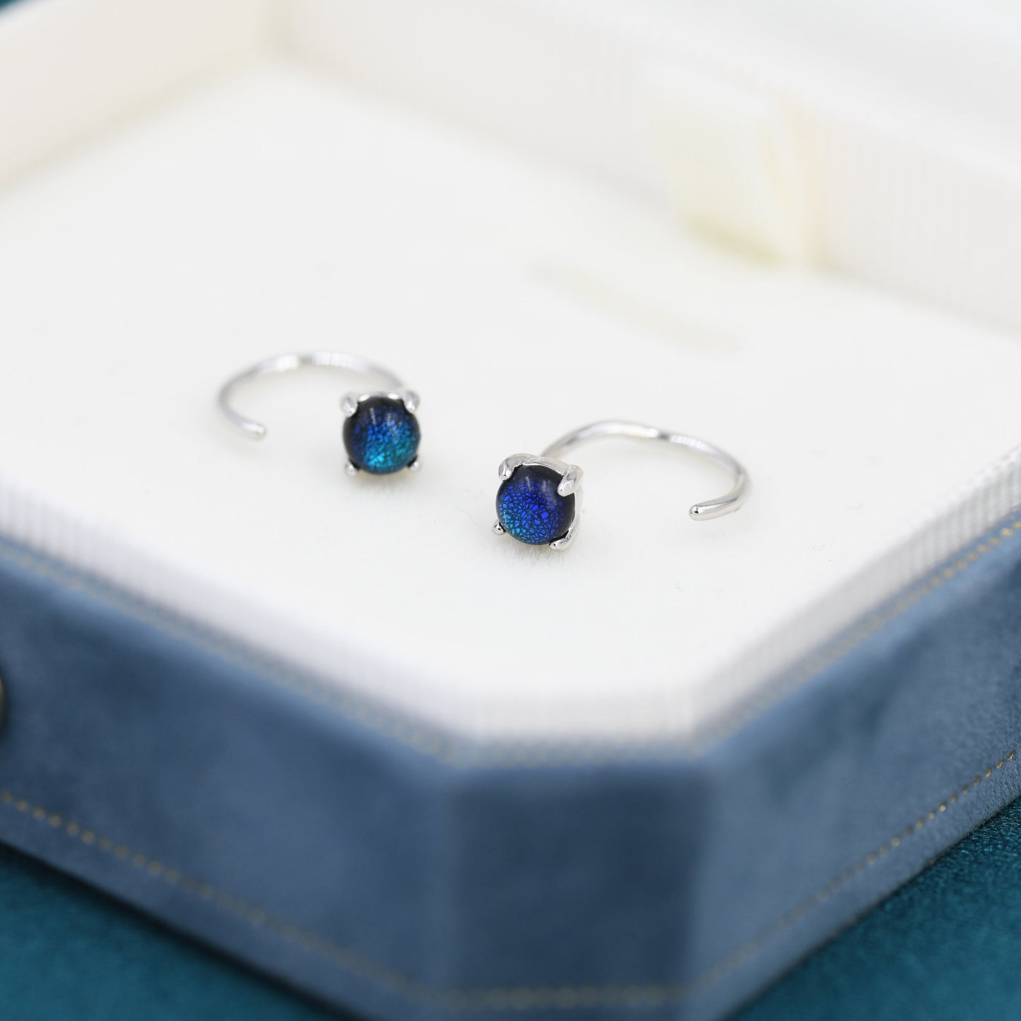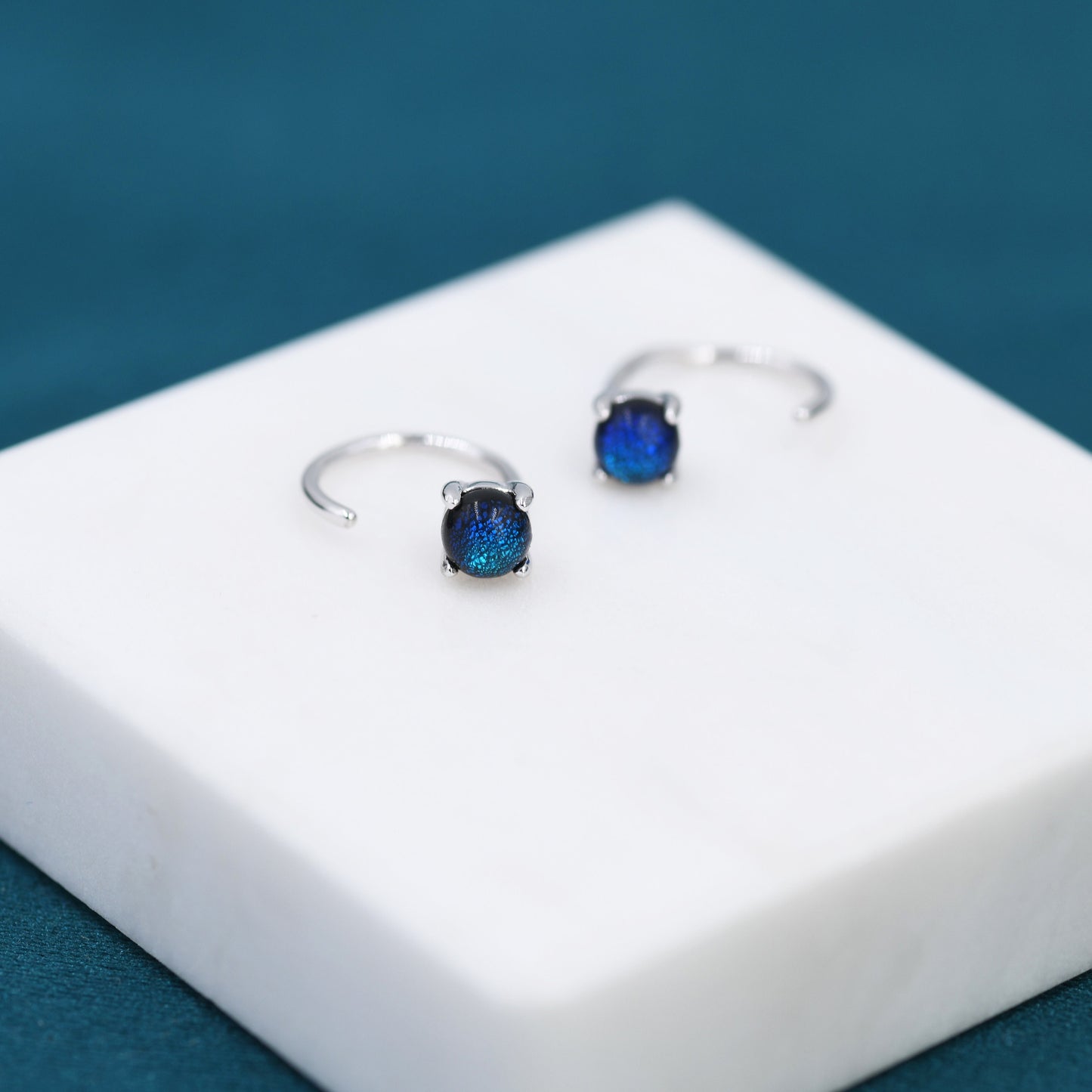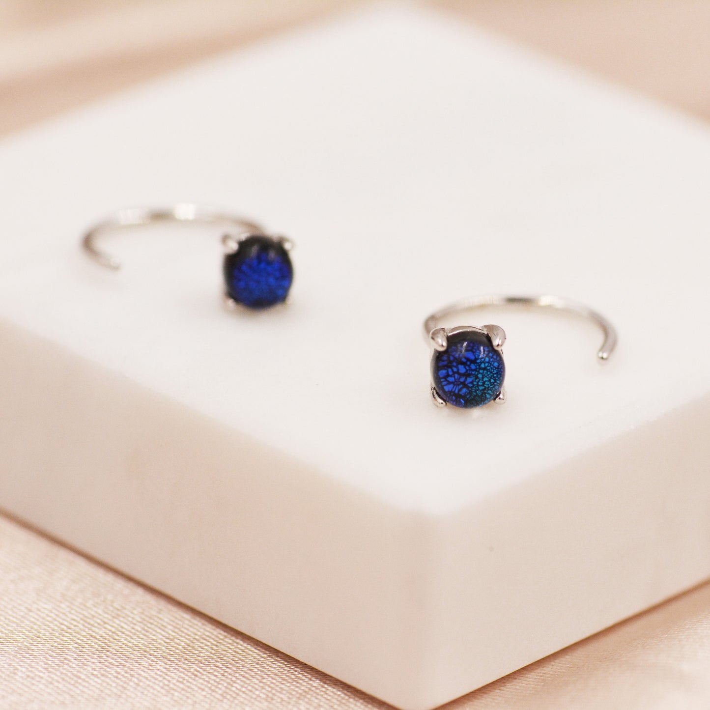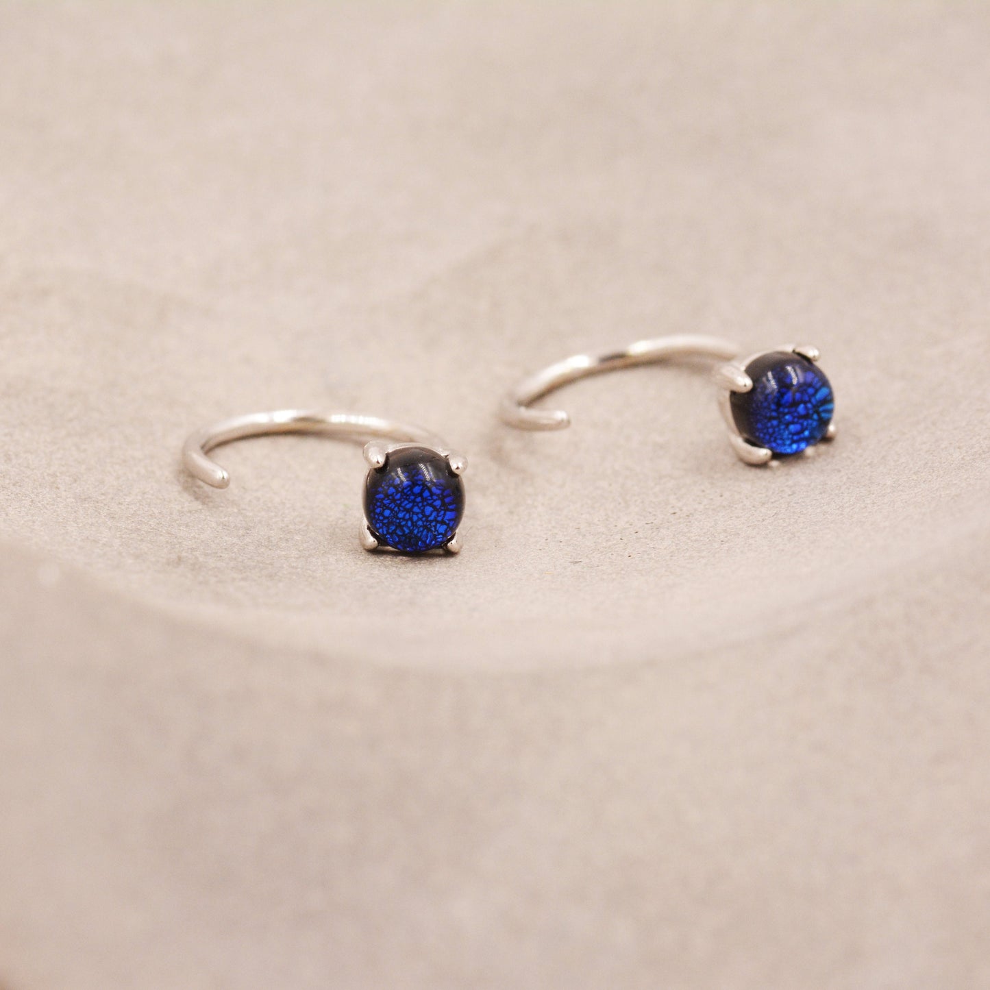 Galaxy Blue Dichroic Glass Crystal Threader Hoop Earrings in Sterling Silver, Dark Blue Crystal Huggie Hoop, Pull Through