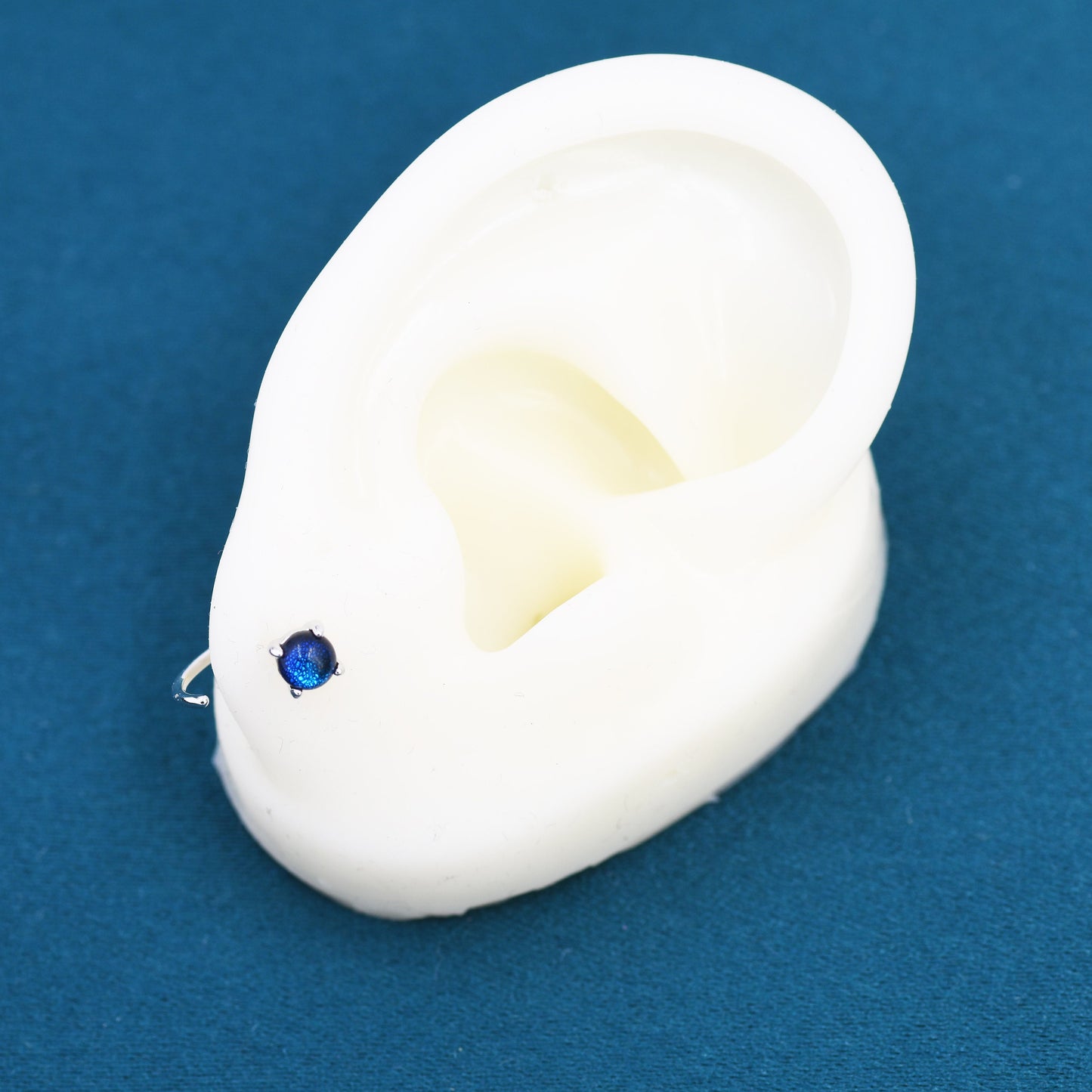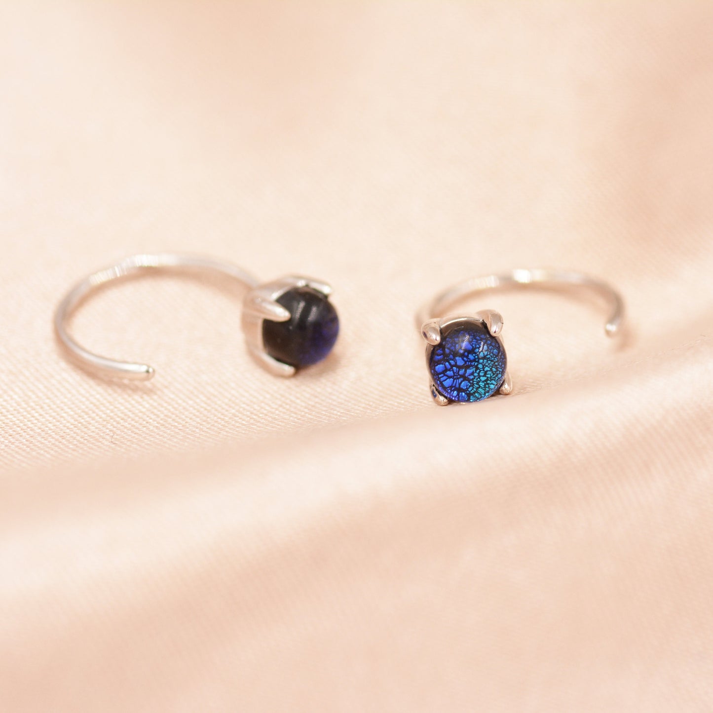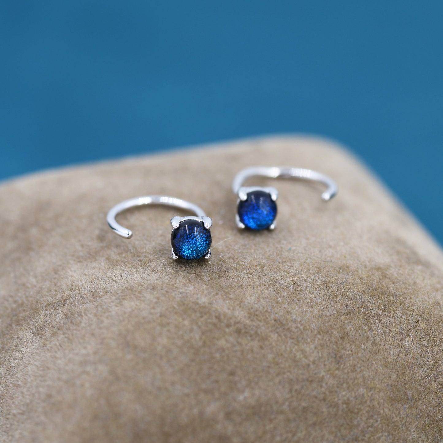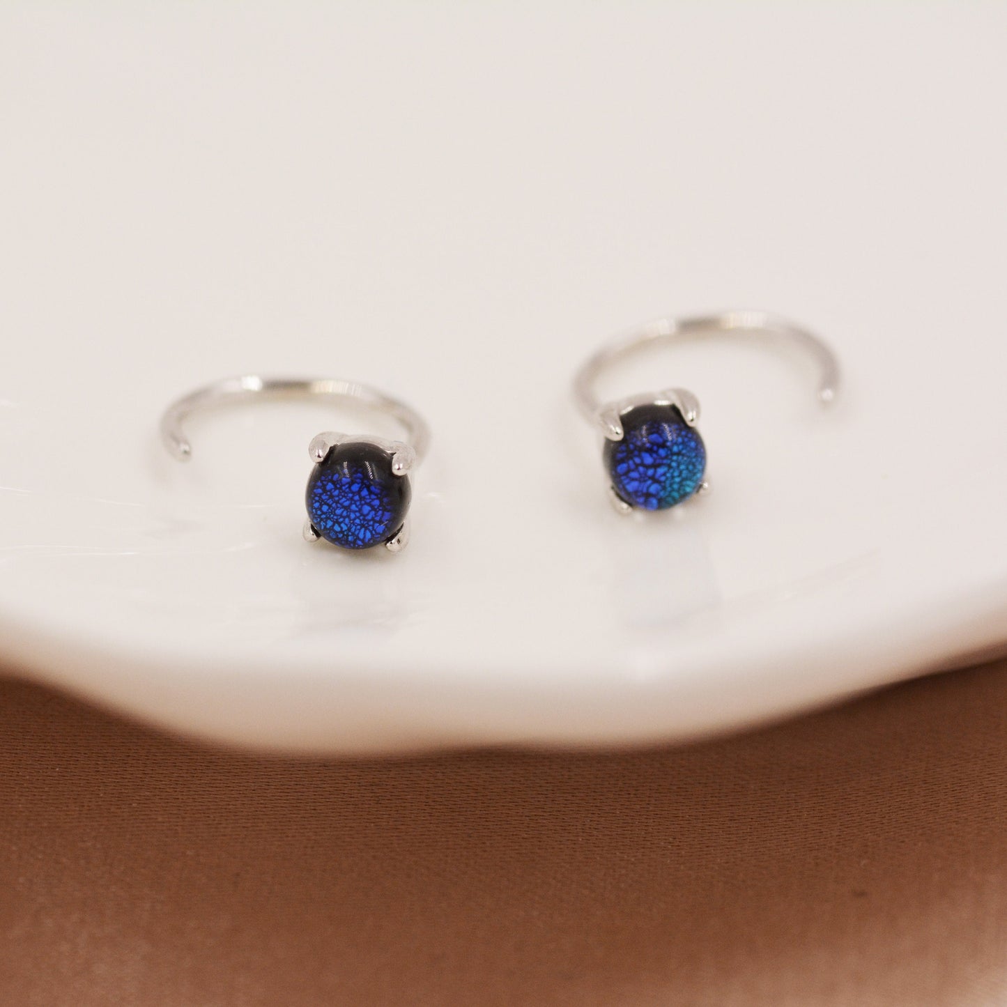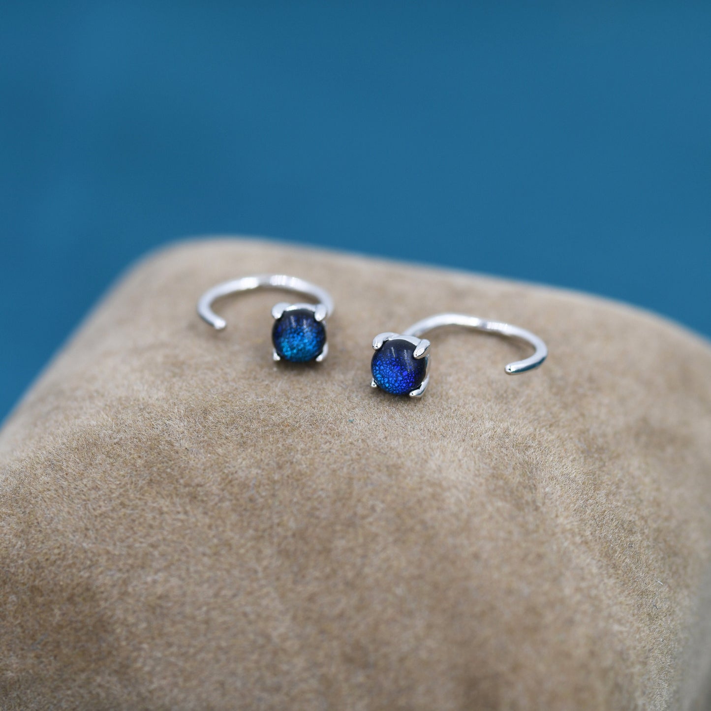 Galaxy Blue Dichroic Glass Crystal Threader Hoop Earrings in Sterling Silver, Dark Blue Crystal Huggie Hoop, Pull Through