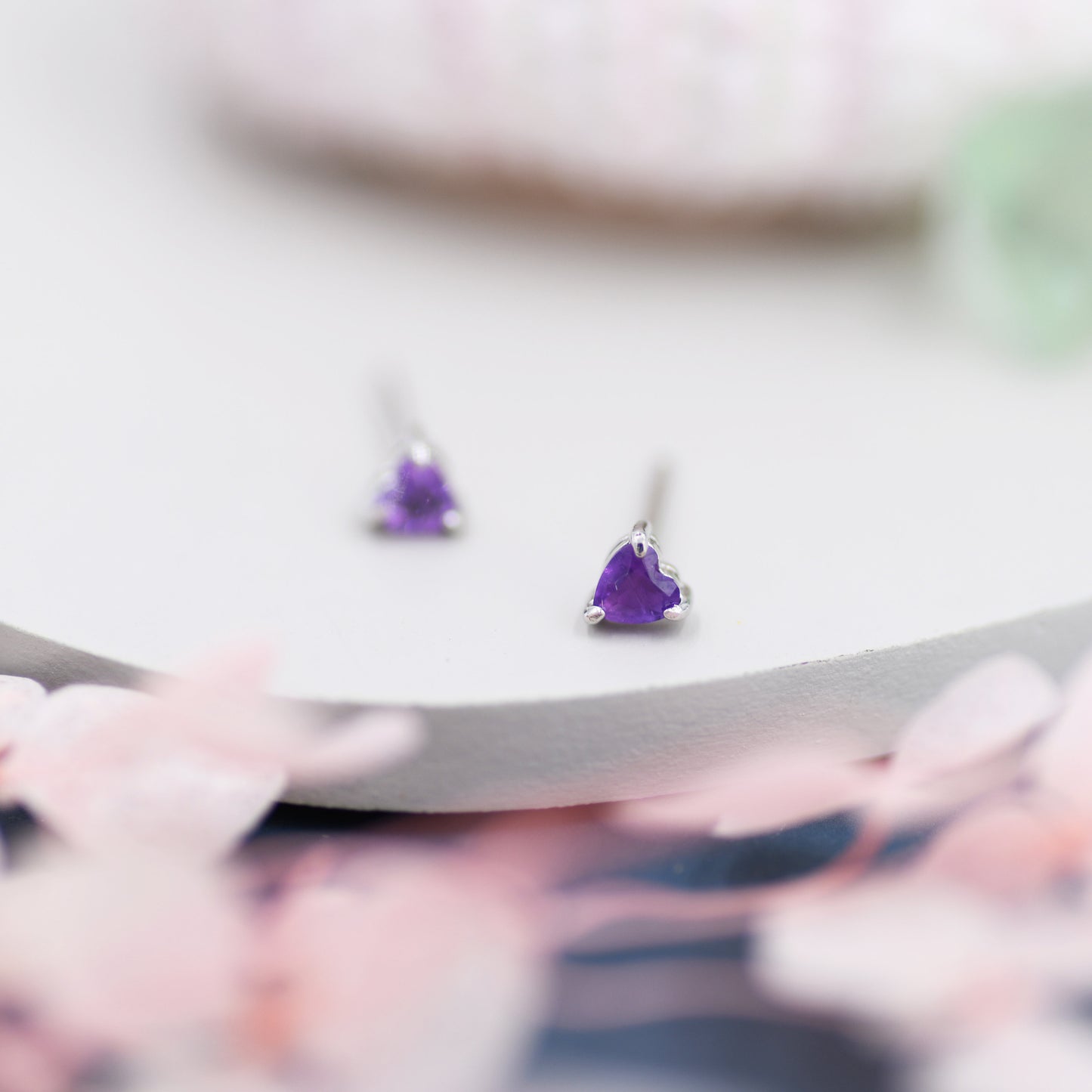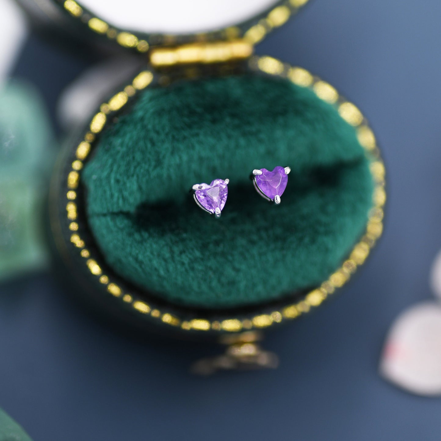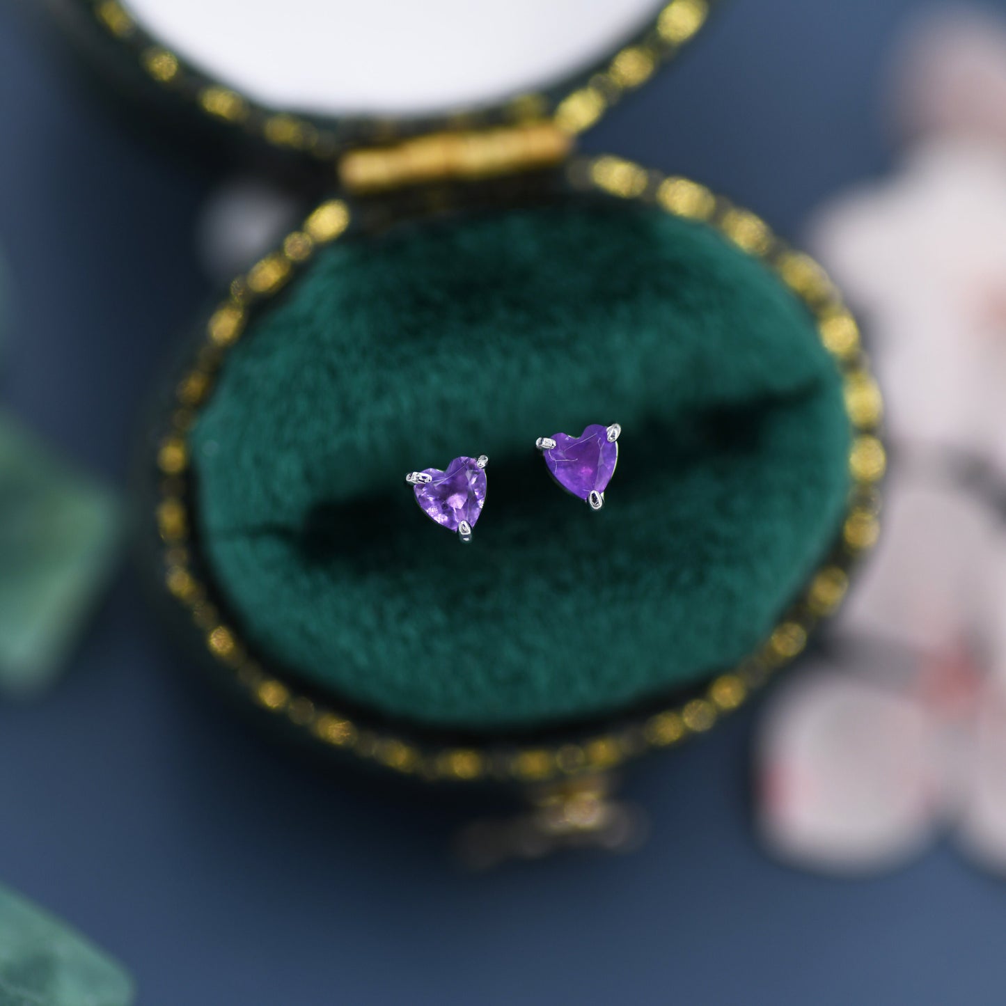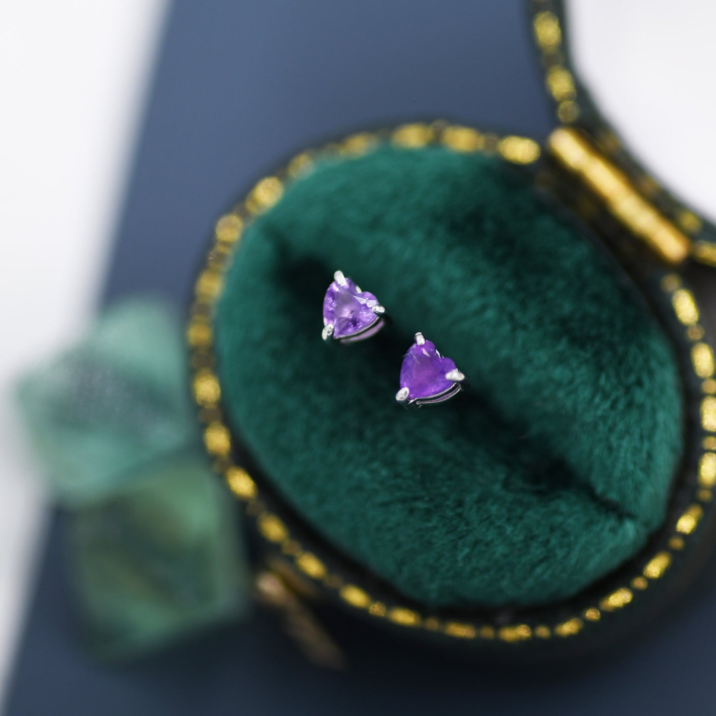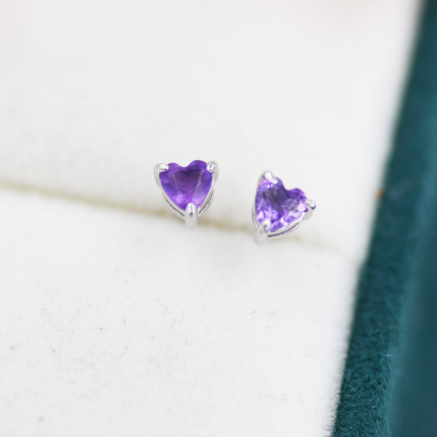 Extra Tiny Genuine Amethyst Heart Stud Earrings in Sterling Silver, Barely Visible Heart Stud Earrings, Tiny Heart Earrings