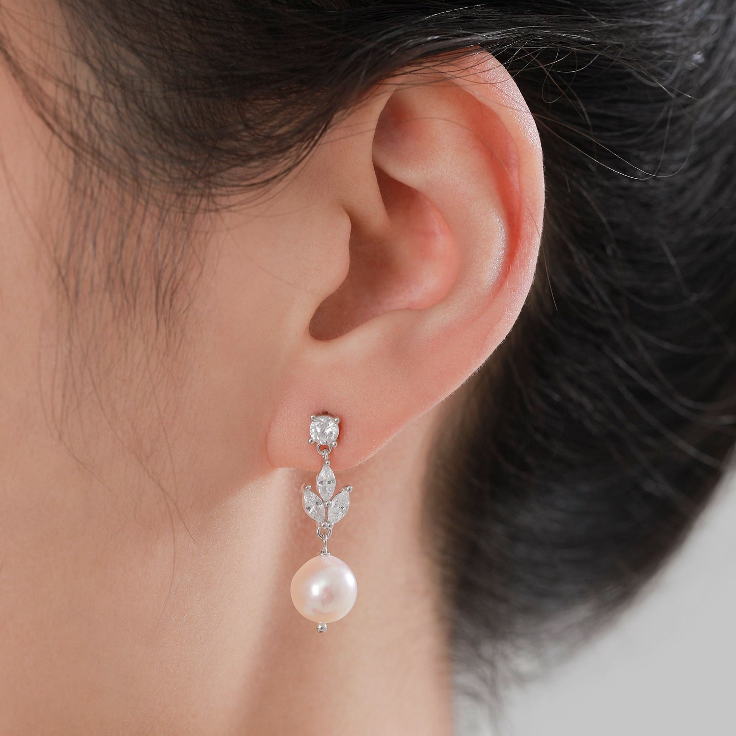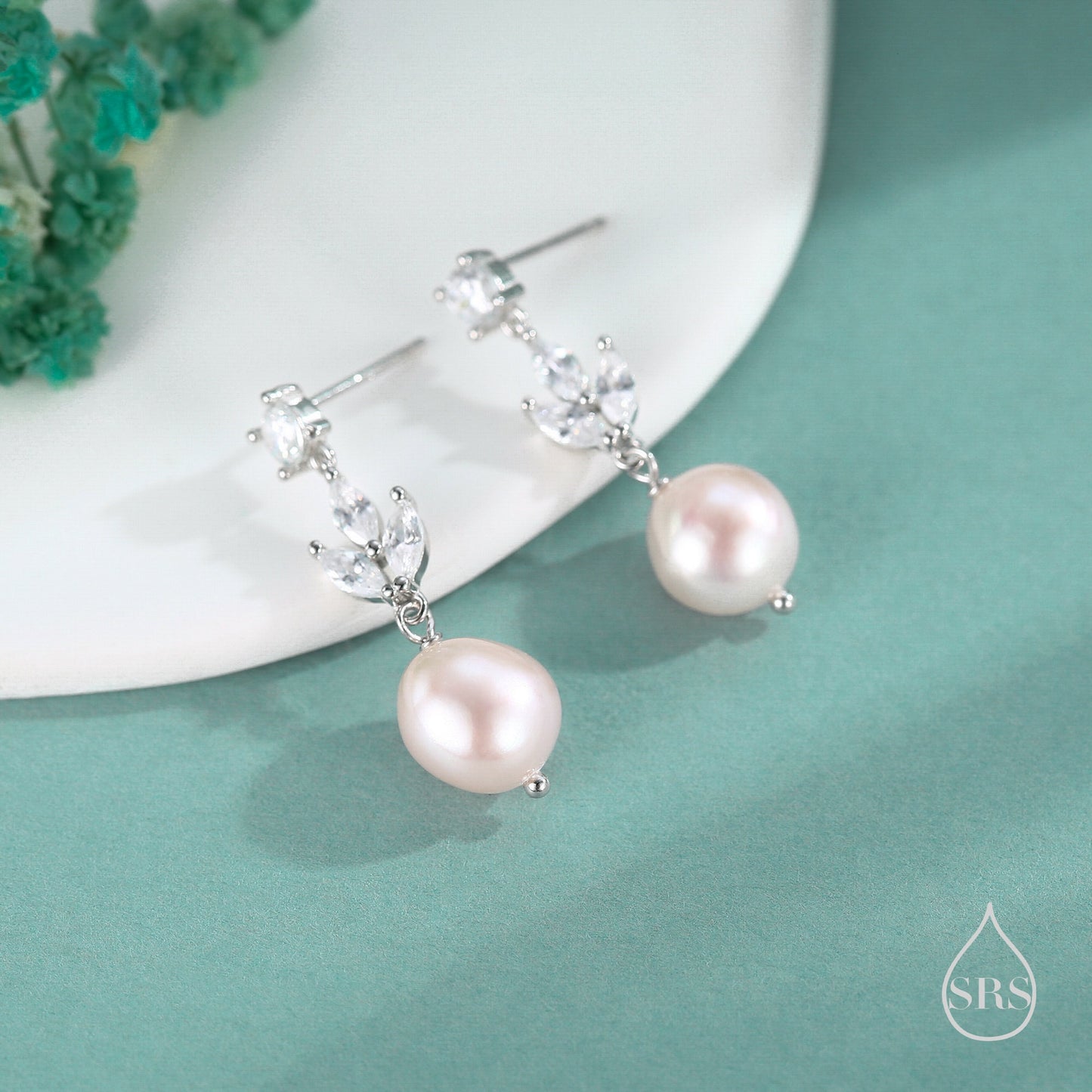 Genuine Freshwater Pearl and CZ Drop Earrings in Sterling Silver, Silver or Gold or Rose Gold, Delicate Keshi Pearl Earrings, Genuine Pearl