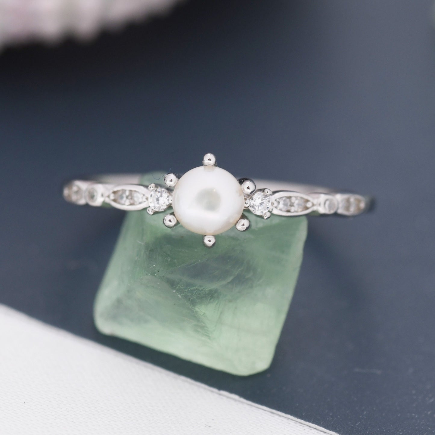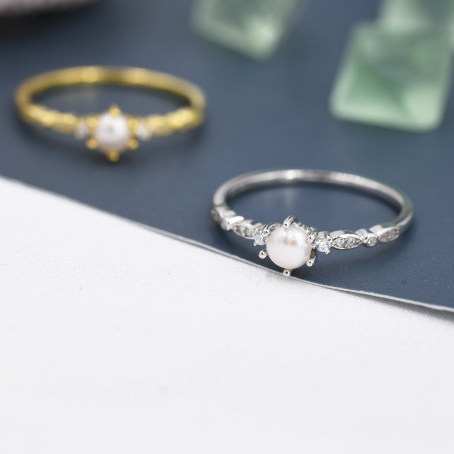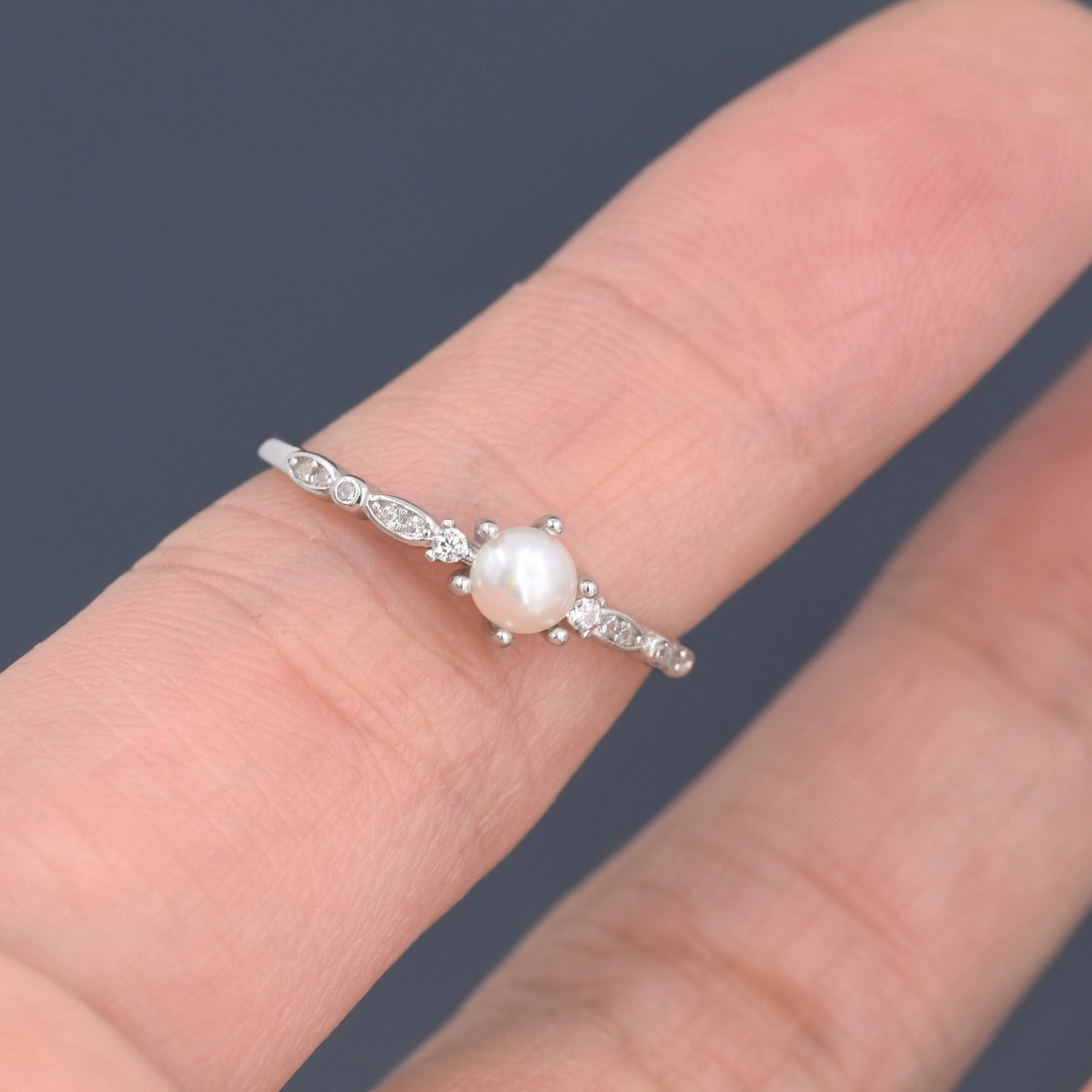 Genuine Freshwater Pearl and CZ Ring in Sterling Silver, Silver, Gold or Rose Gold, Natural Pearl Ring, US 5 - 8, Tiny Pearl Ring,