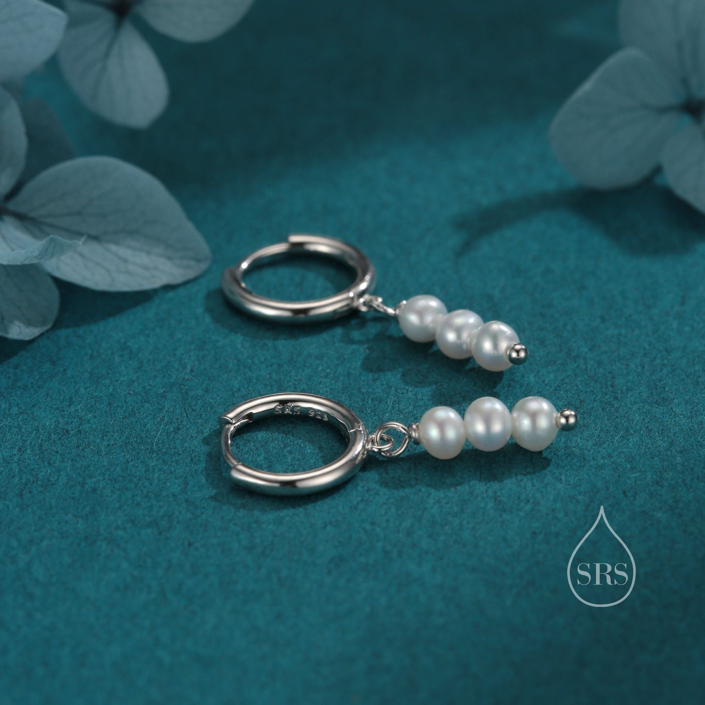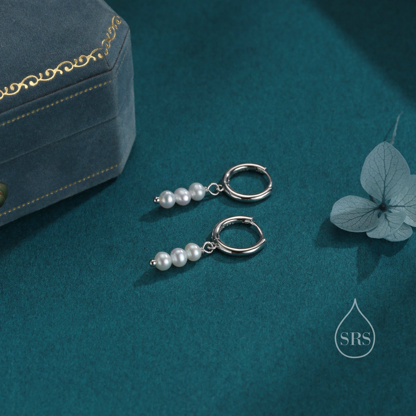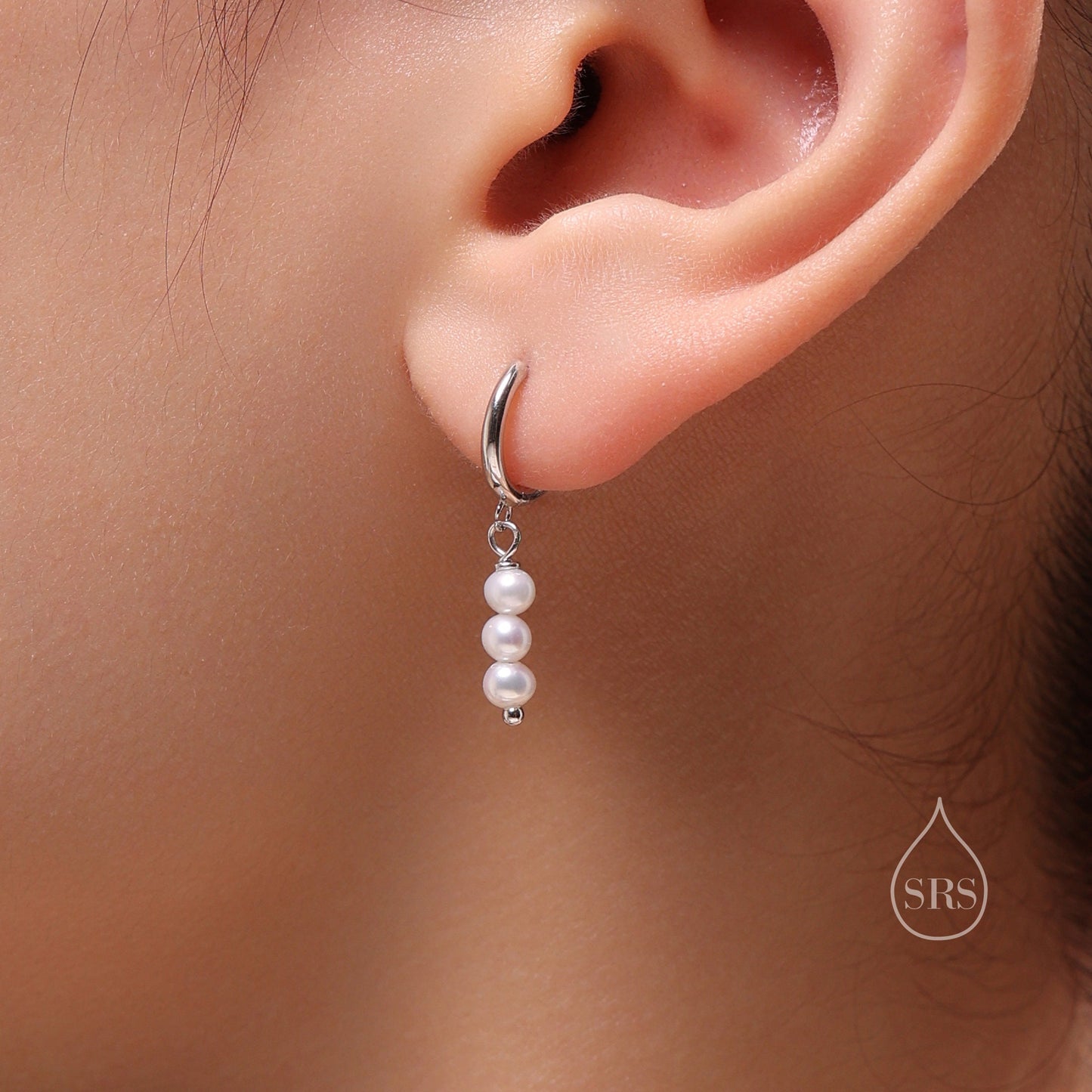 Genuine Freshwater Pearl Trio Huggie Hoop Earrings in Sterling Silver, Silver or Gold, Dainty Three Pearl Cluster Dangle Earrings