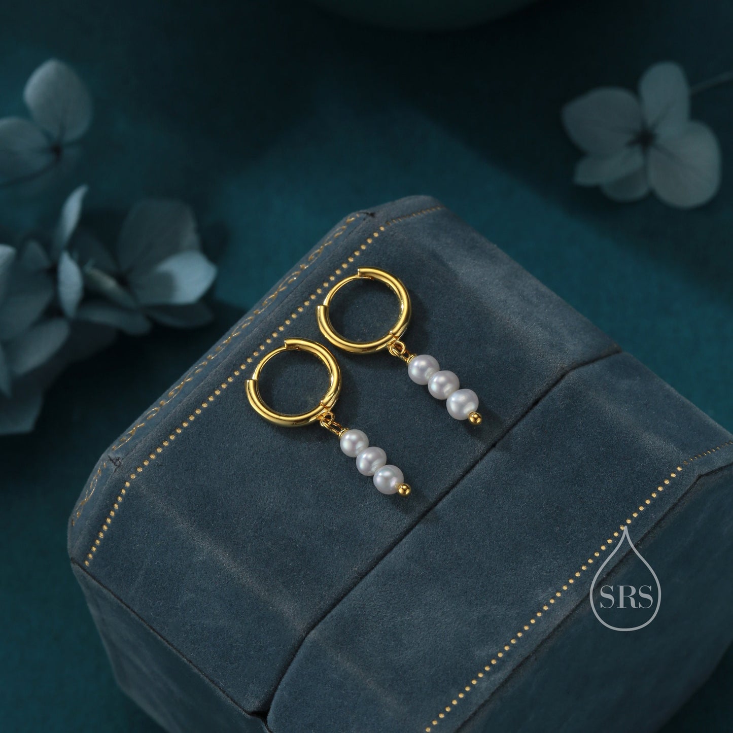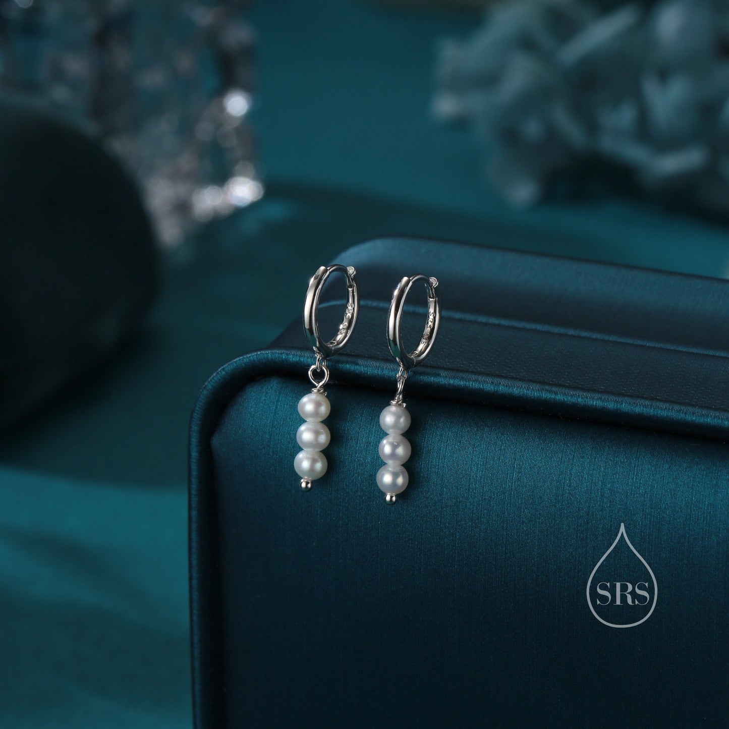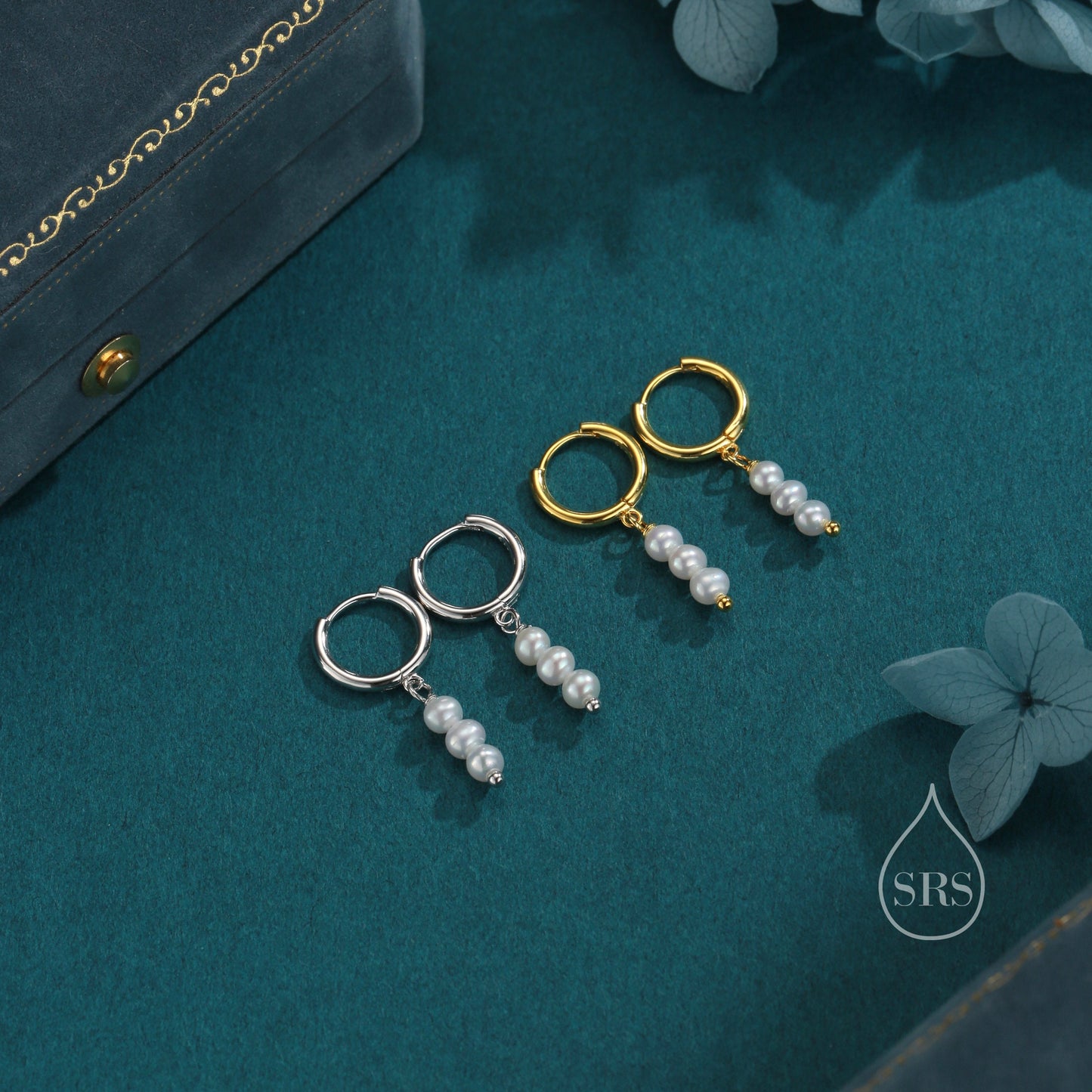 Genuine Freshwater Pearl Trio Huggie Hoop Earrings in Sterling Silver, Silver or Gold, Dainty Three Pearl Cluster Dangle Earrings