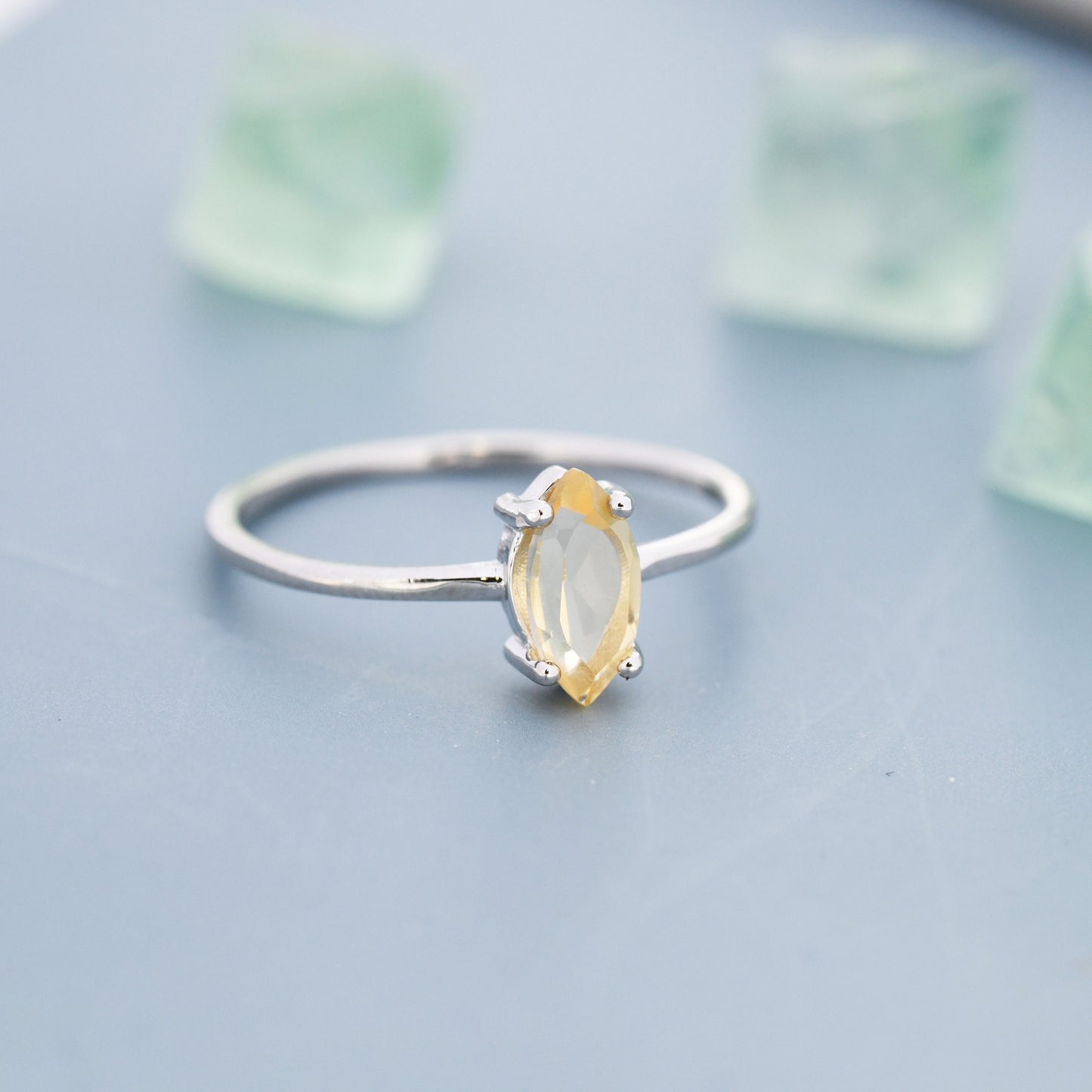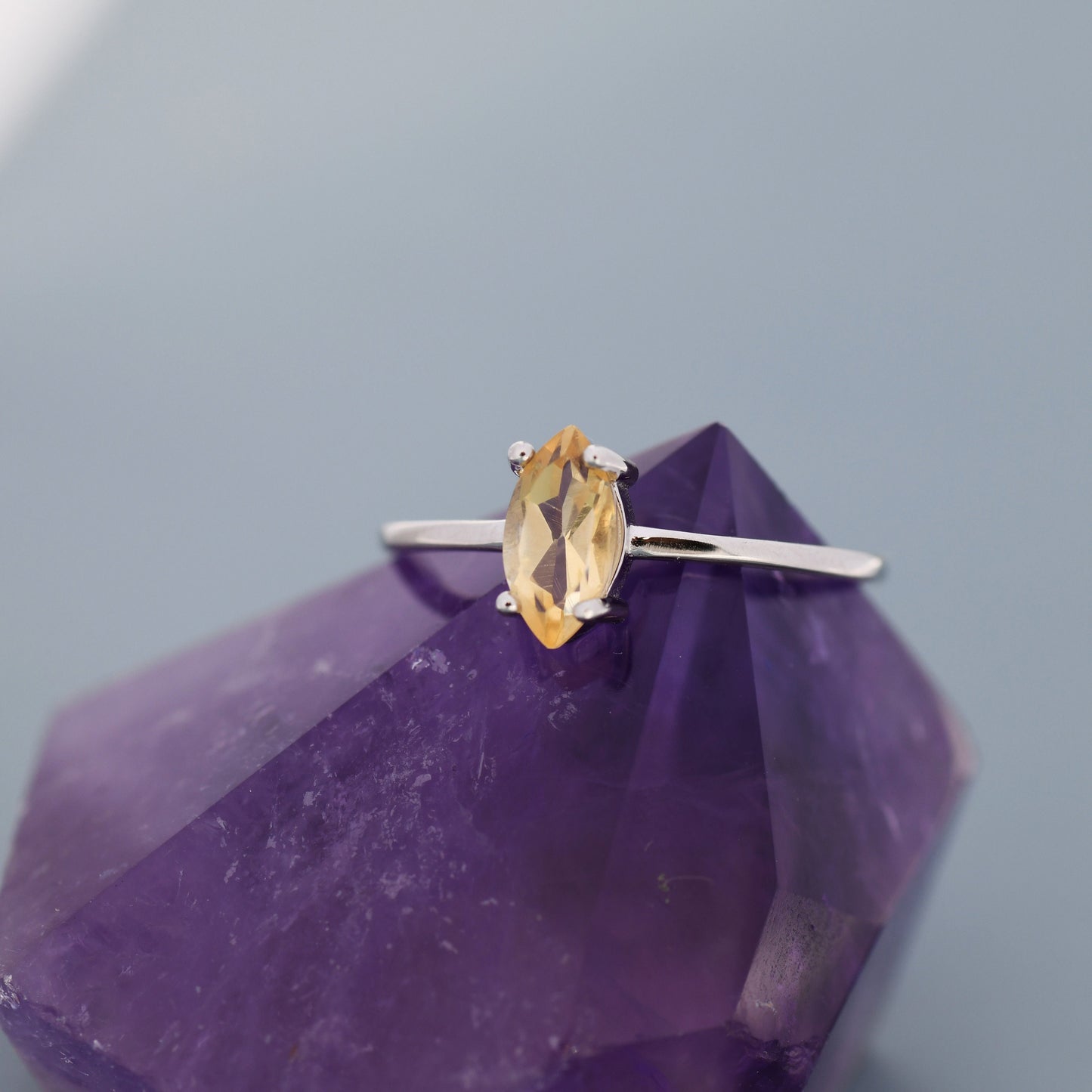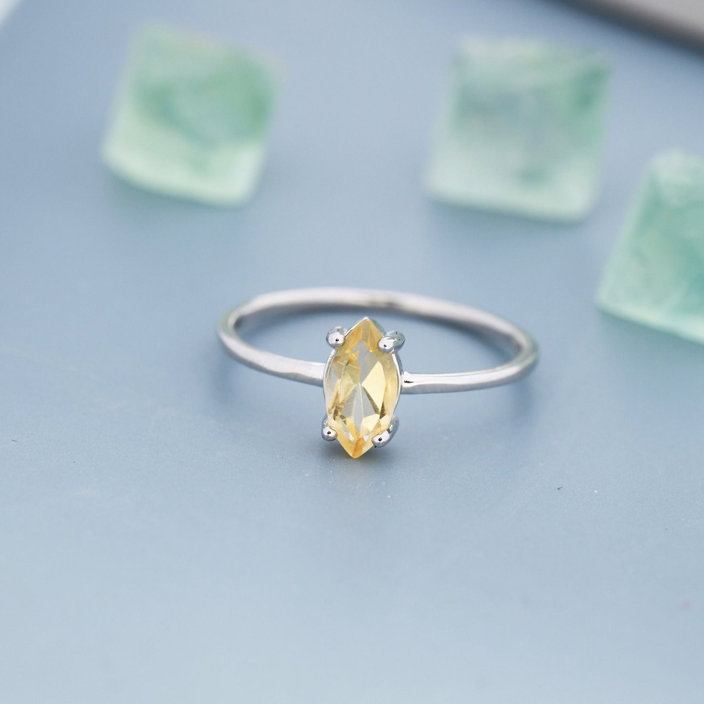 Genuine Yellow Citrine Ring in Sterling Silver, Natural Marquise Cut Citrine Stone Ring, Stacking Rings, US 5-8