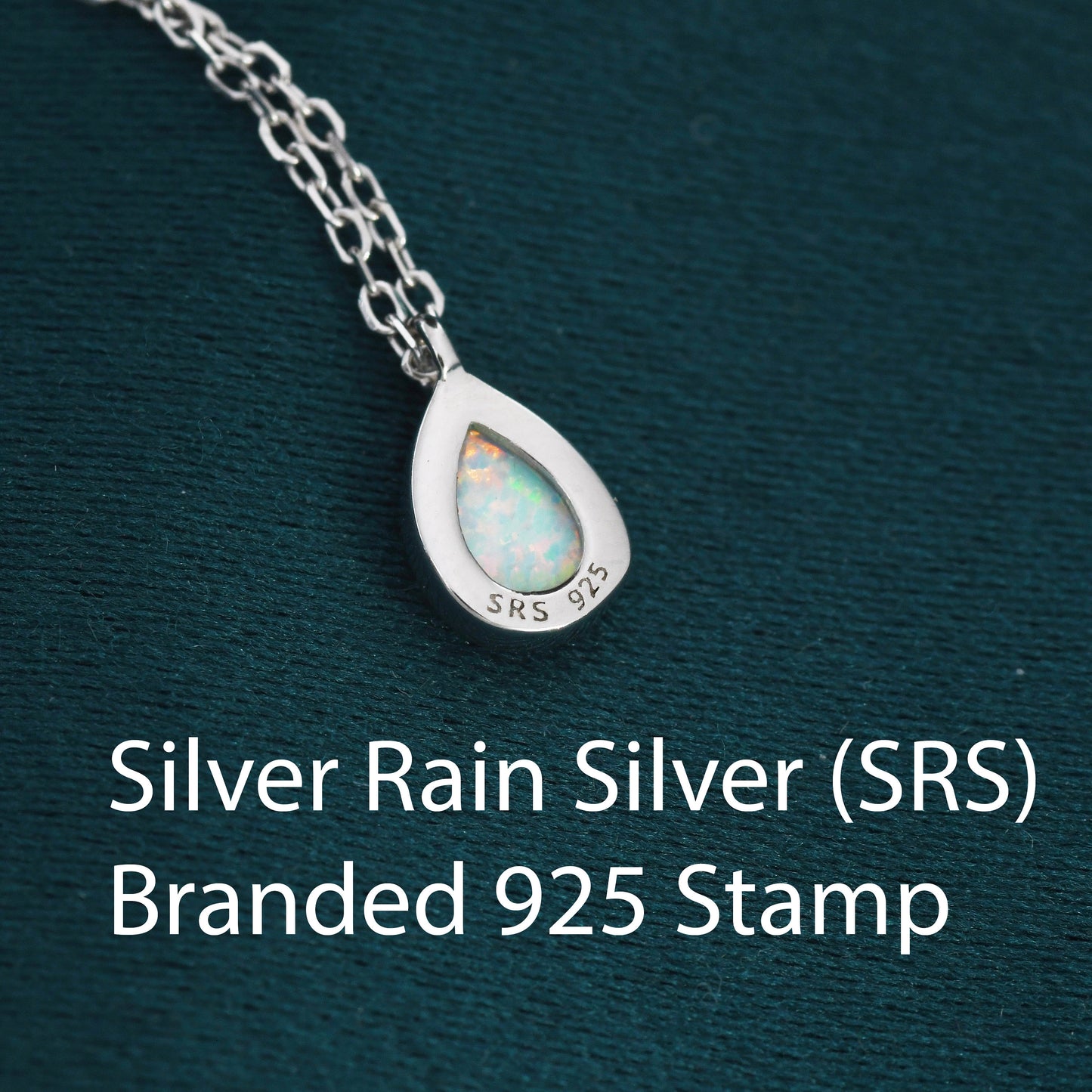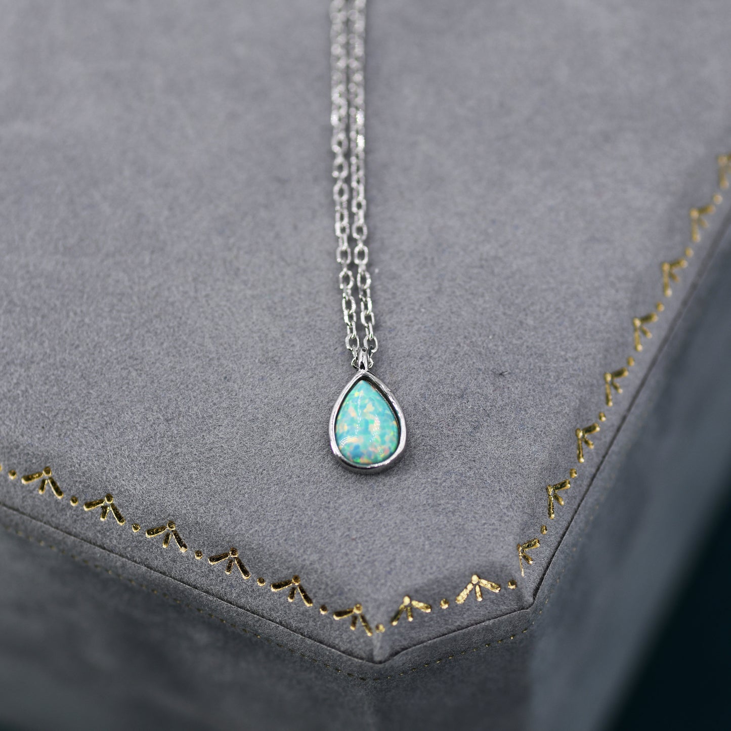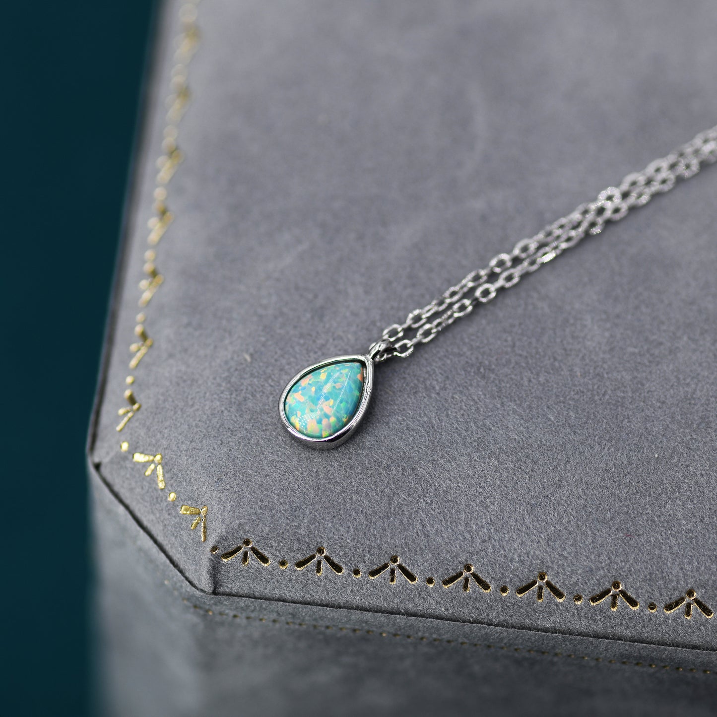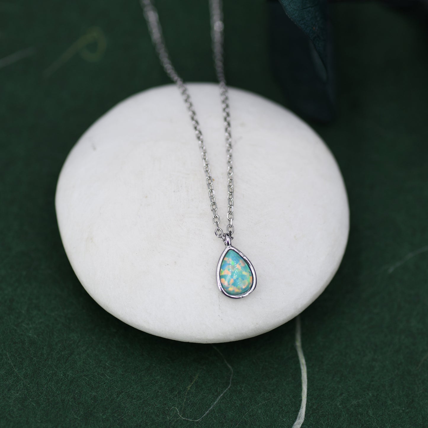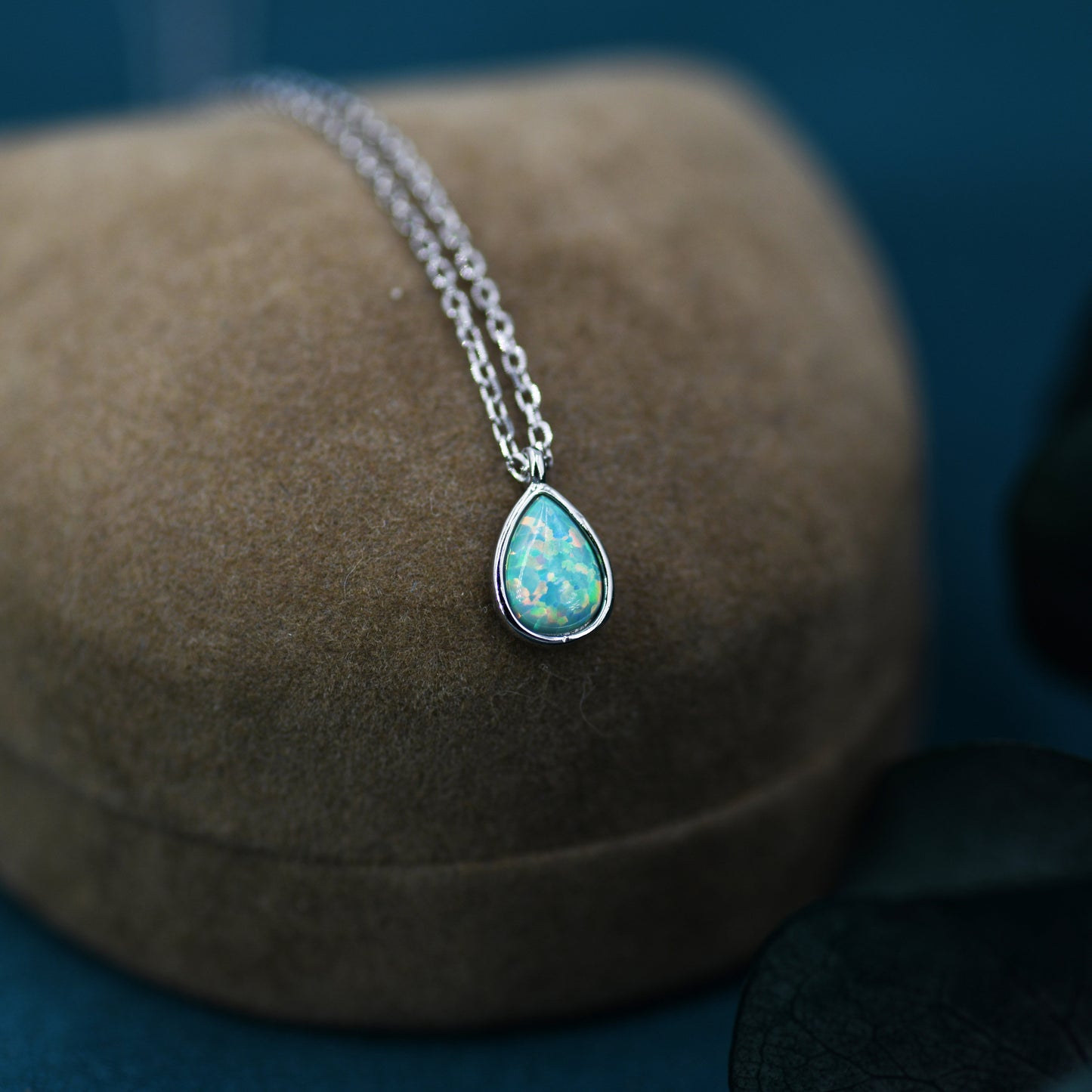 Green Opal Droplet Pendant Necklace in Sterling Silver, Lab Opal Necklace, Pear Shape Opal Necklace, Fire Opal Necklace
