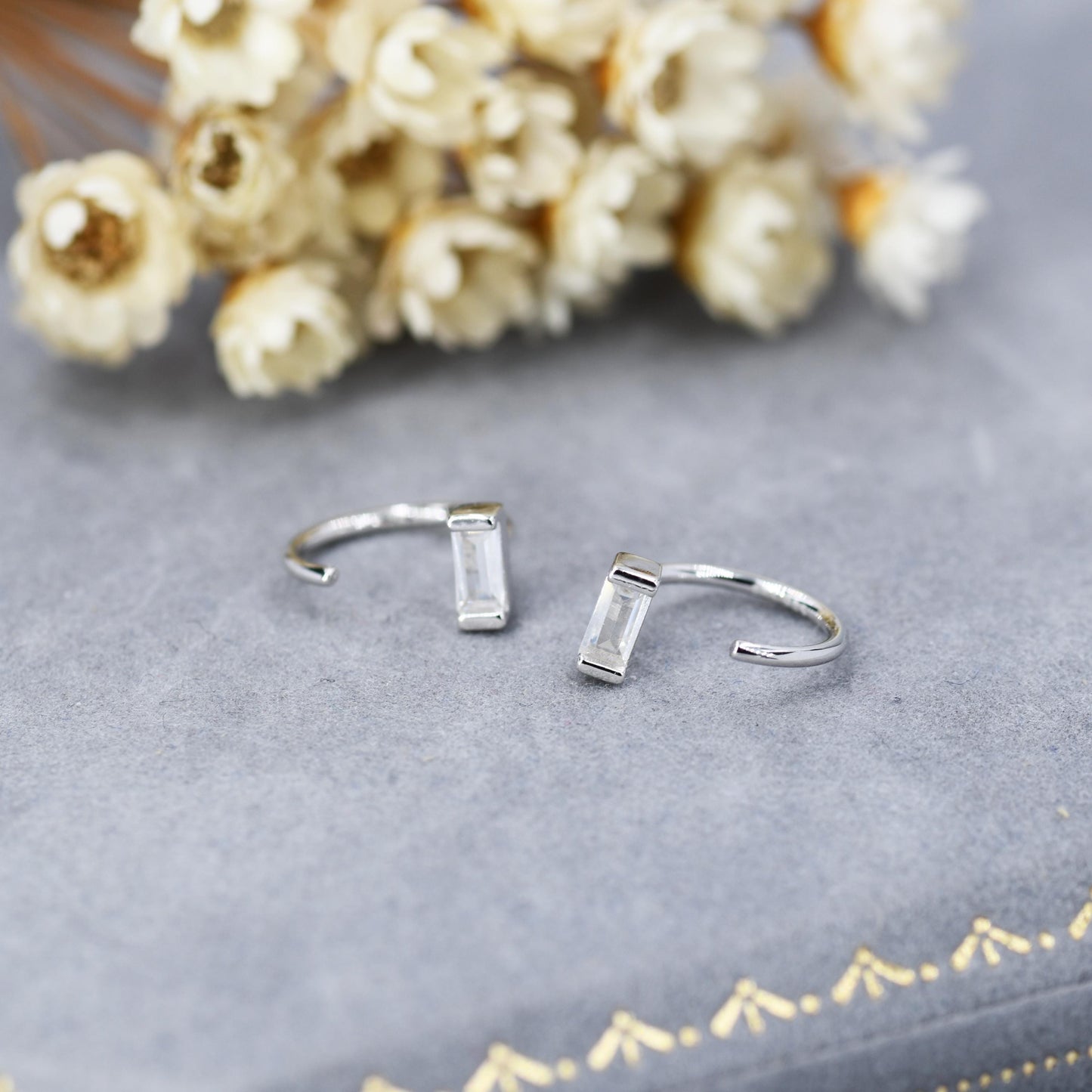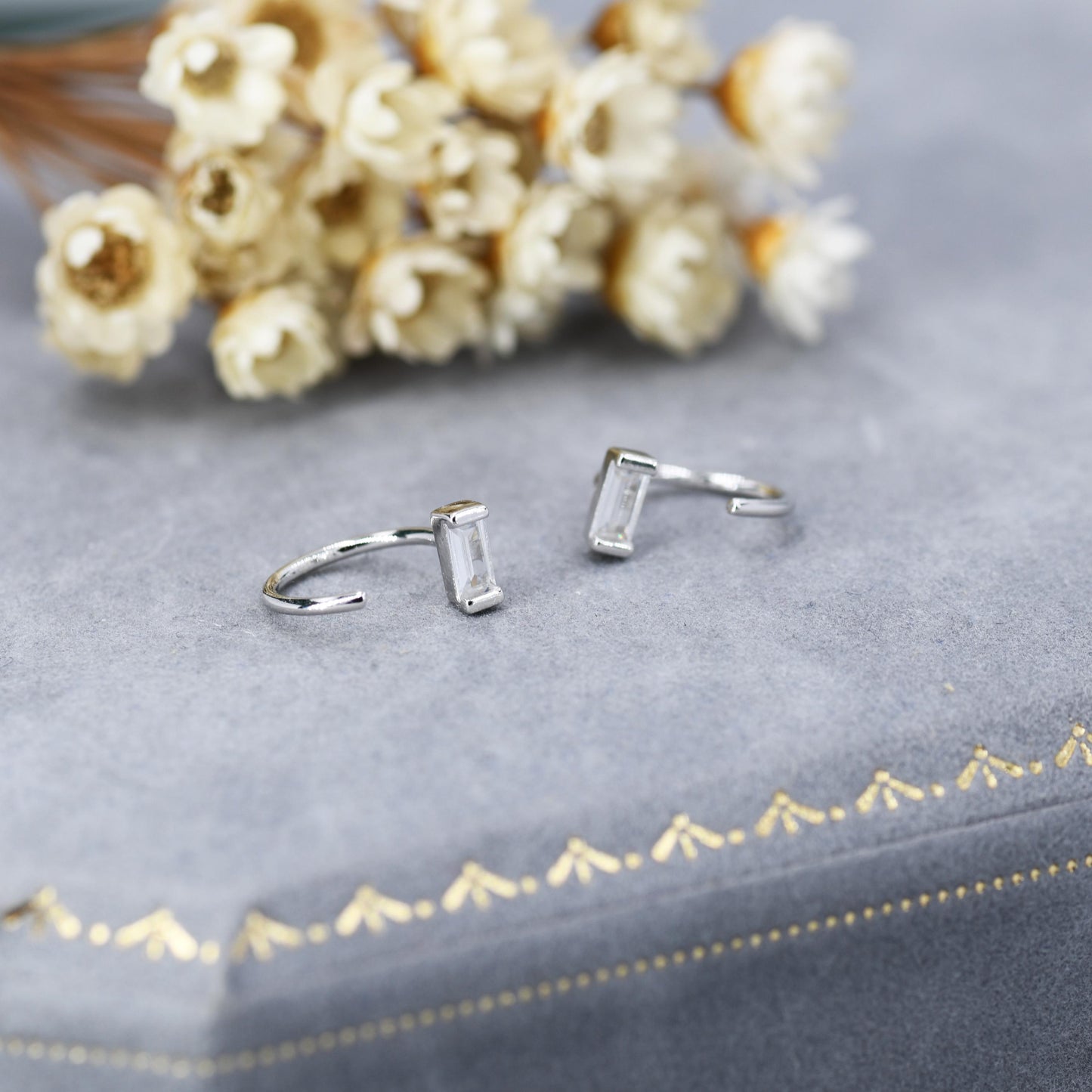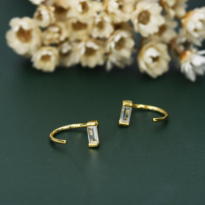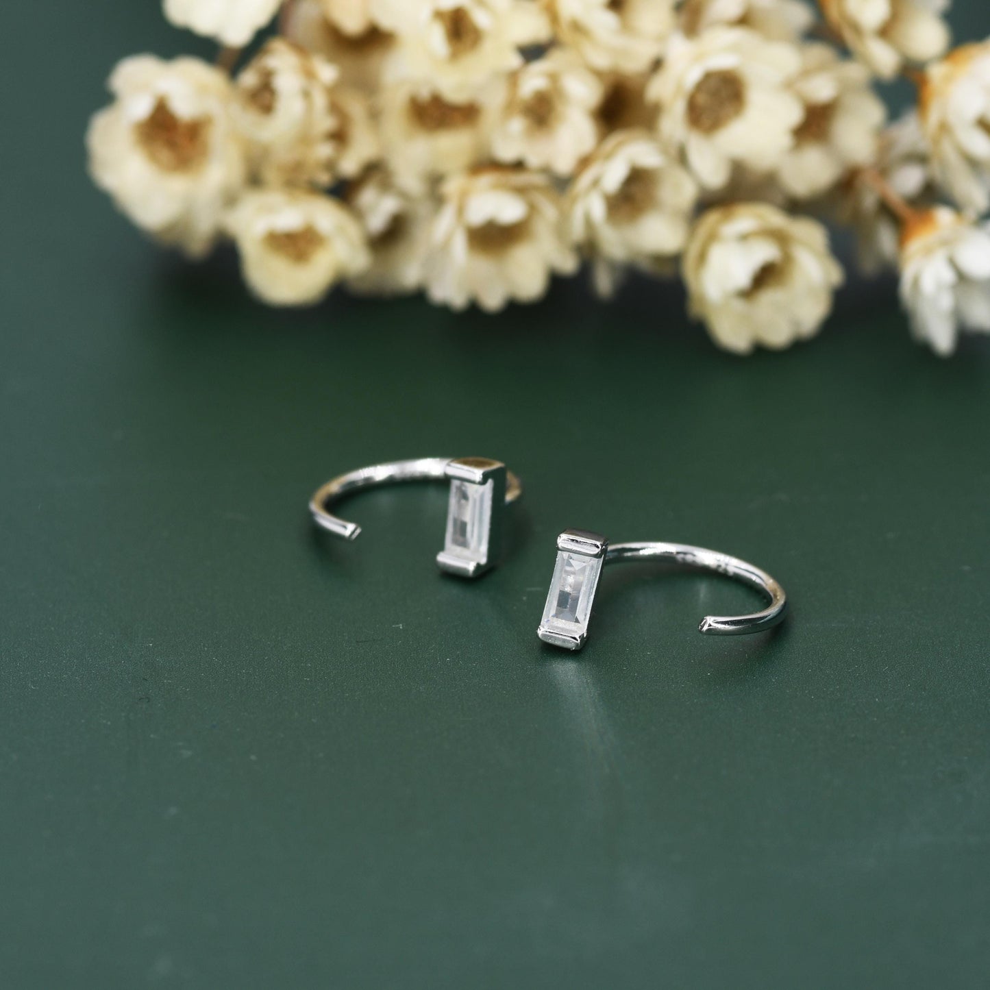 Horizontal Baguette Cut CZ Huggie Hoop Earrings in Sterling Silver, Silver or Gold, Open Hoops, Pull-Through Threader Earrings