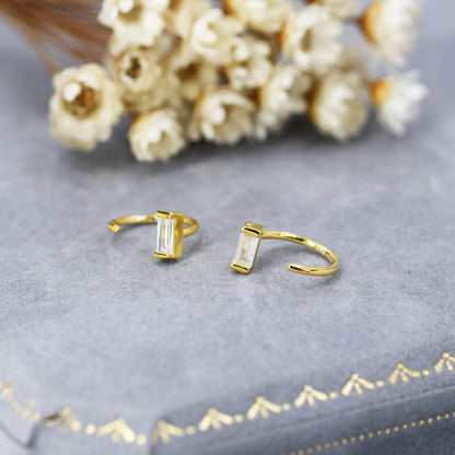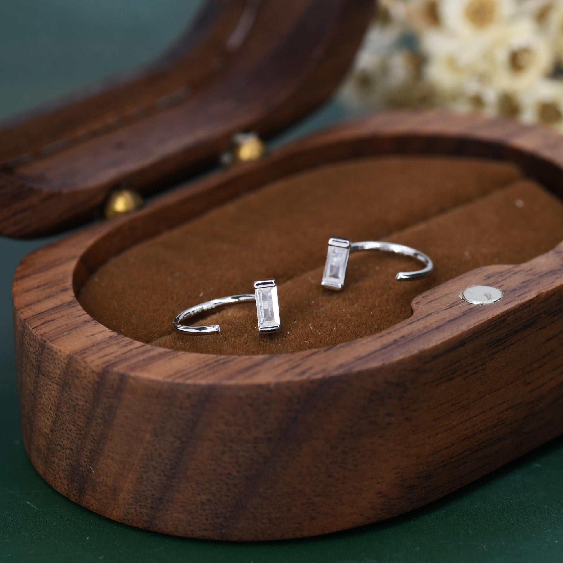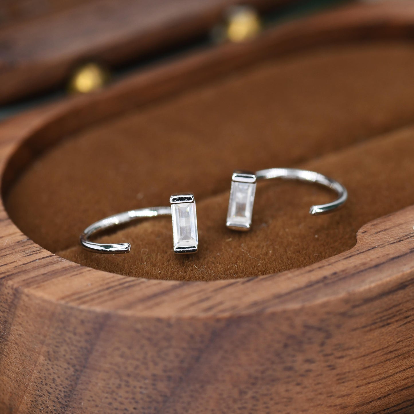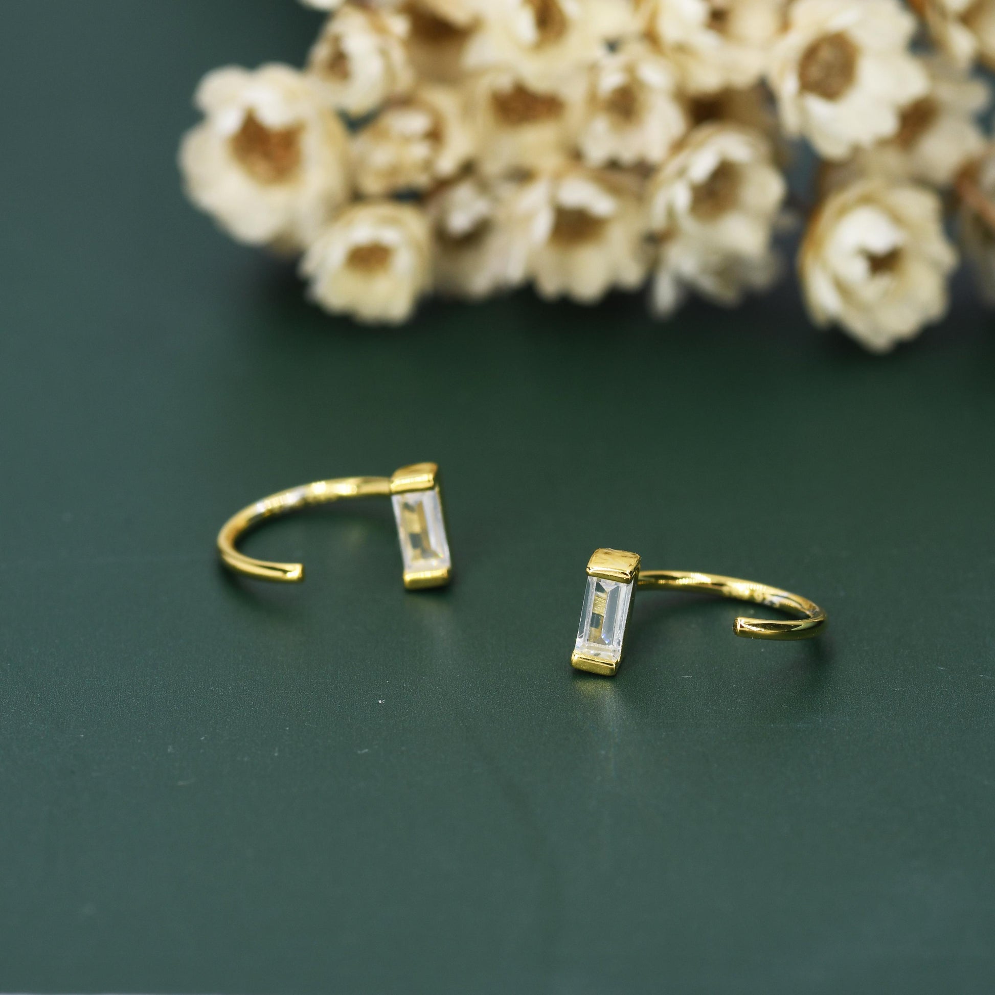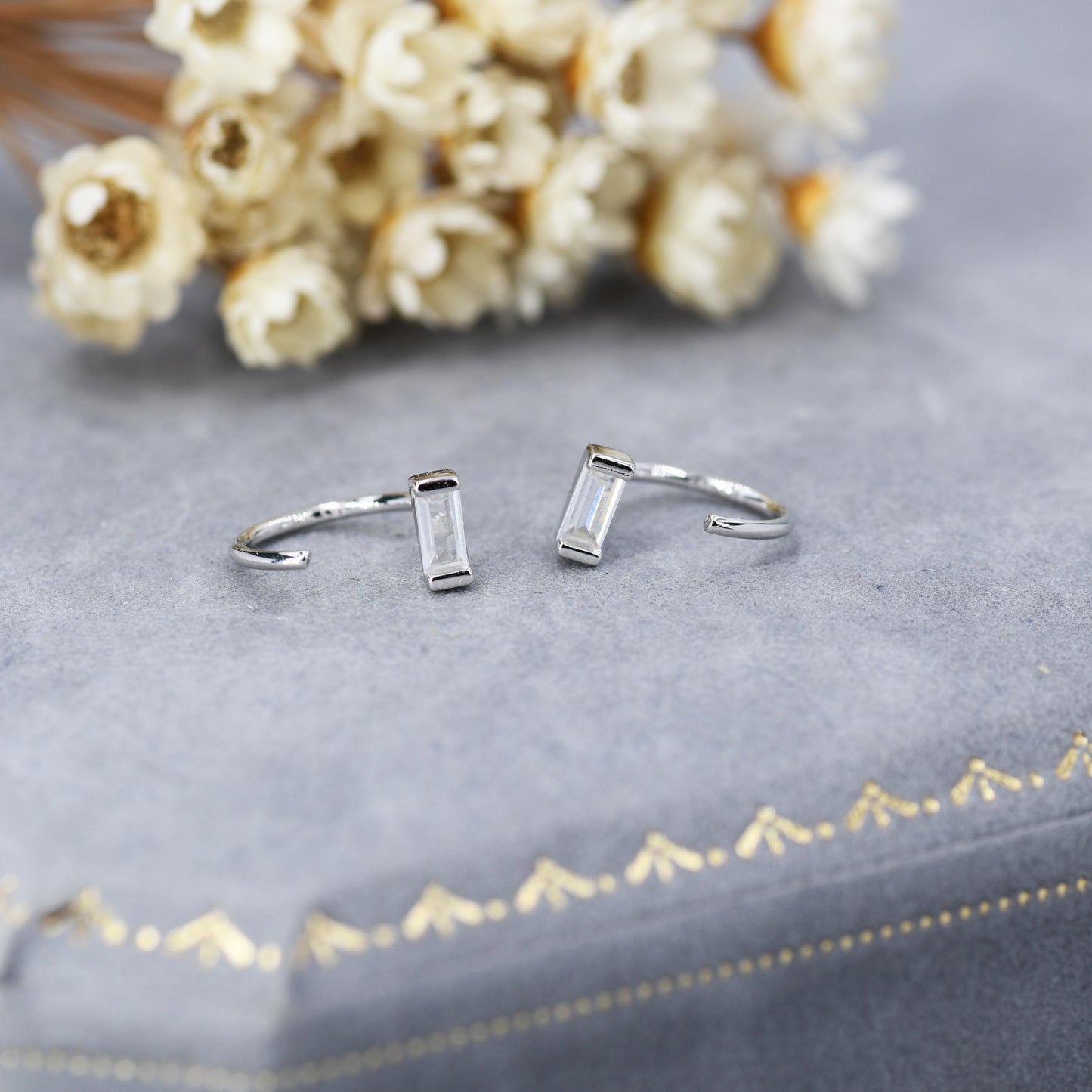 Horizontal Baguette Cut CZ Huggie Hoop Earrings in Sterling Silver, Silver or Gold, Open Hoops, Pull-Through Threader Earrings