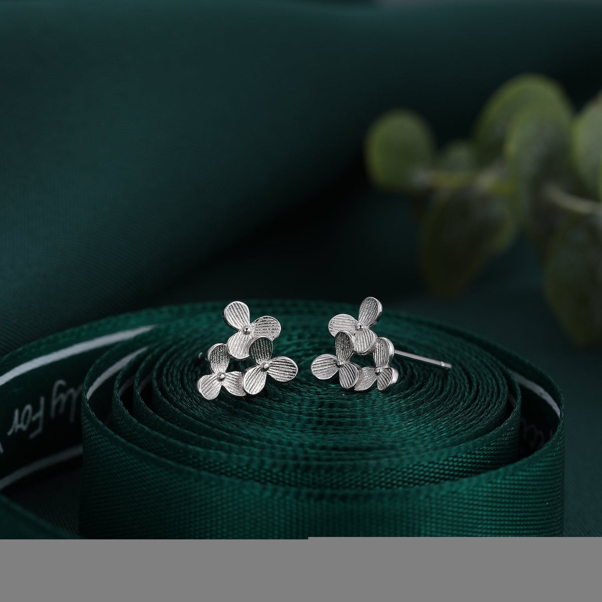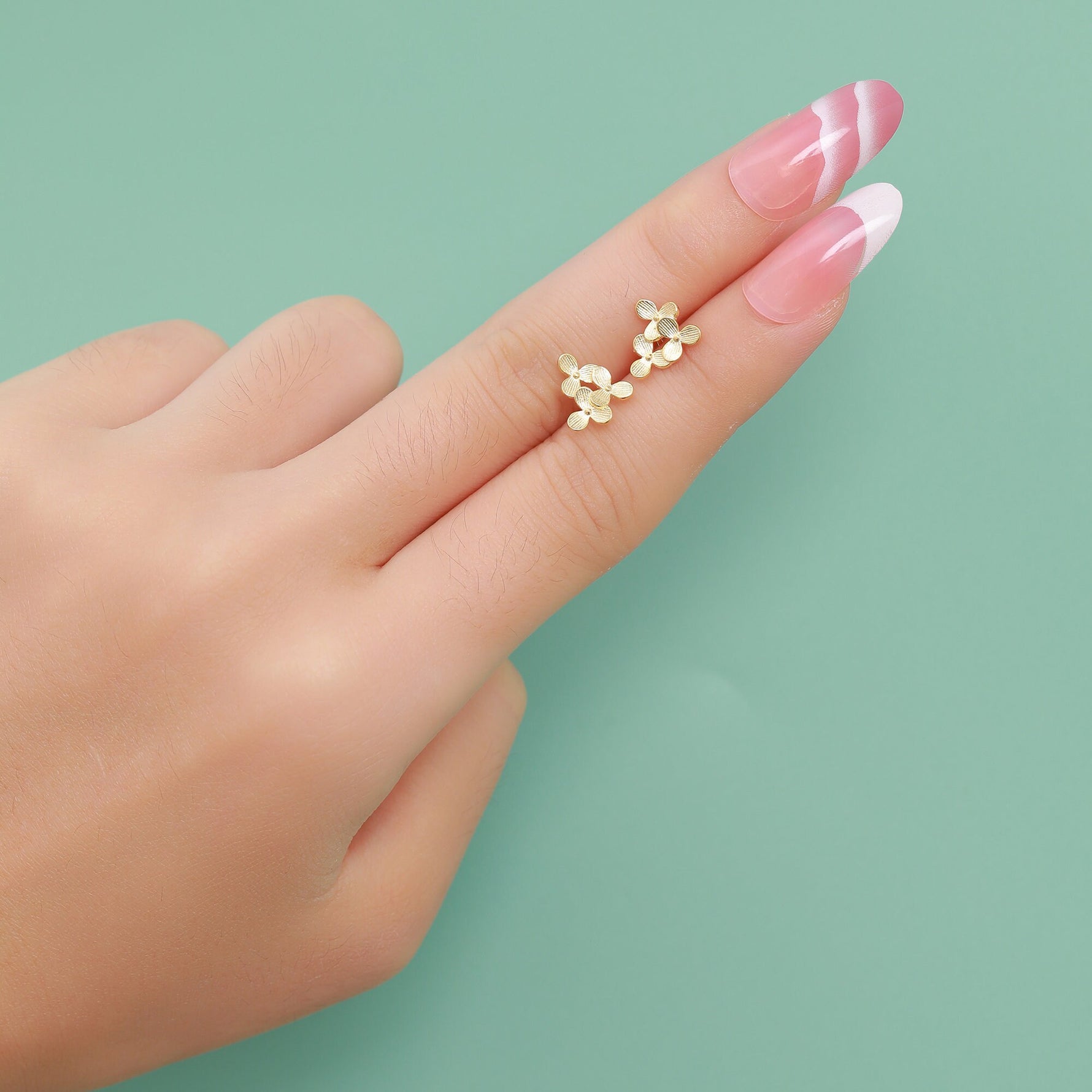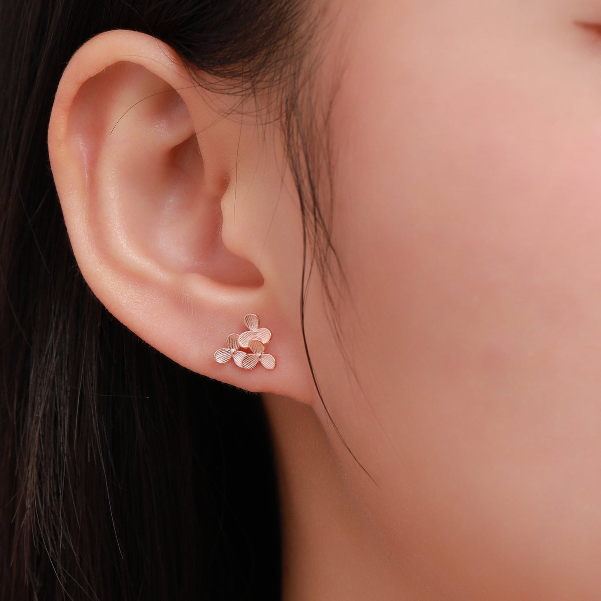 A dainty pair of earrings featuring the design of three Hydrangea flowers.