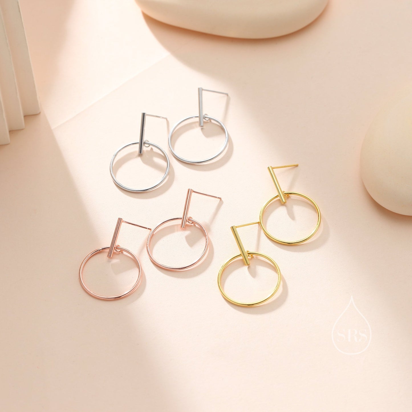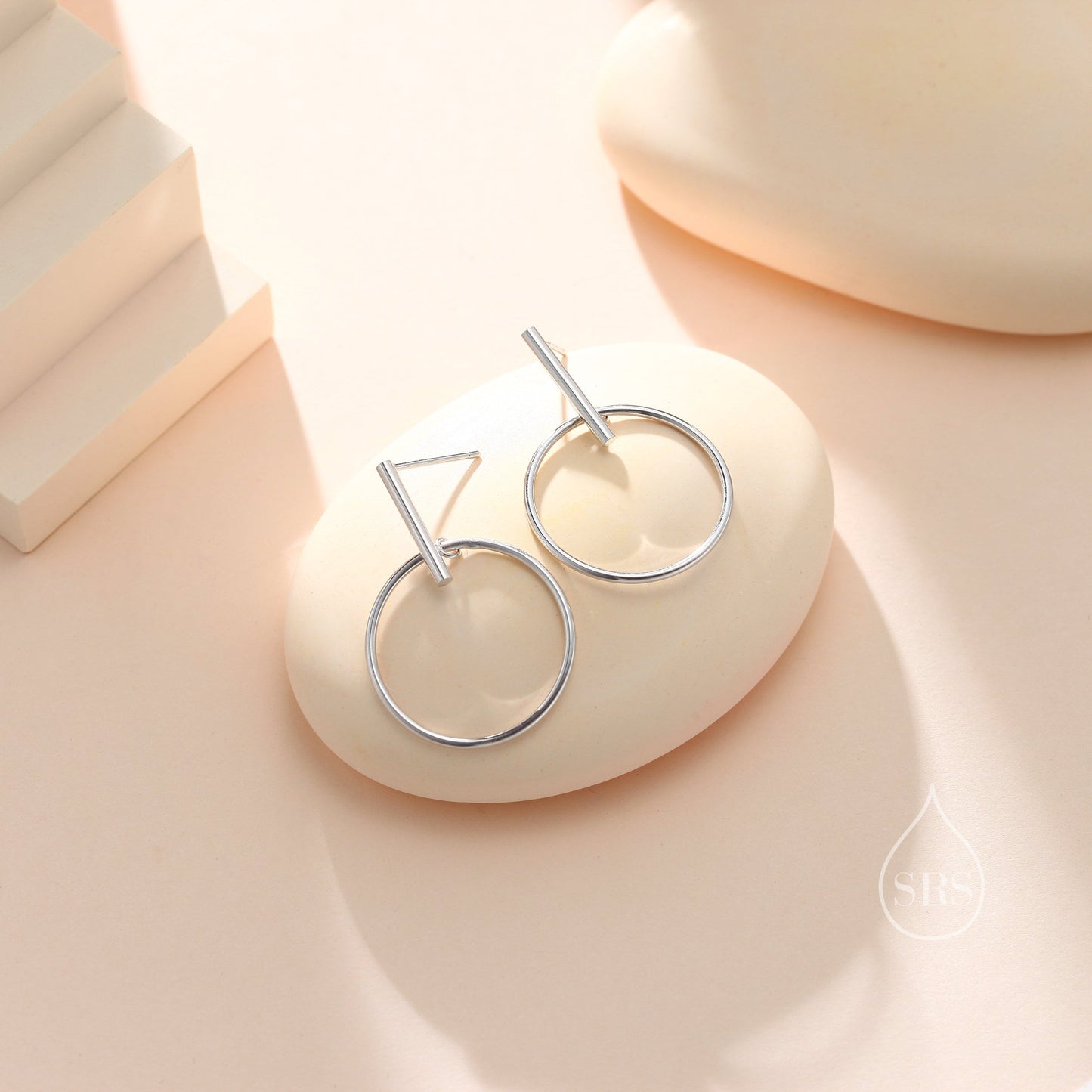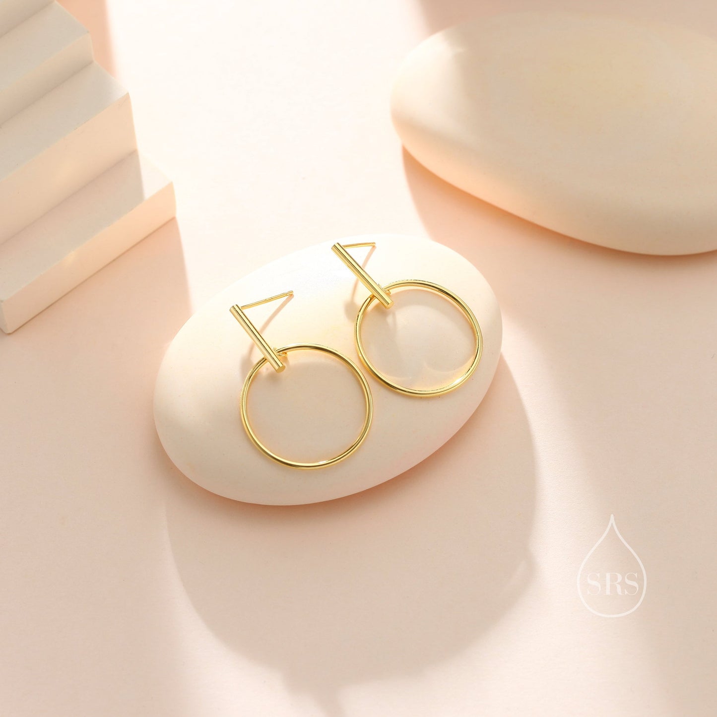 Large Dangle Circle and Bar Stud Earrings in Sterling Silver, Silver, Gold or Rose Gold, Geometric Circle Dangle Earrings