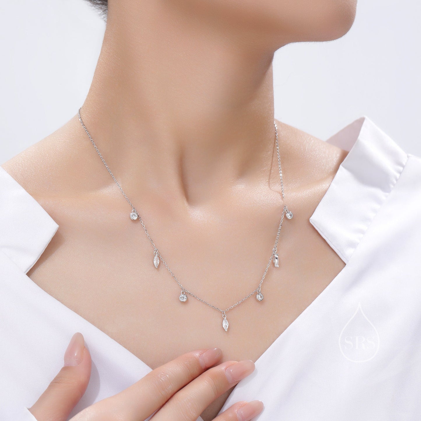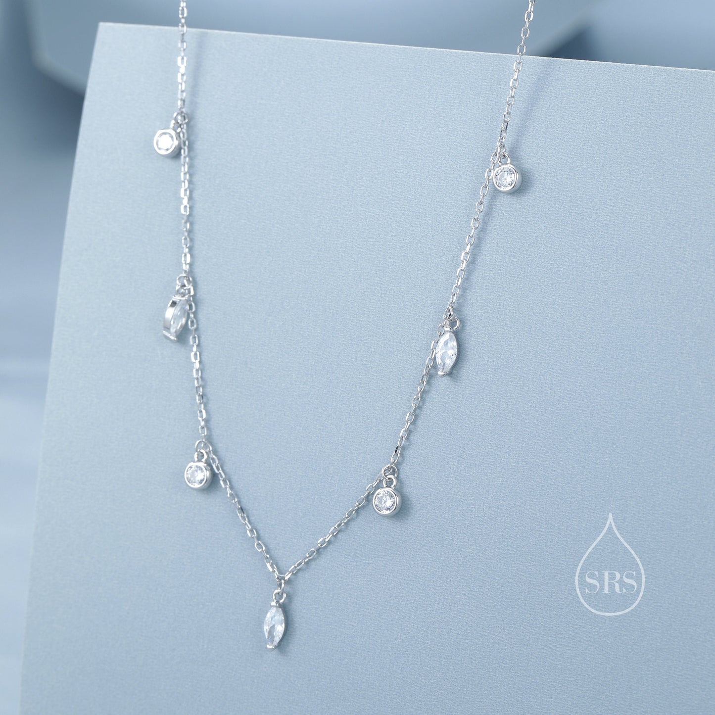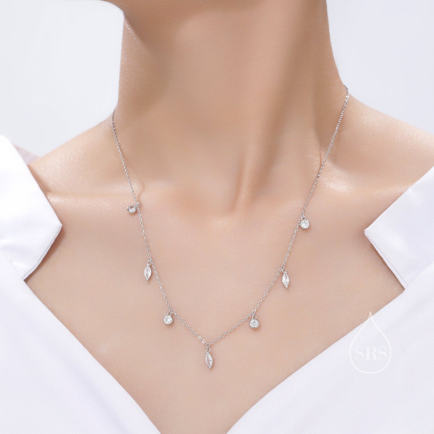 Marquise and Round CZ Dangle Necklace in Sterling Silver, Silver or Gold, Satellite Crystal Necklace, Solid Silver Motif Necklace