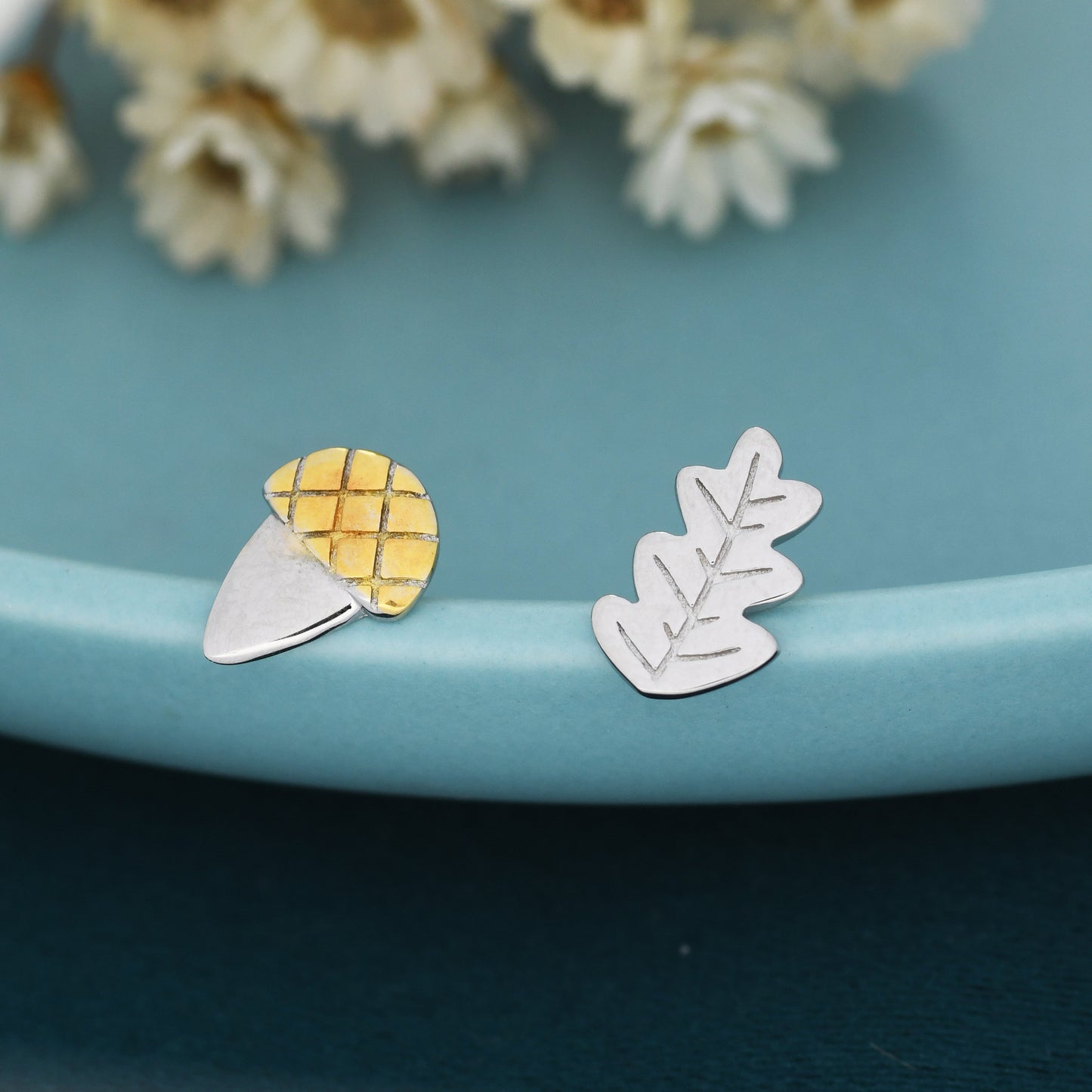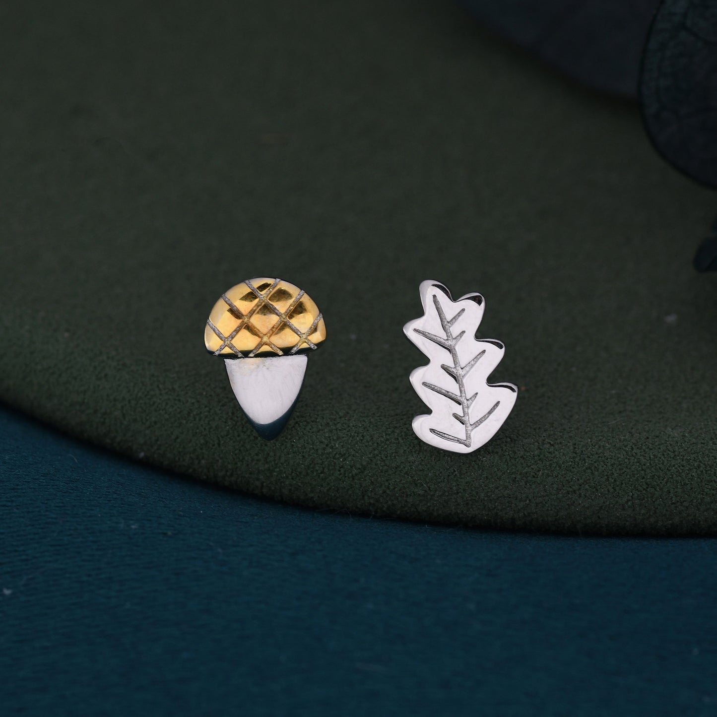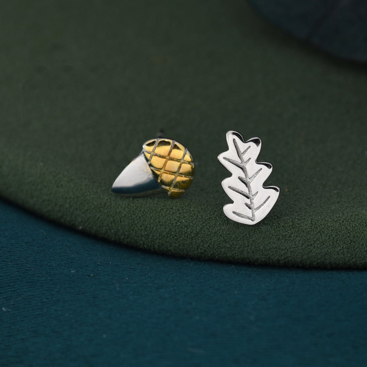 Mismatched Acorn and Oak Leaf Stud Earrings in Sterling Silver, Petite Earrings, Small Leaf Stud, Nature Inspired