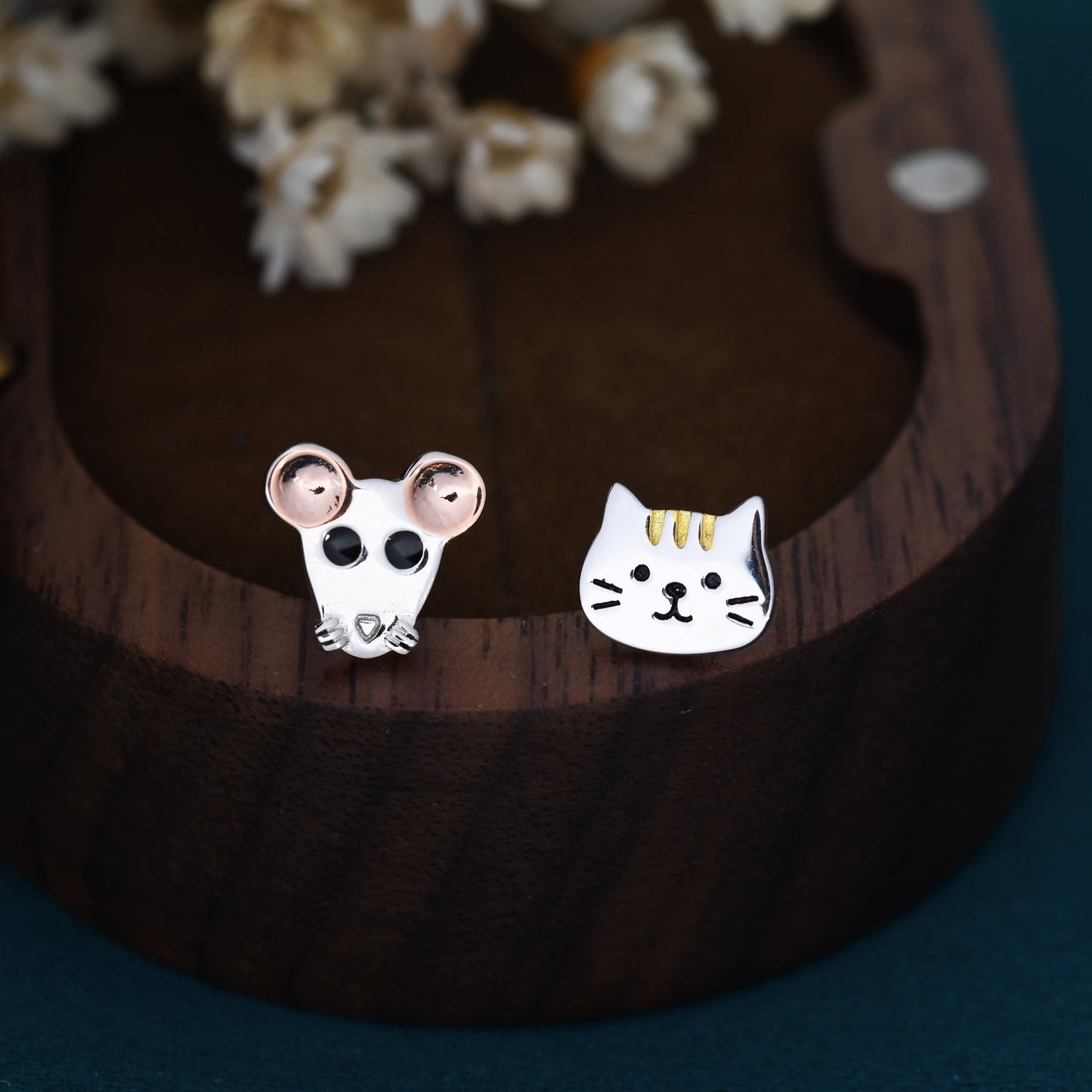 Mismatched Cat and Mouse Stud Earrings in Sterling Silver, Asymmetric Cat and Mouse Earrings, Cute Cat Lover Earrings
