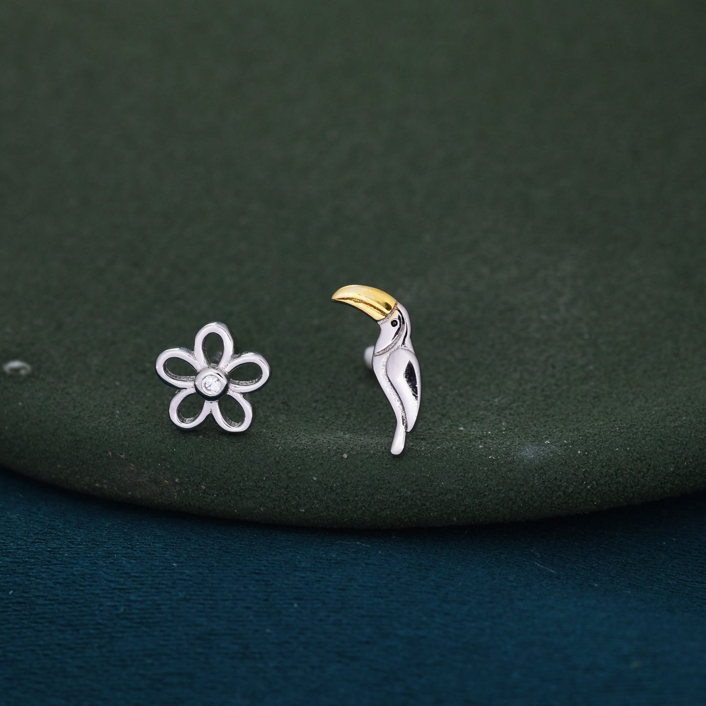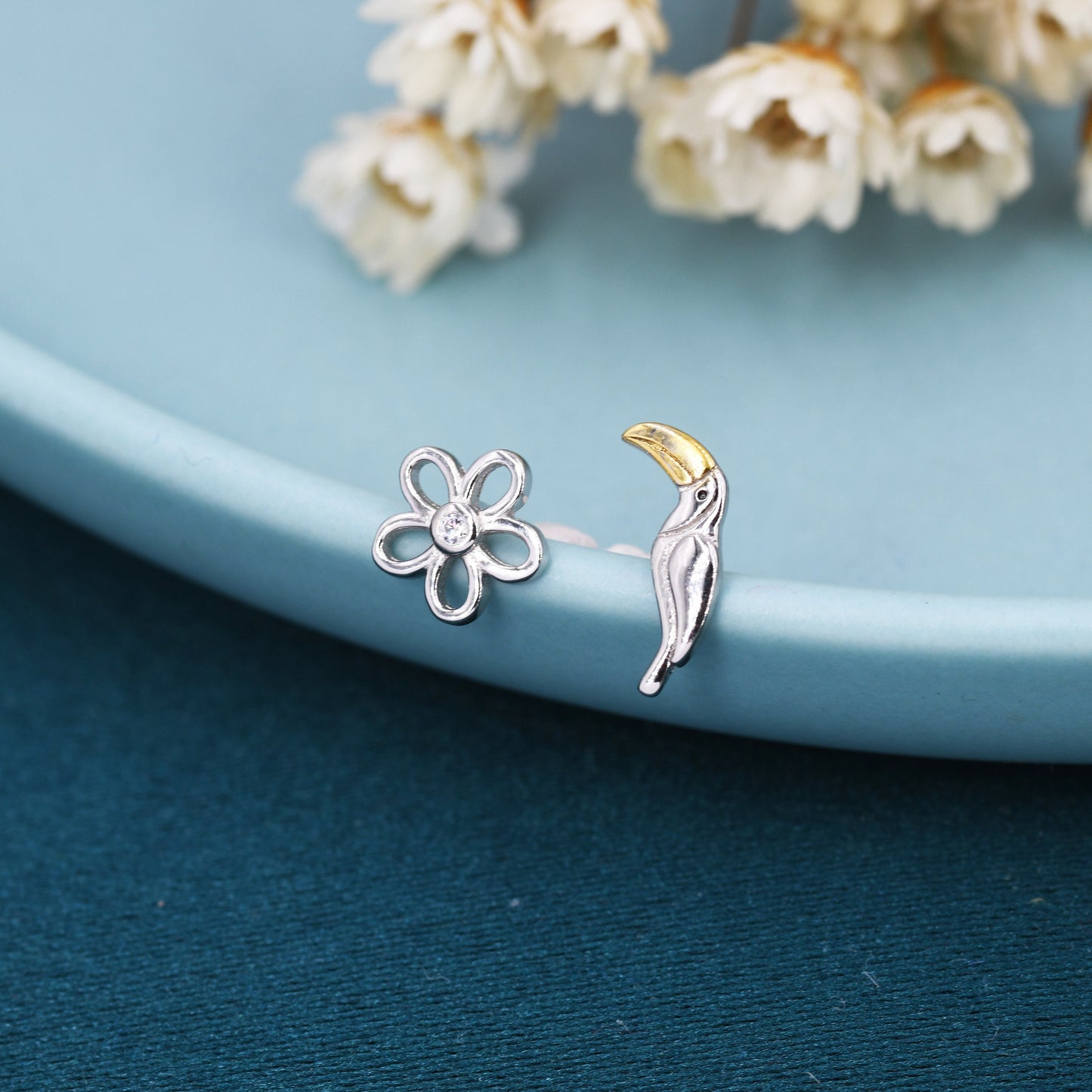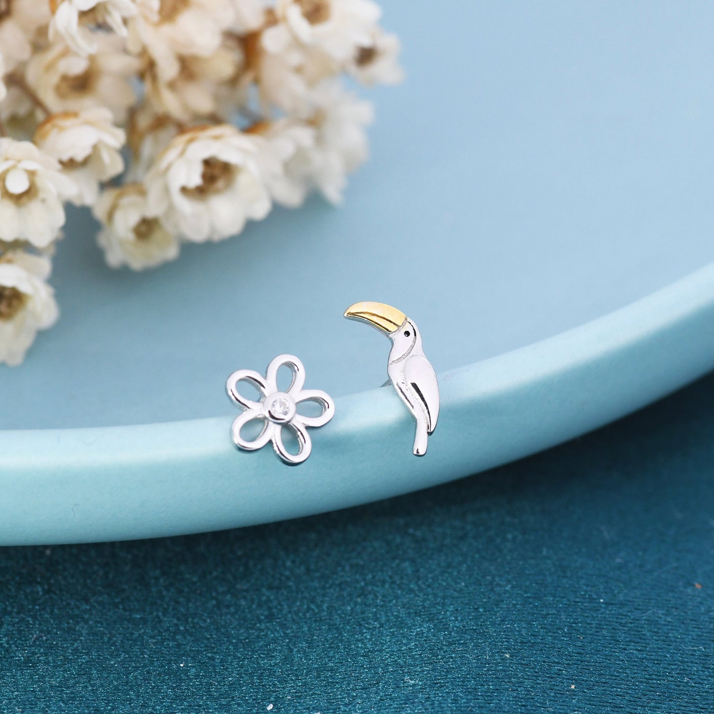 Mismatched Toucan and Flower Stud Earrings in Sterling Silver, Asymmetric Toucan Bird and Daisy Earrings