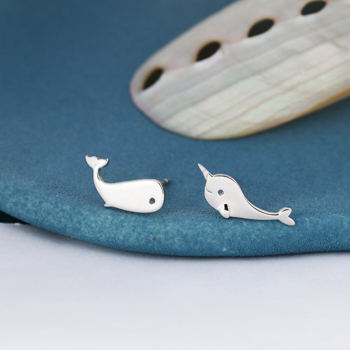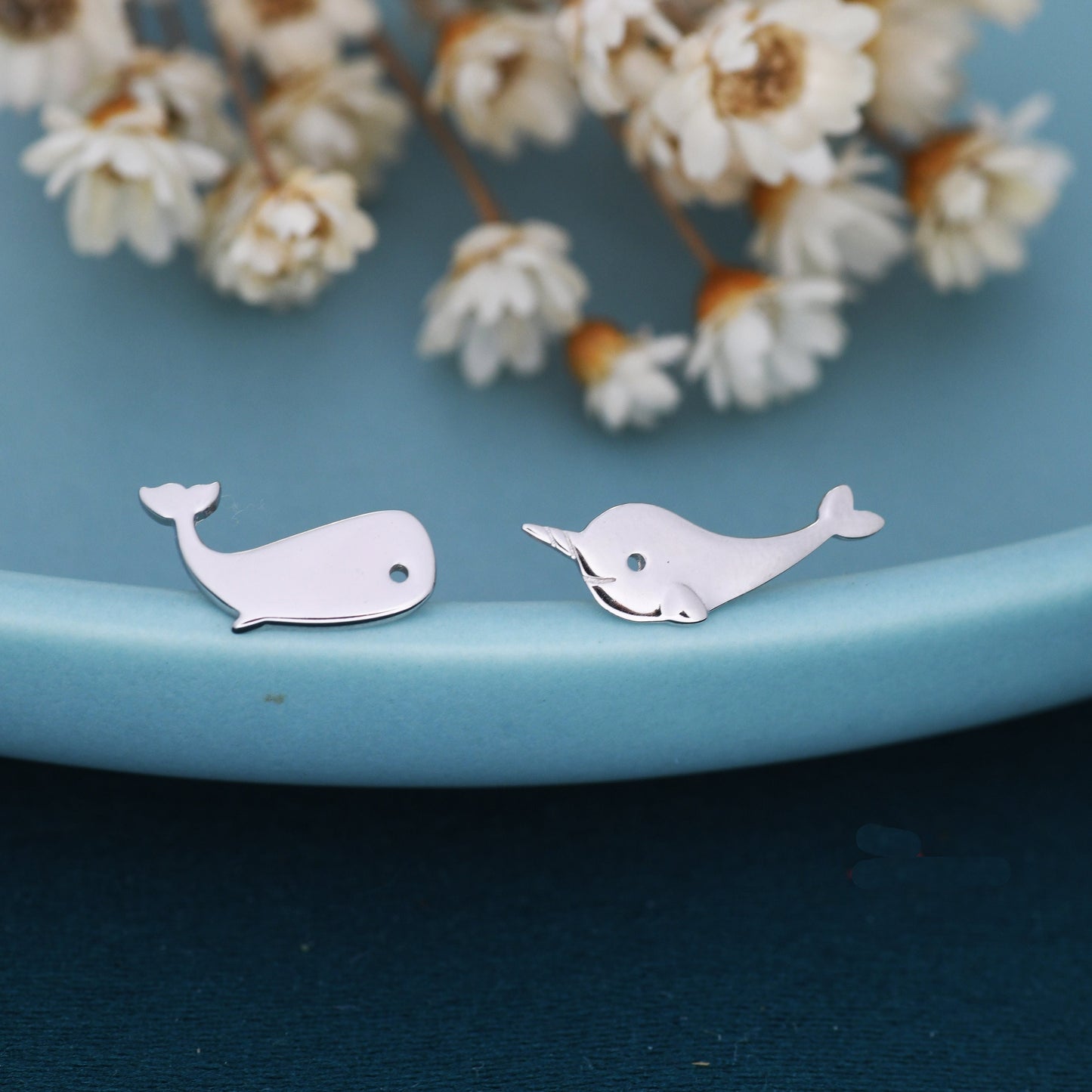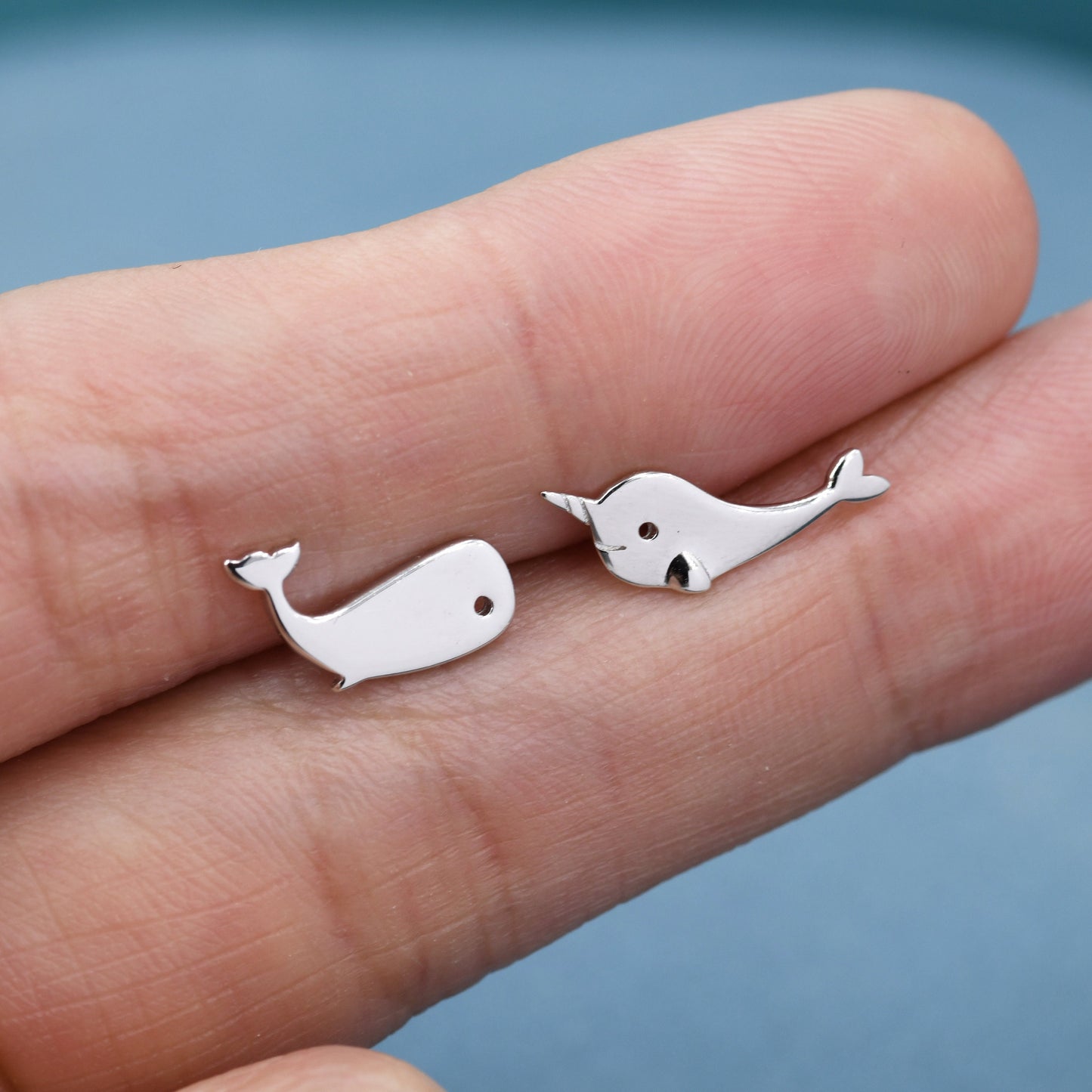 Mismatched Whale and Narwhale Stud Earrings in Sterling Silver, Whale Fish Earrings, Tiny Fish Earrings, Whale Earrings