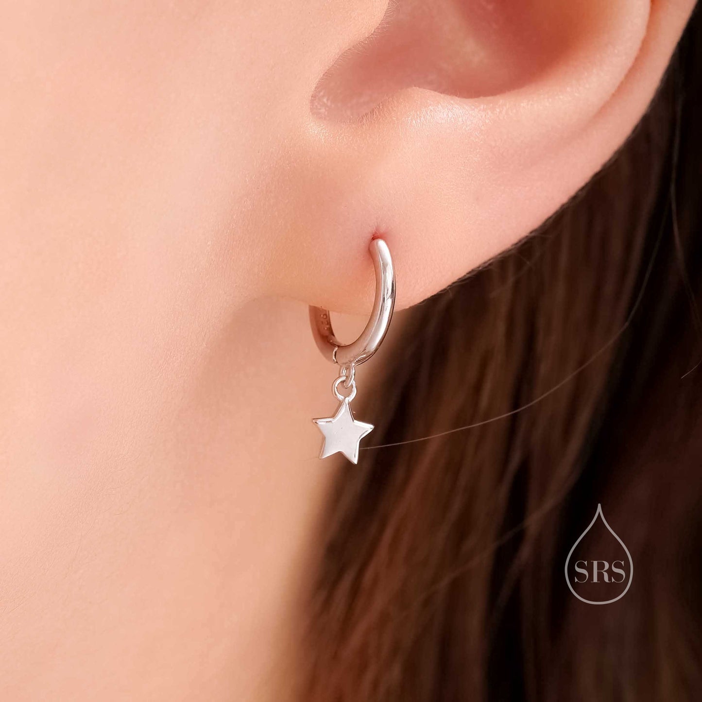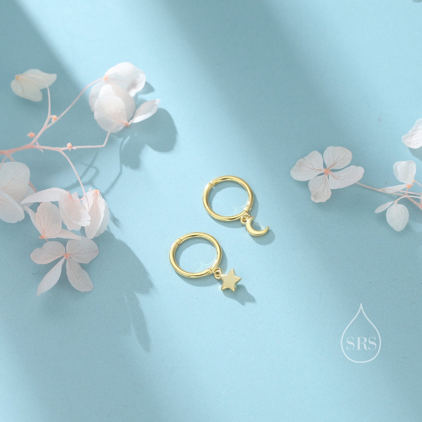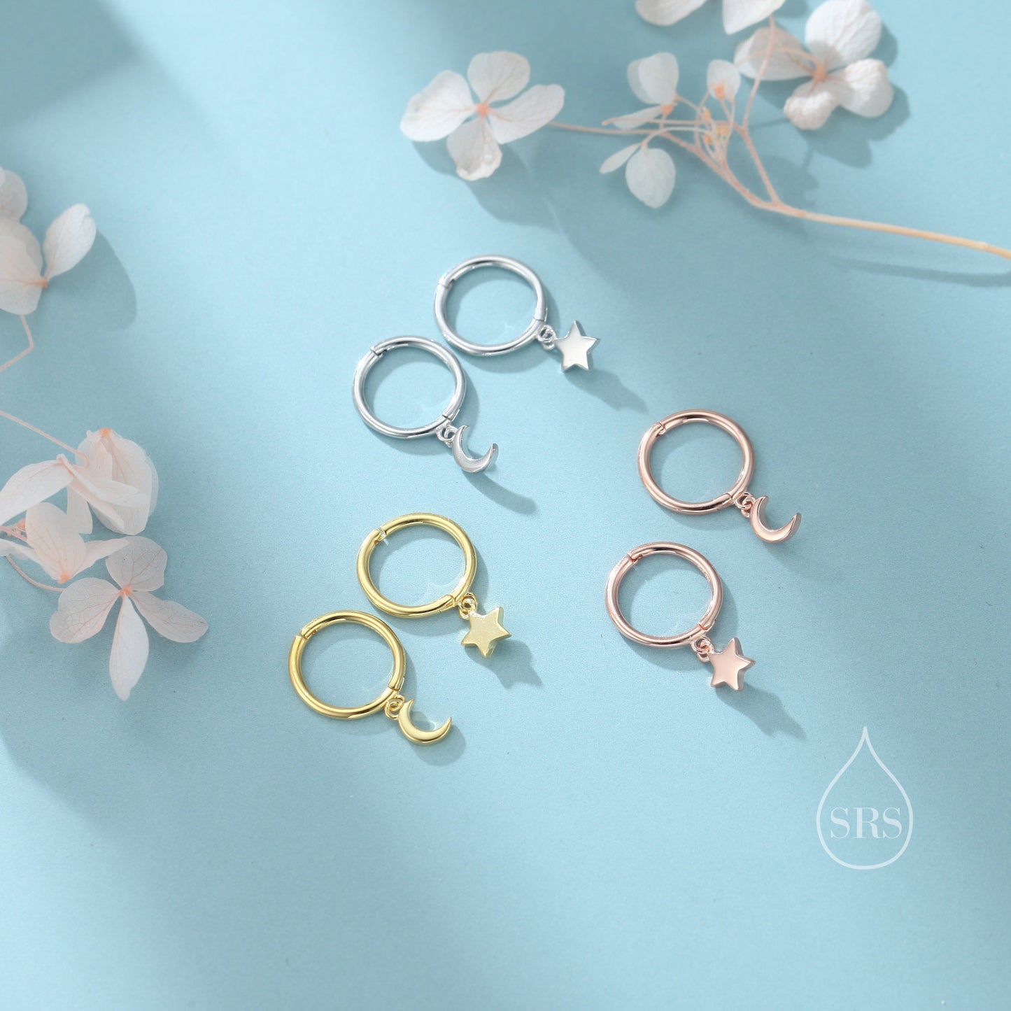 Moon and Star Dangle Huggie Hoop Earrings in Sterling Silver, Silver or Gold or Rose Gold, Moon and Star Skinny Hoops