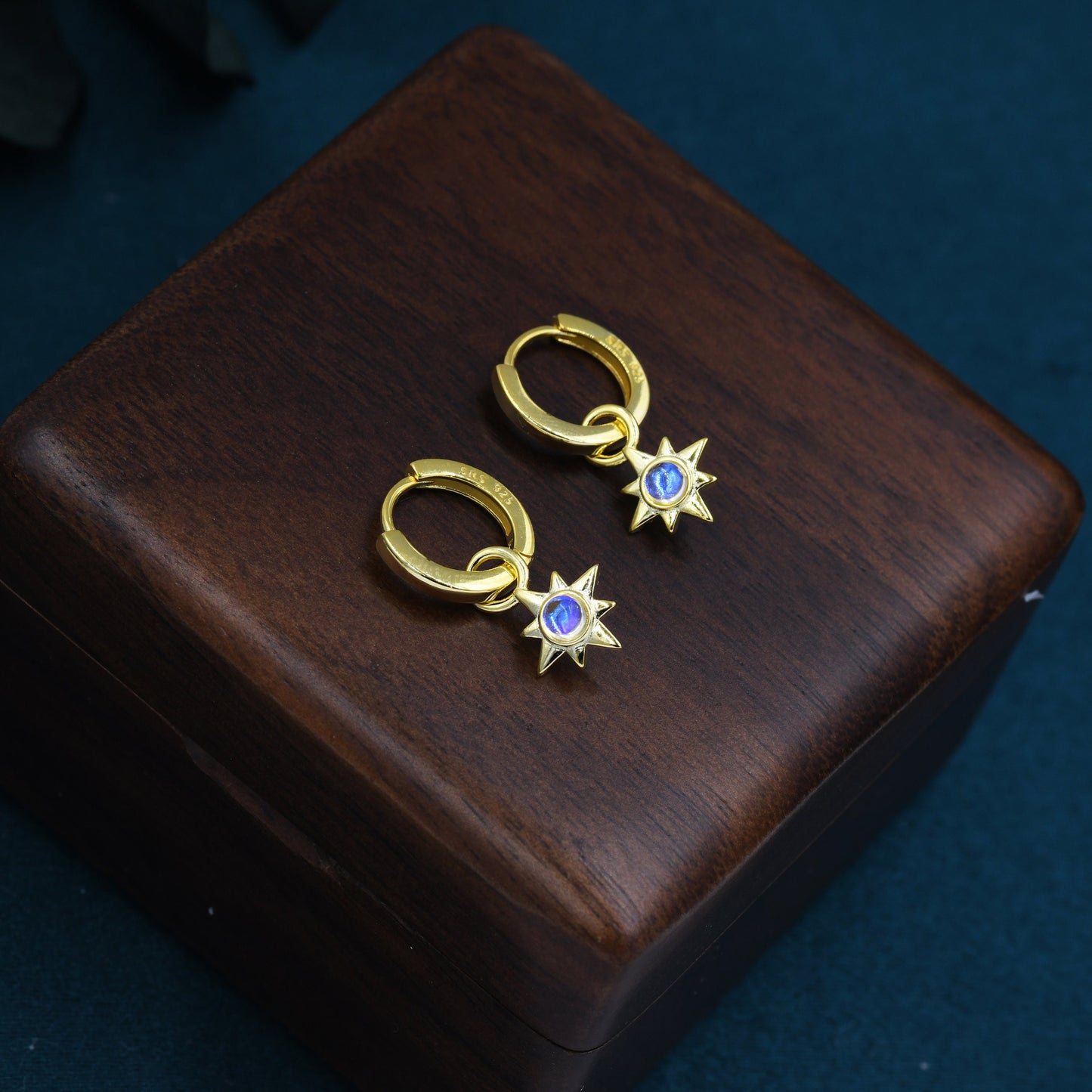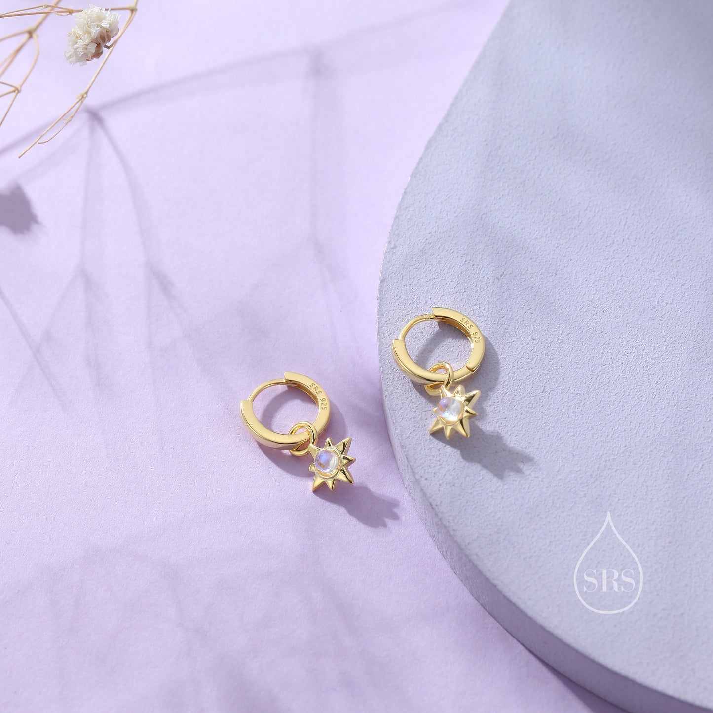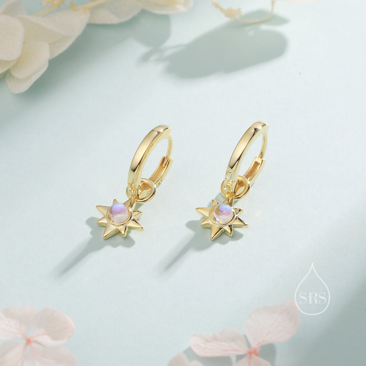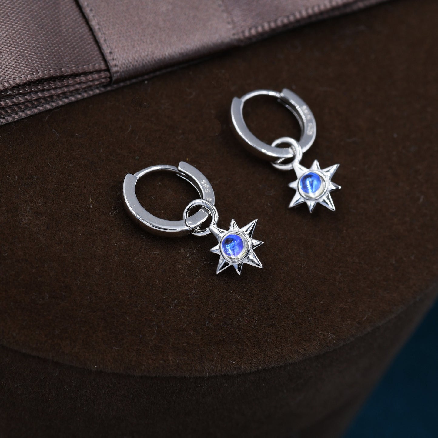 Moonstone Starburst Huggie Hoop Earrings in Sterling Silver, Simulated Moonstone North Star Detachable Drop Earrings, Delicate Star Earrings