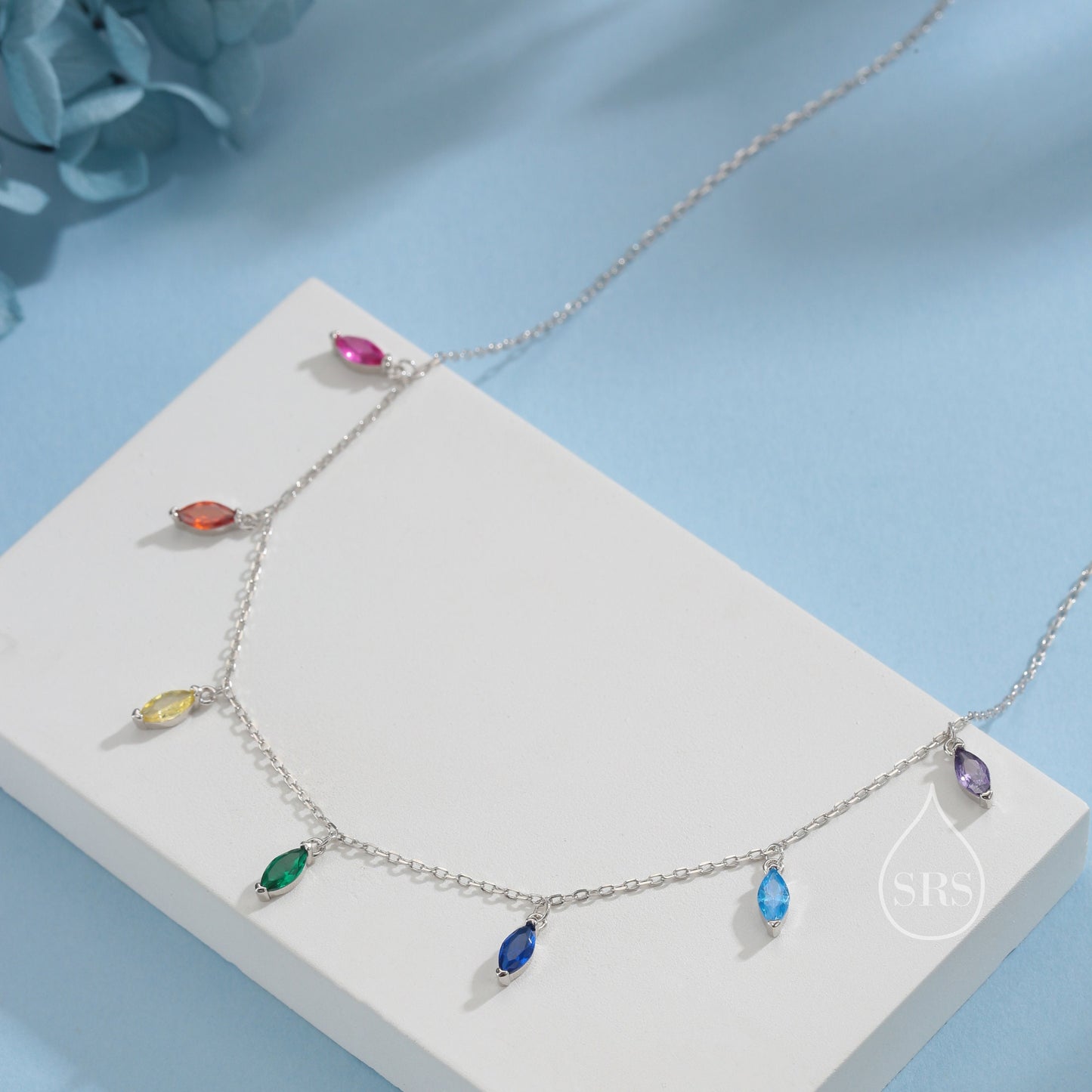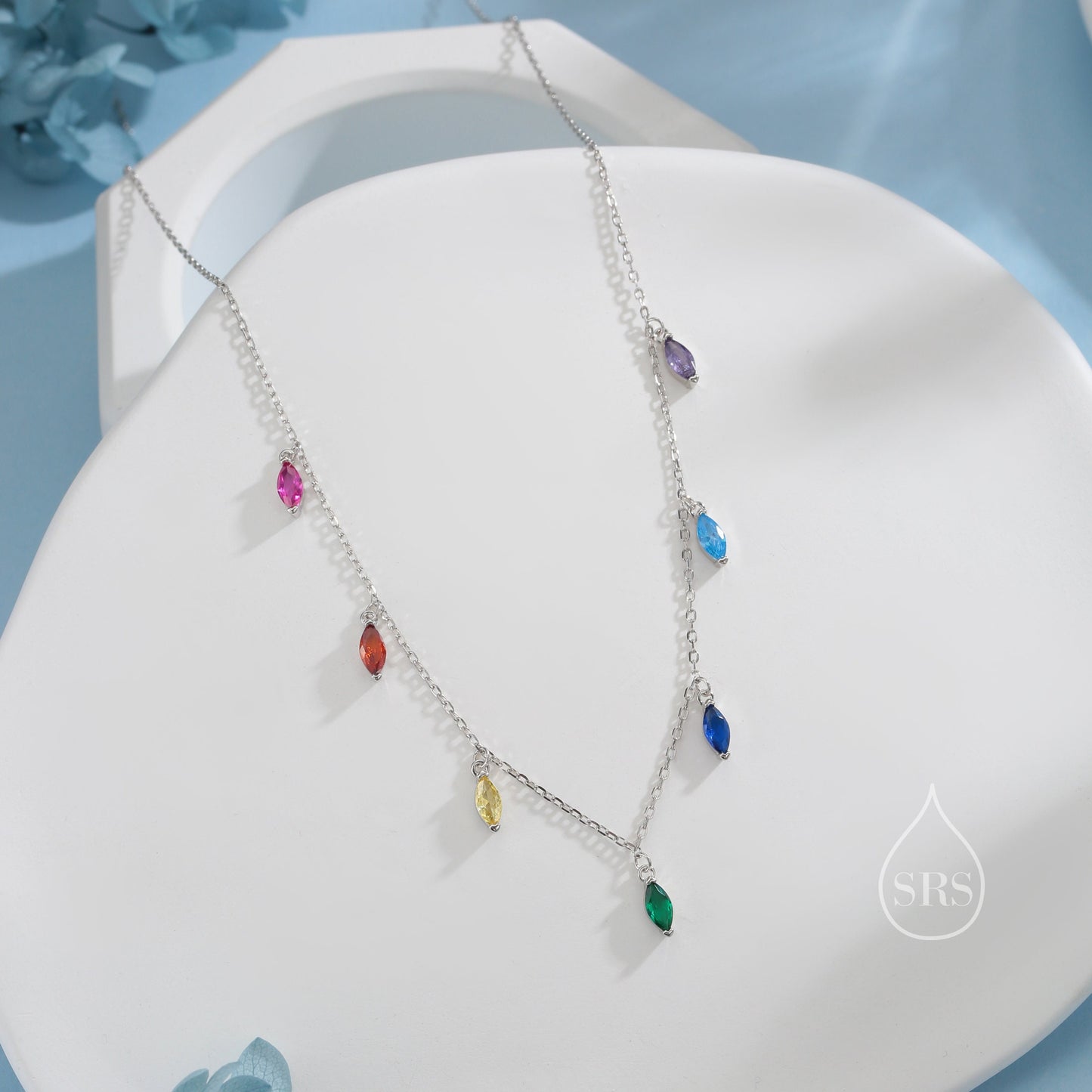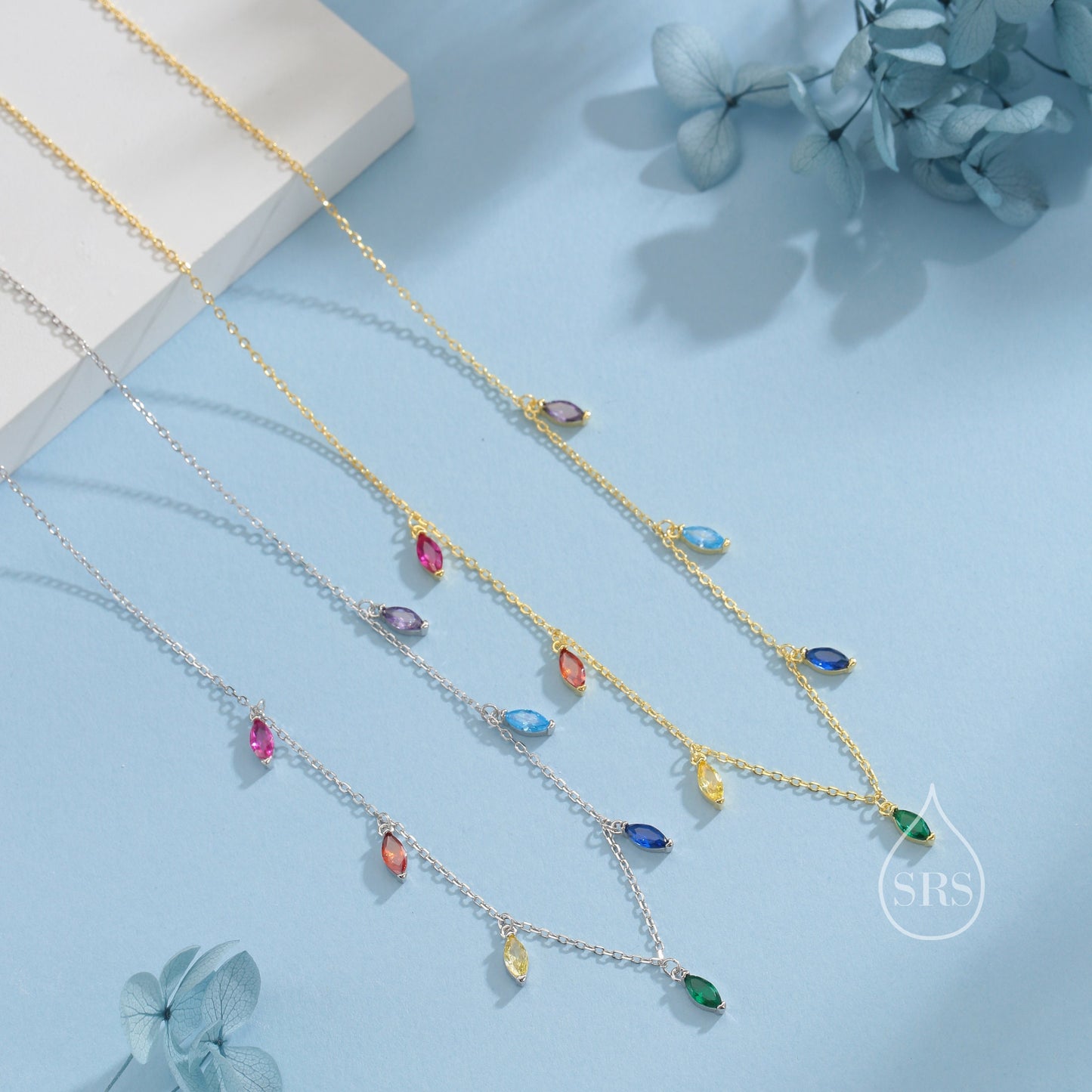 Multiple Colour CZ Marquise Pendant Necklace in Sterling Silver, Silver or Gold, Rainbow Marquise Charm Necklace, Droplet Satellite Necklace