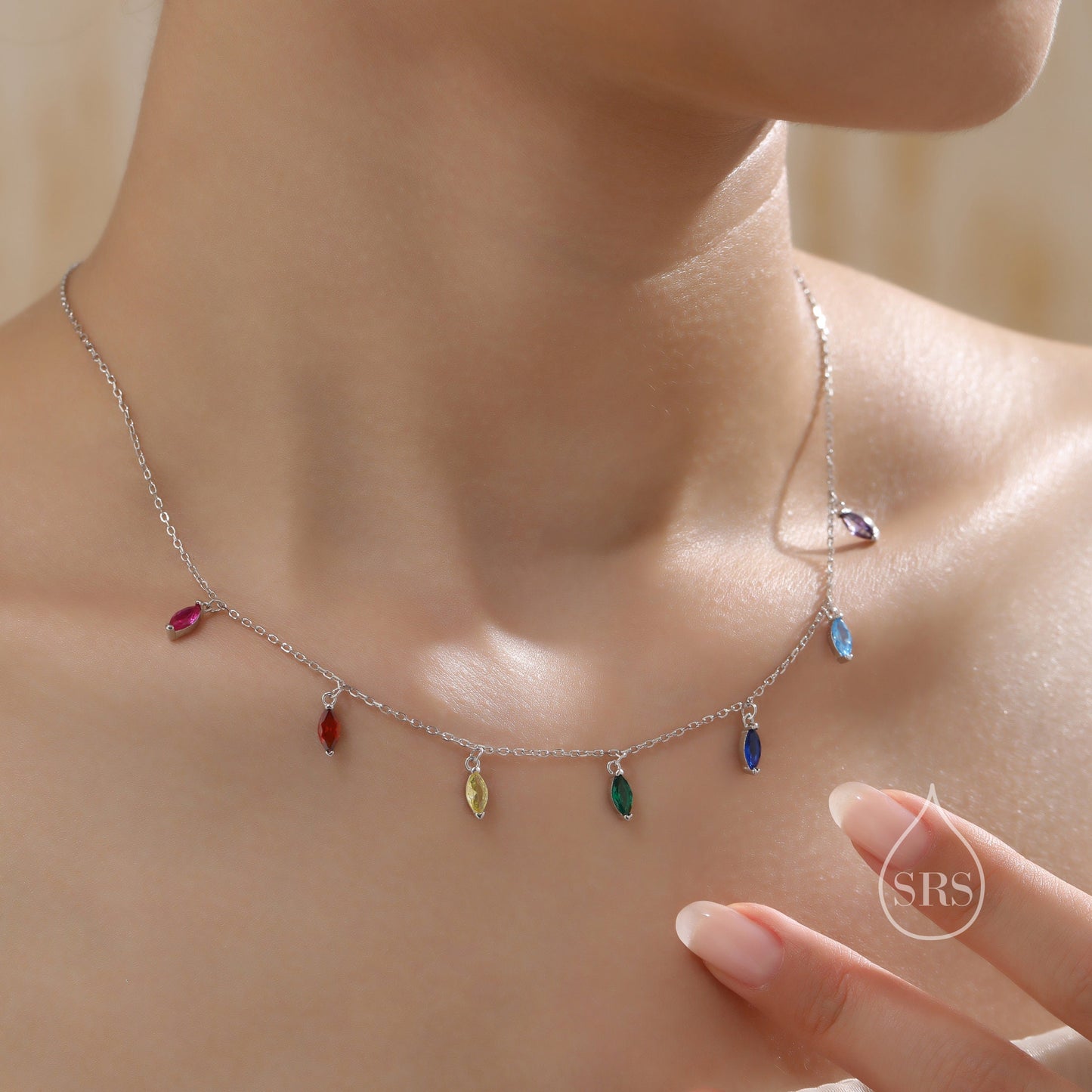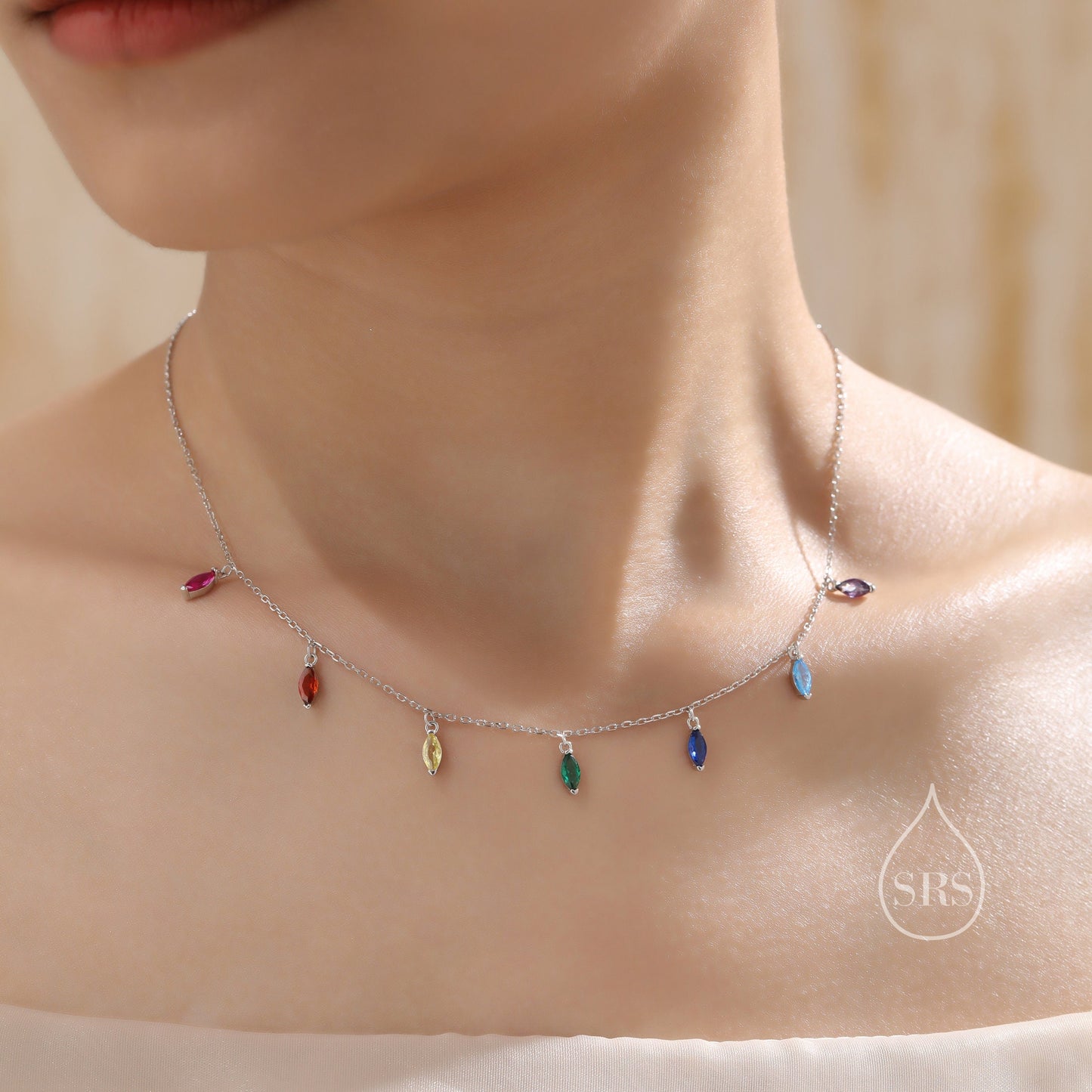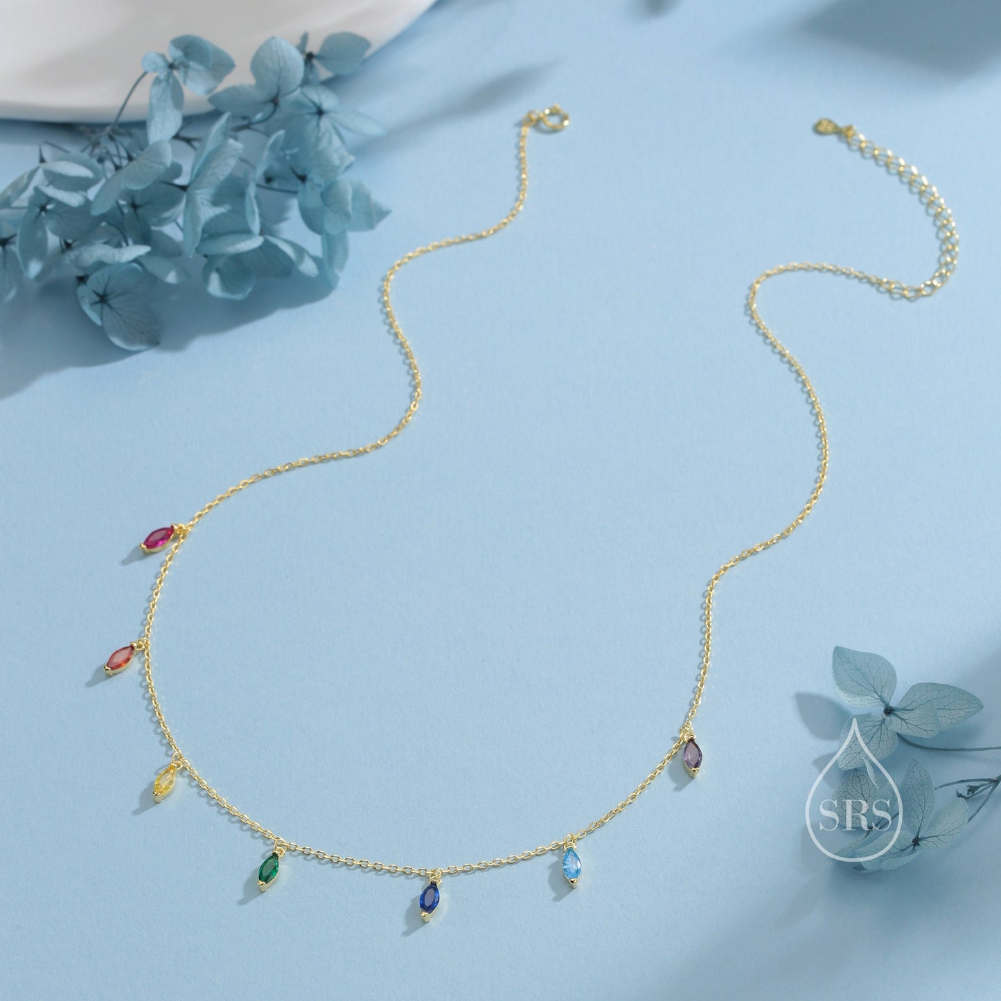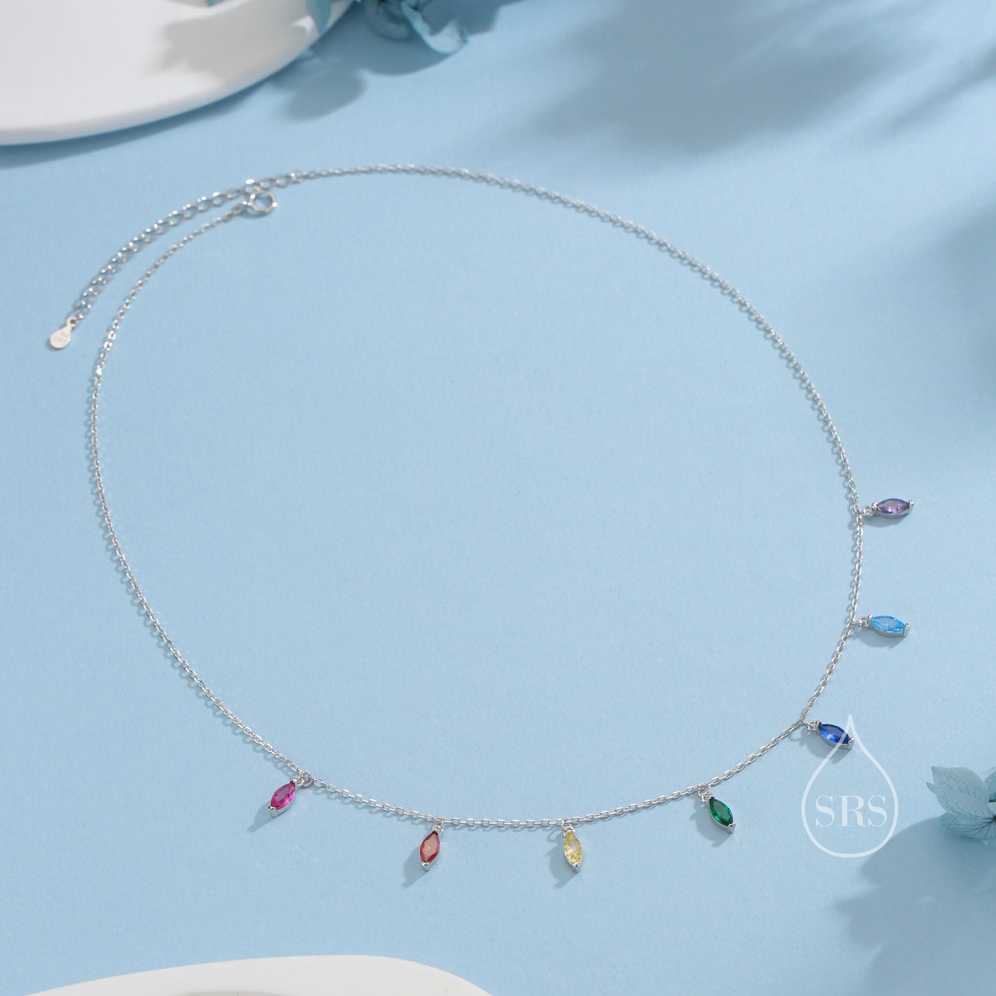 Multiple Colour CZ Marquise Pendant Necklace in Sterling Silver, Silver or Gold, Rainbow Marquise Charm Necklace, Droplet Satellite Necklace