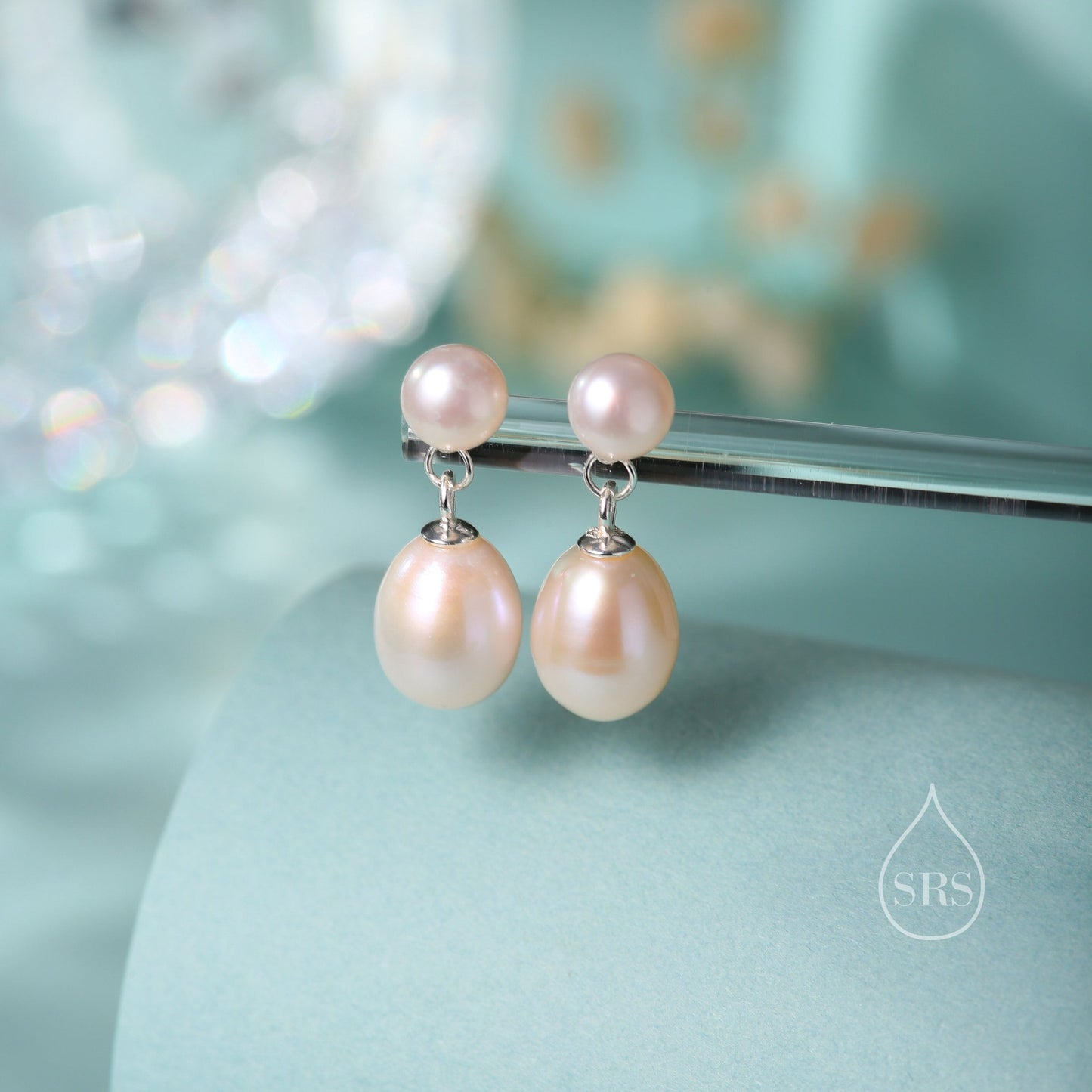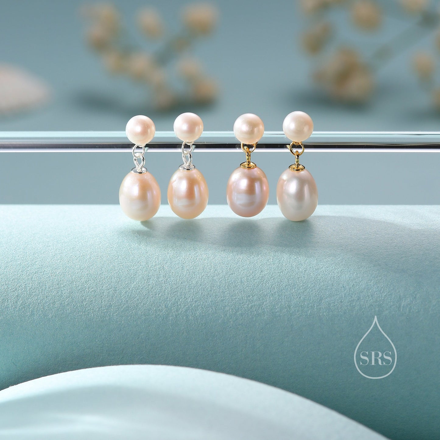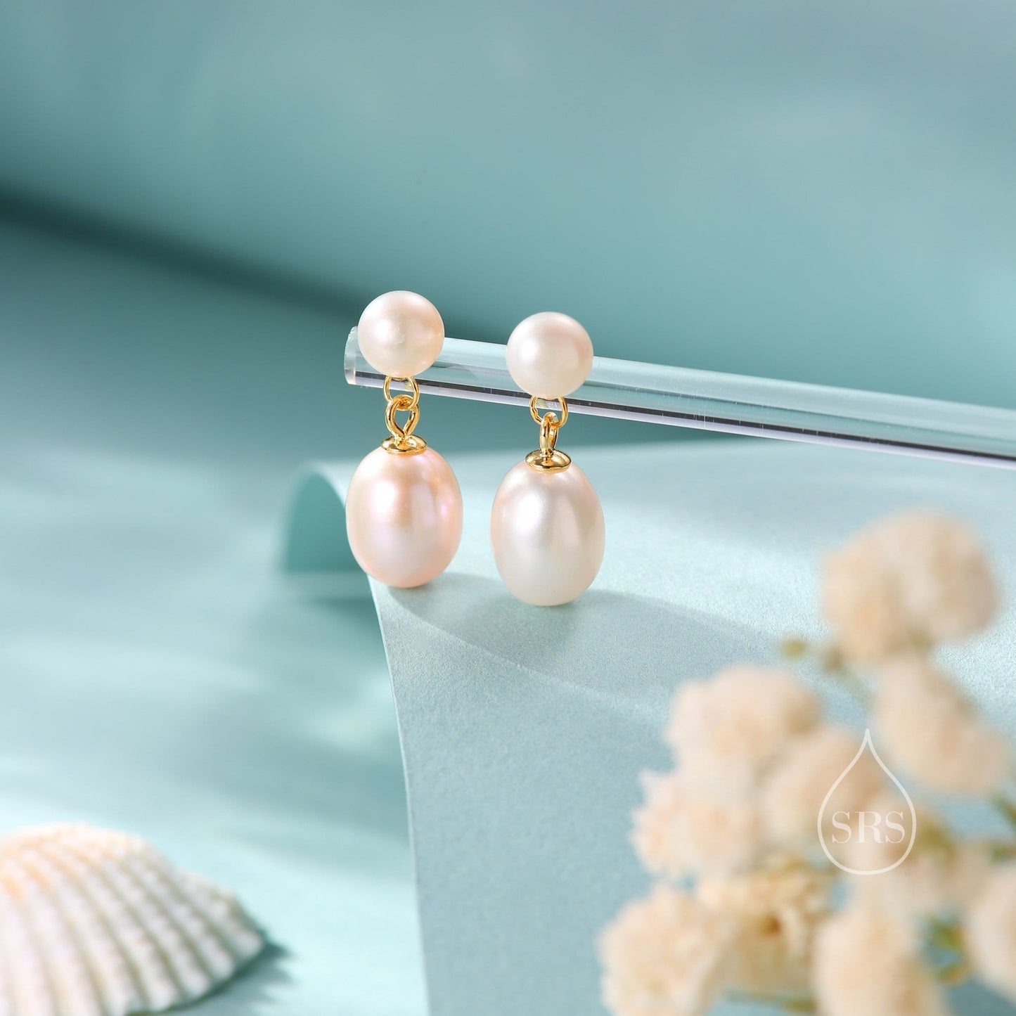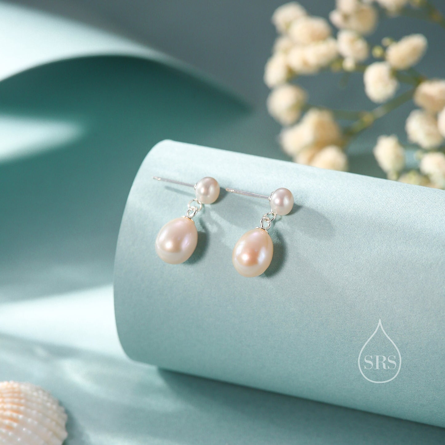 Sold as a pair. Natural Freshwater Pearl Drop Earrings in Sterling Silver, Silver or Gold, Delicate Double Pearl Earrings, Double Pearl Stud Dangle Earringss