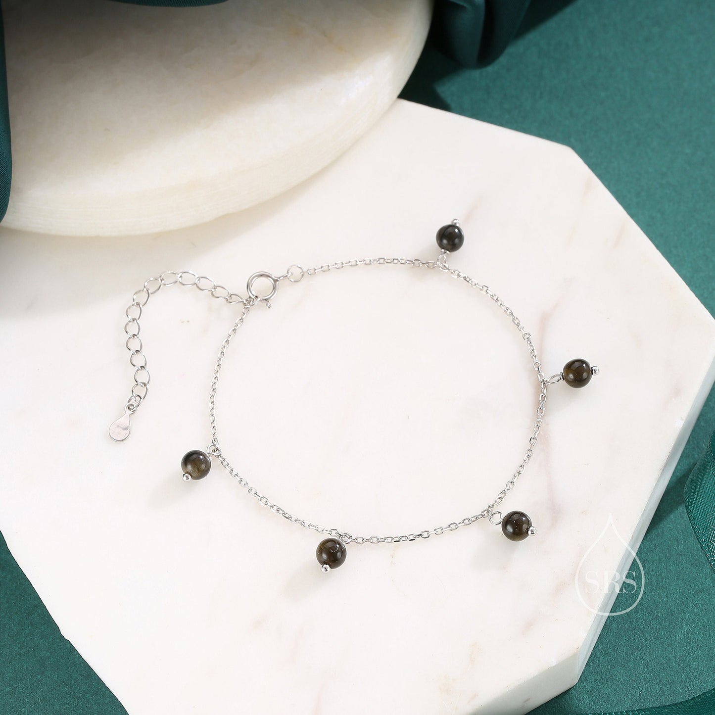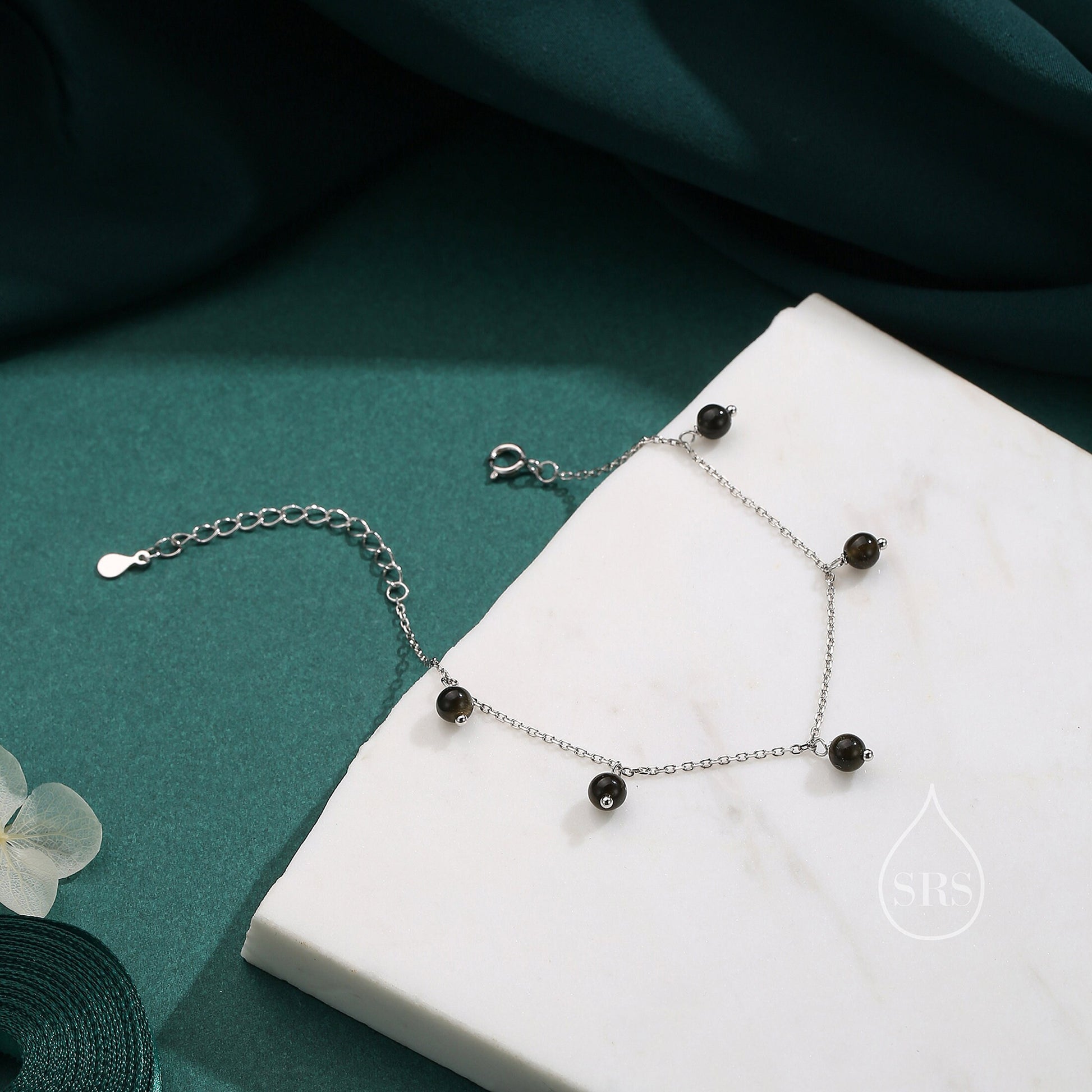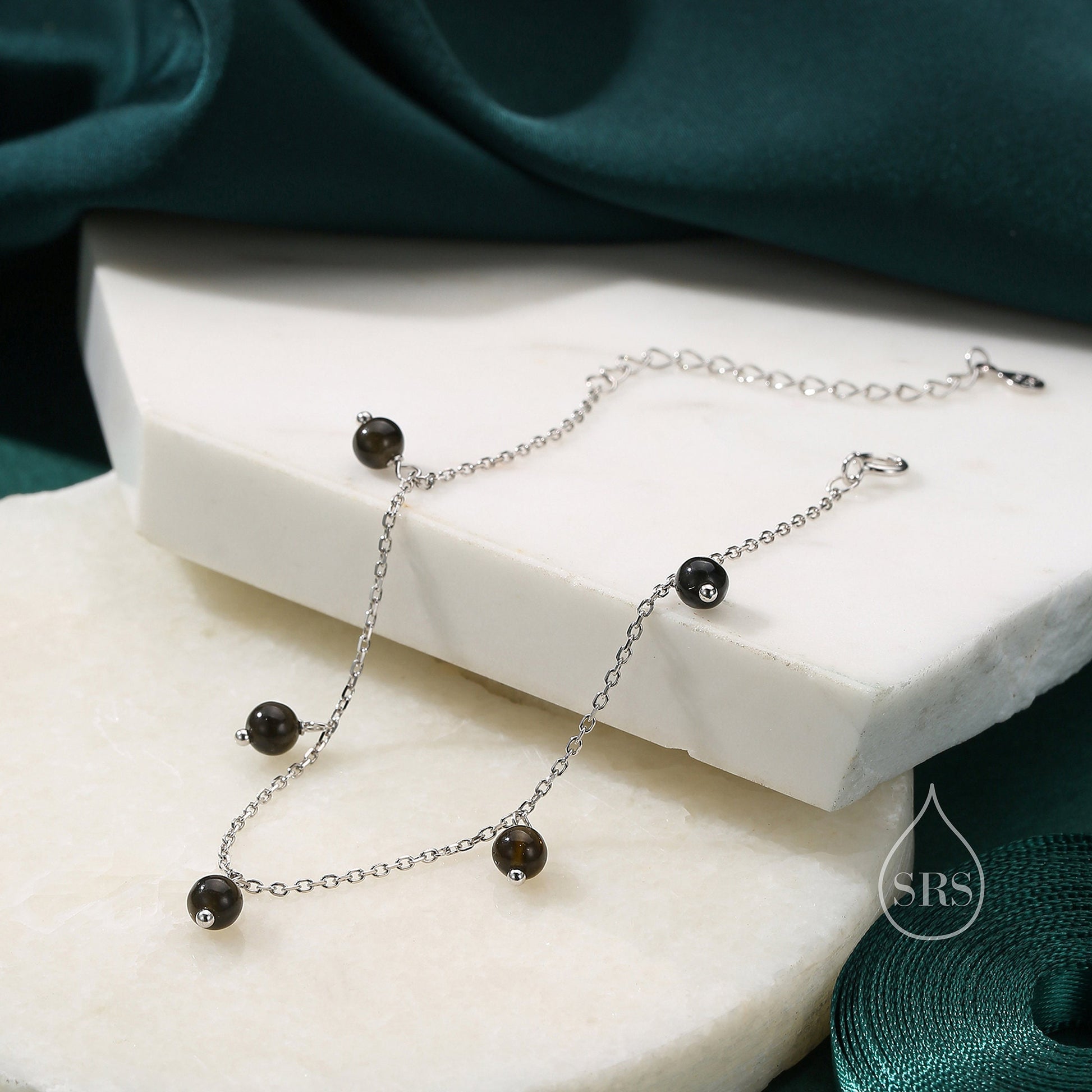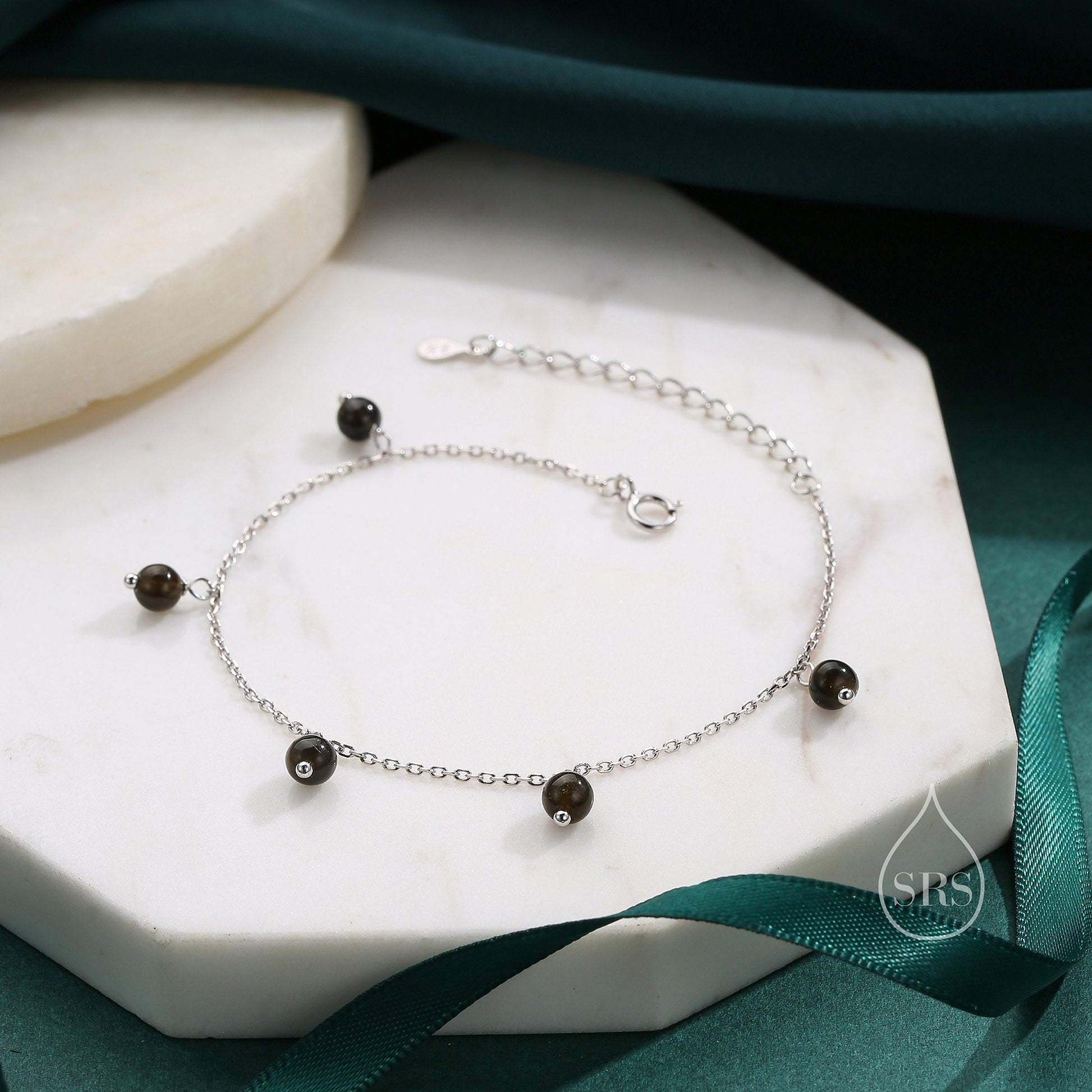 Natural Gold Obsidian Bracelet in Sterling Silver, Dark Obsidian Beaded Bracelet, Silver Obsidian Bracelet