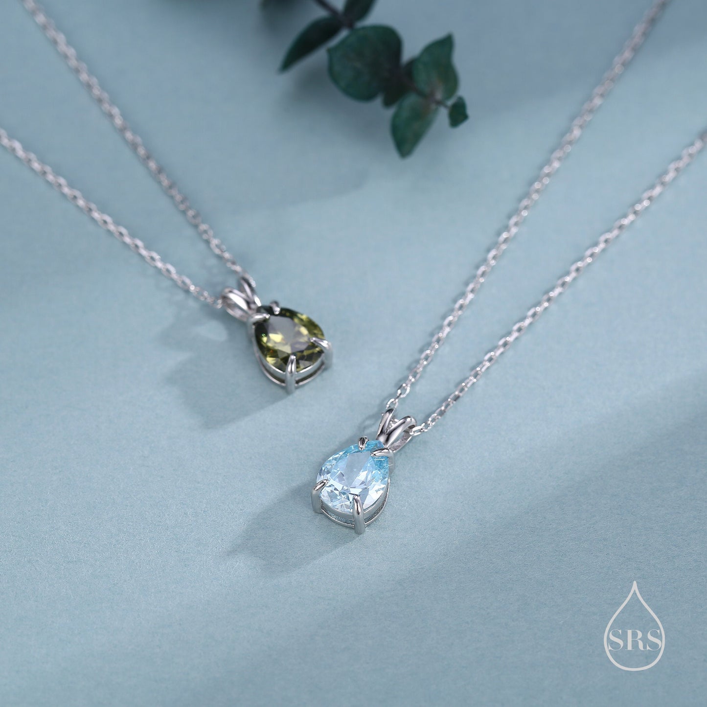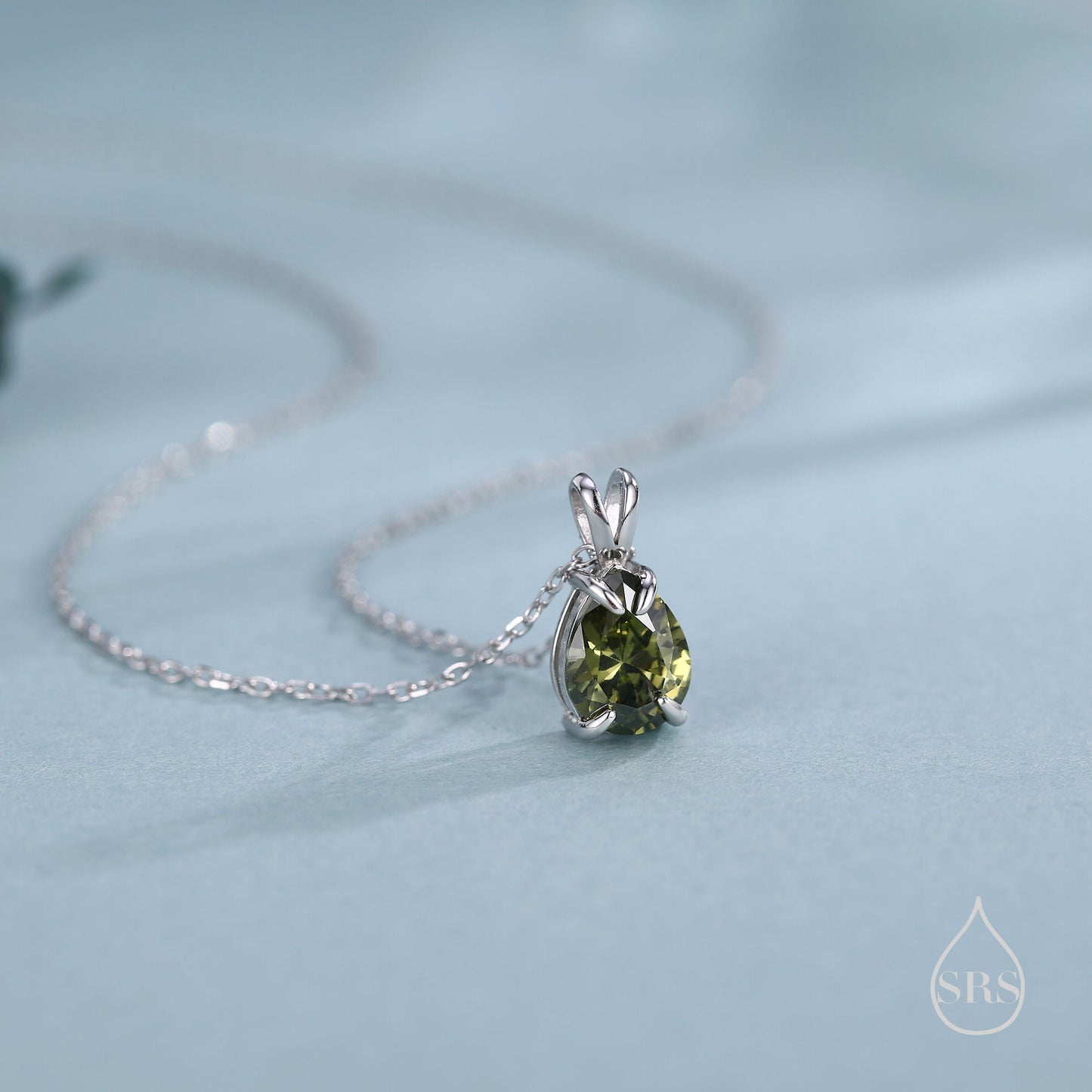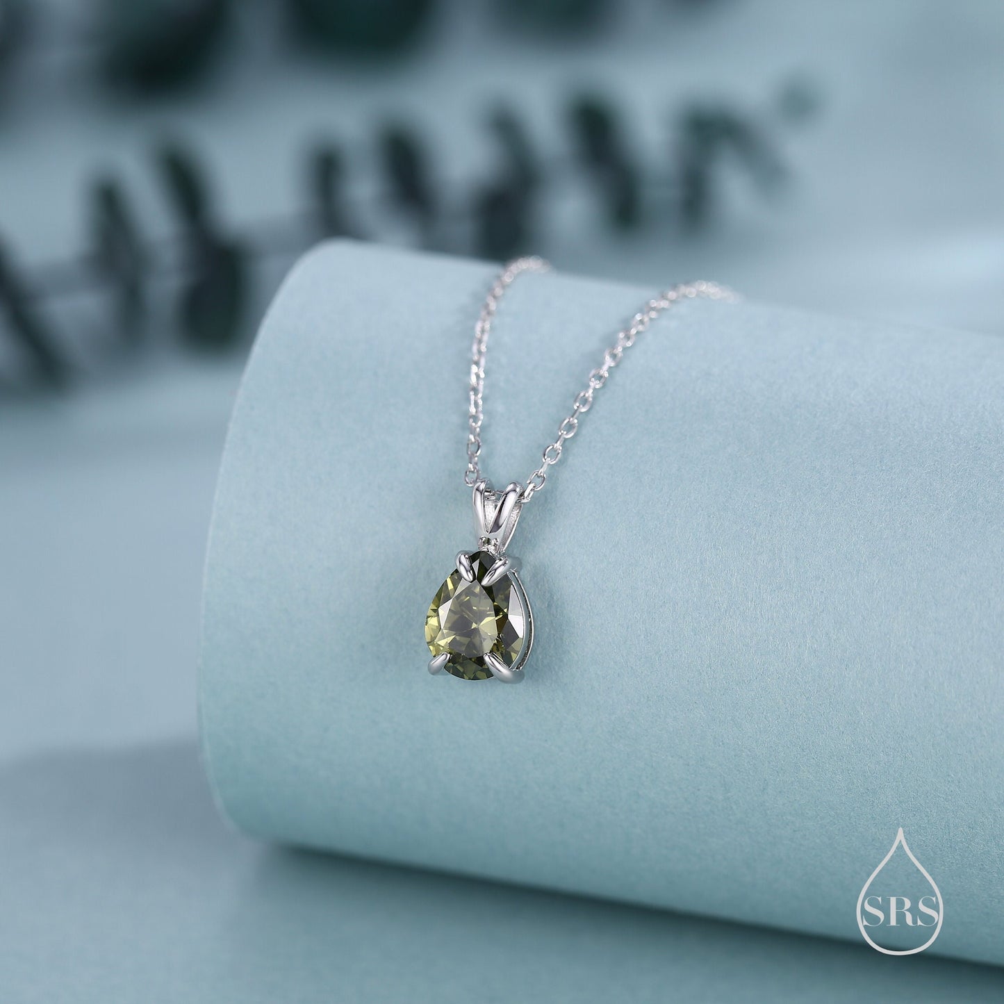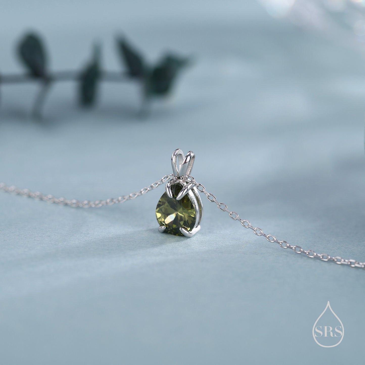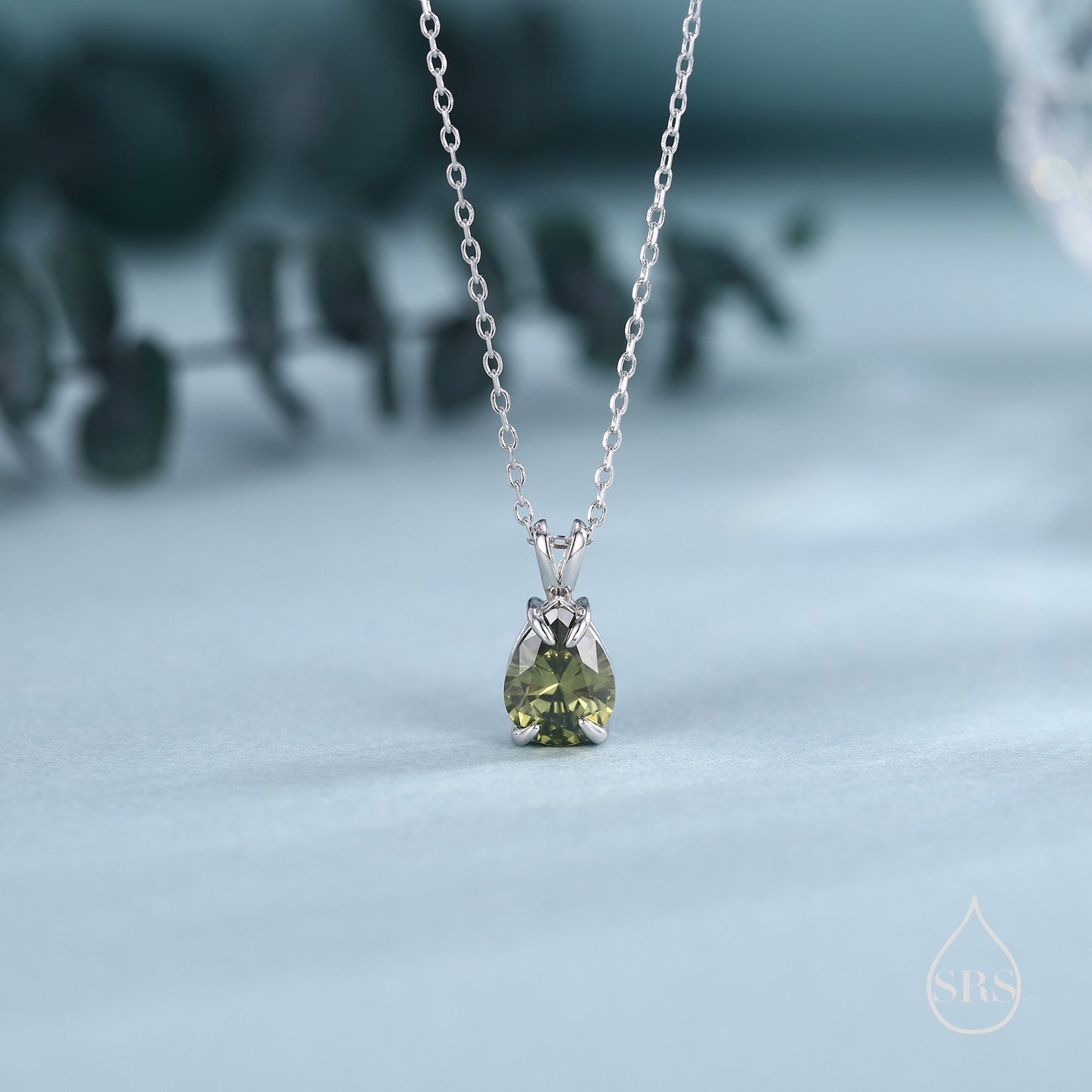 Olive Green CZ Pear Cut Pendant Necklace in Sterling Silver, 7 x 9mm, Green Droplet necklace, Diamond CZ, Peridot Colour CZ