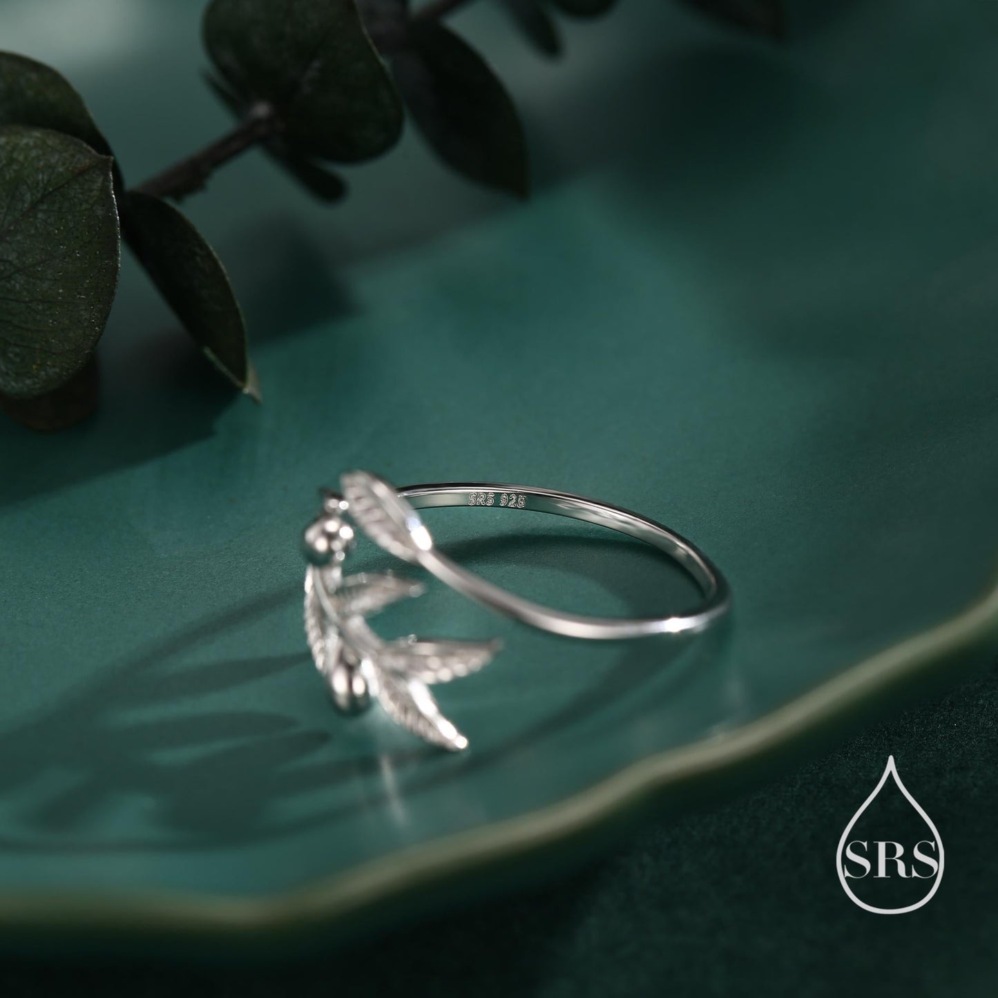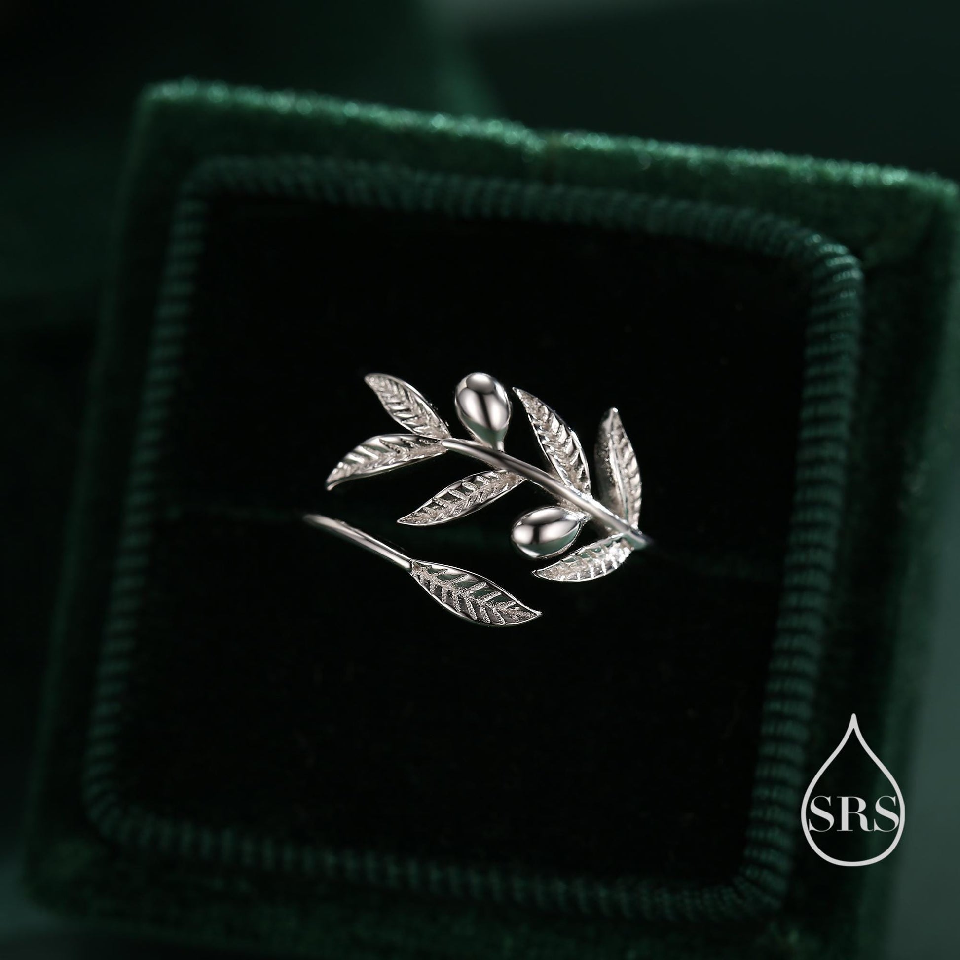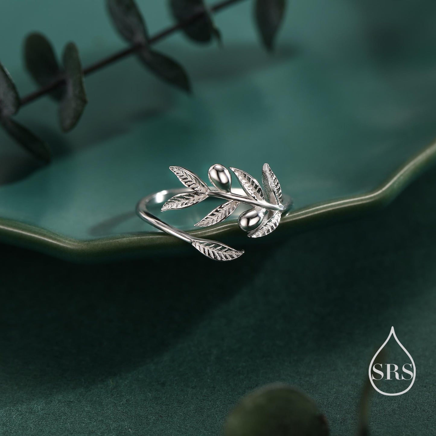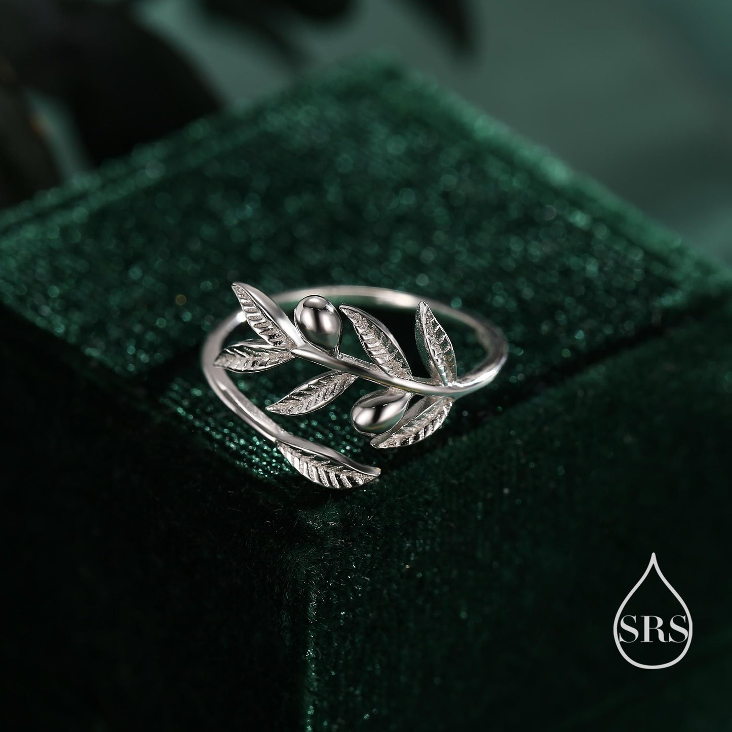 Olive Leaf with Olive Ring in Sterling Silver, Adjustable Size, Olive Branch Botanical Jewellery, Olive Fruit Ring