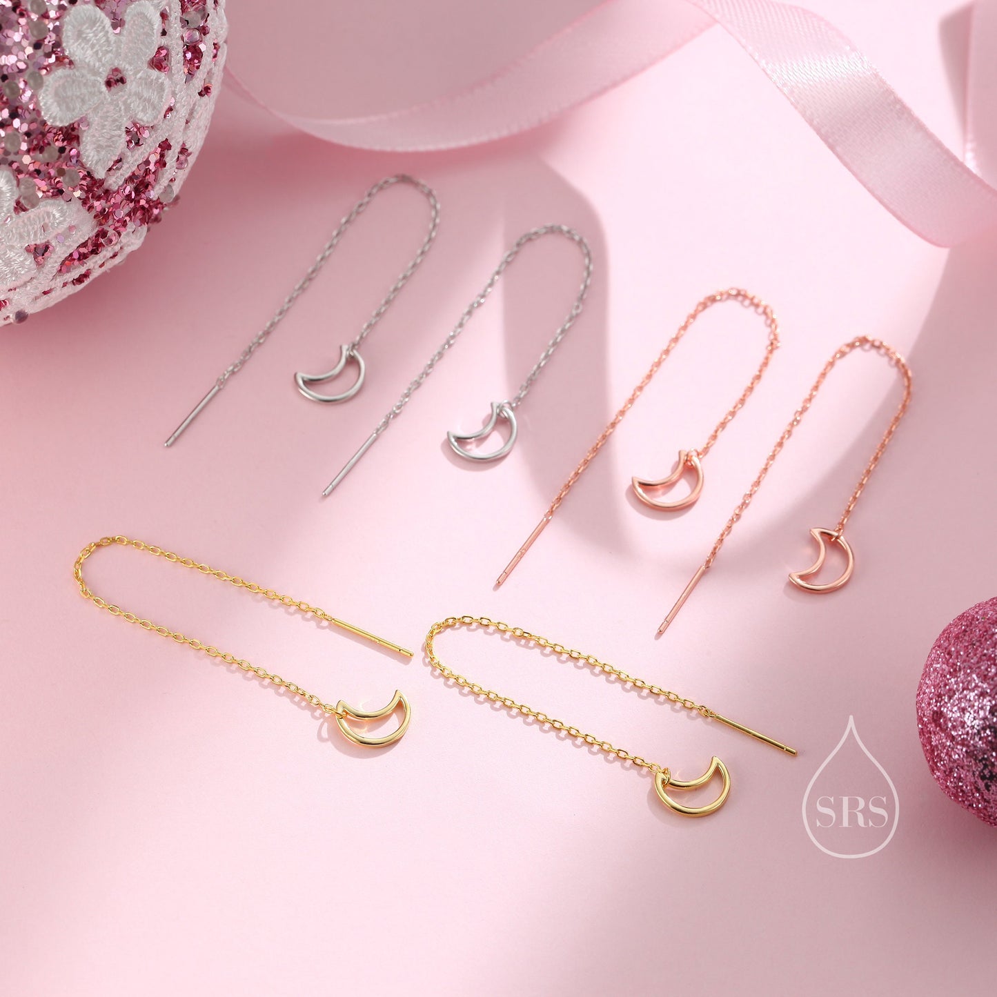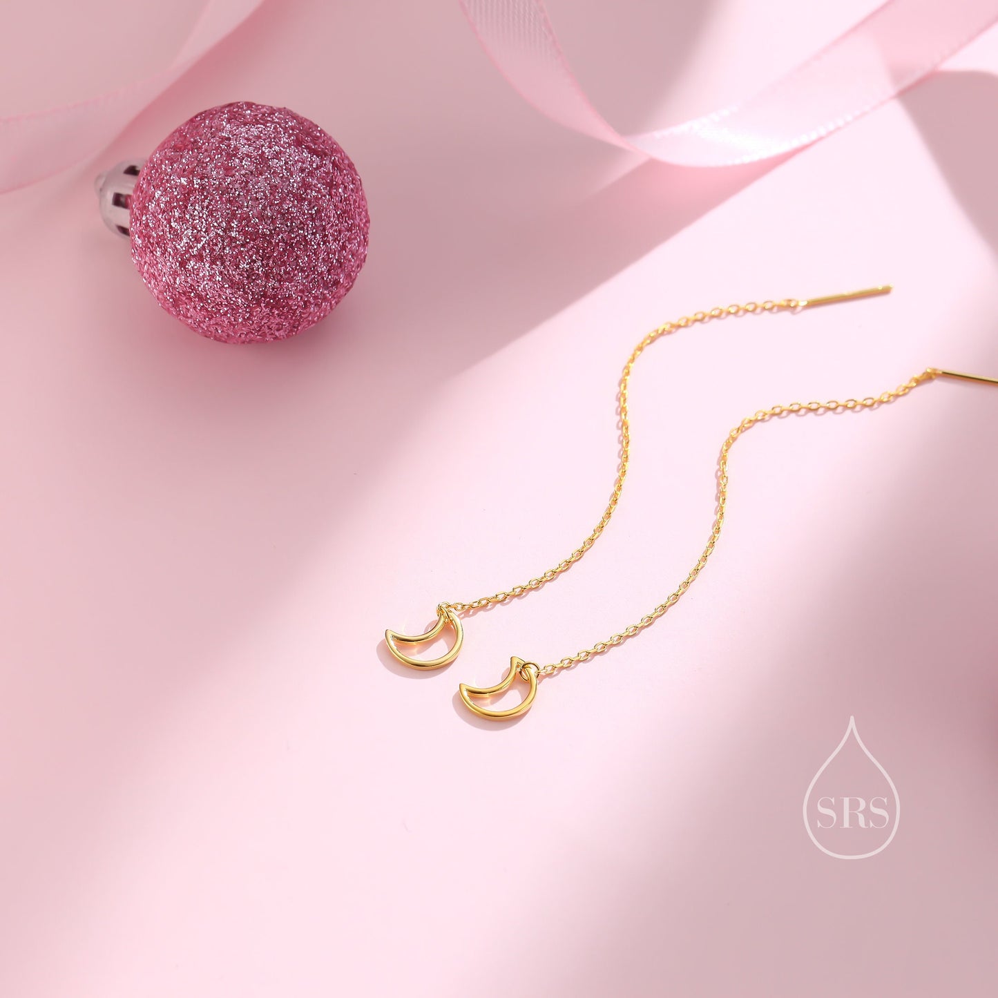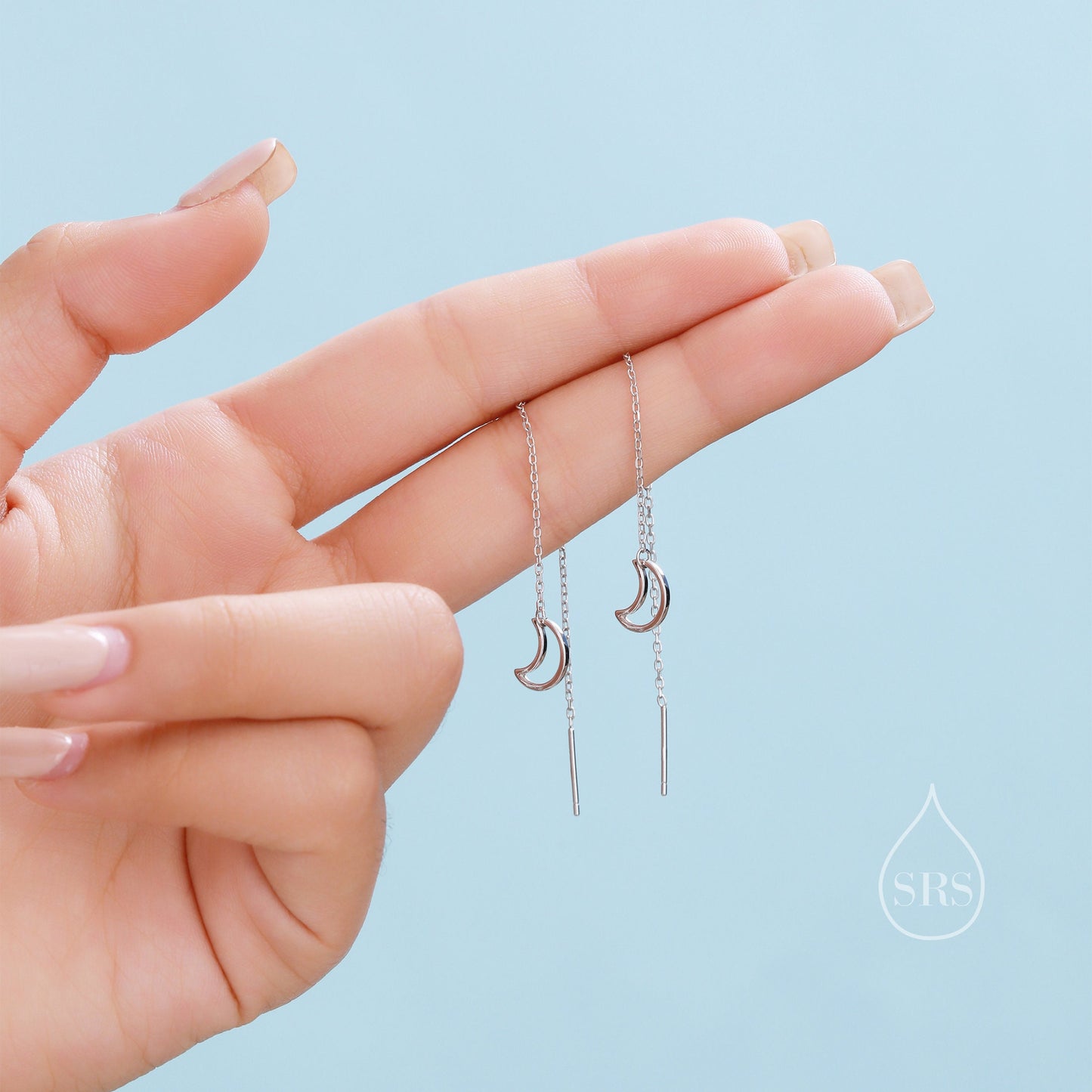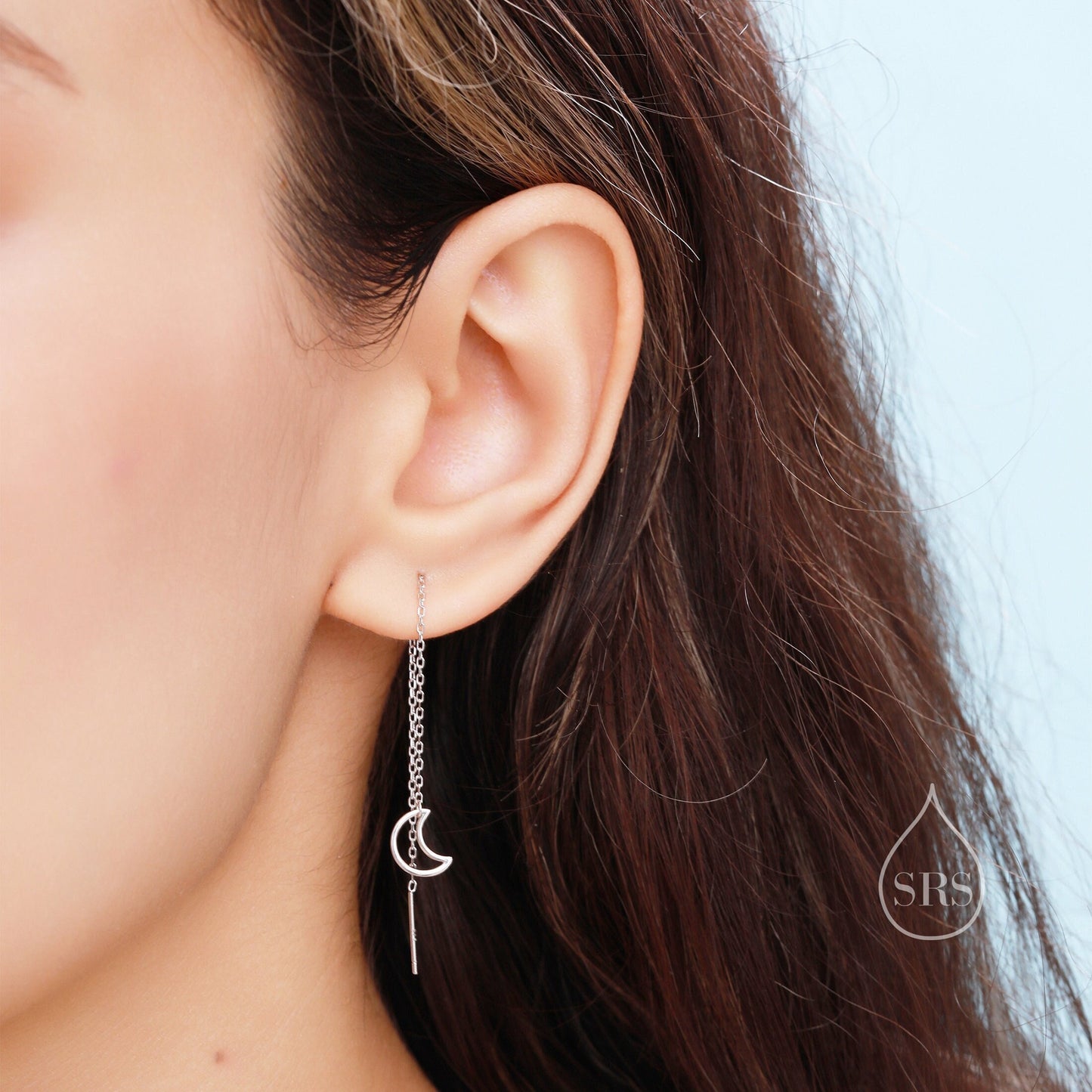 Open Moon Ear Threaders in Sterling Silver, Delicate Hollow Moon Threader Earrings, Dainty Open Moon Dangle Earrings