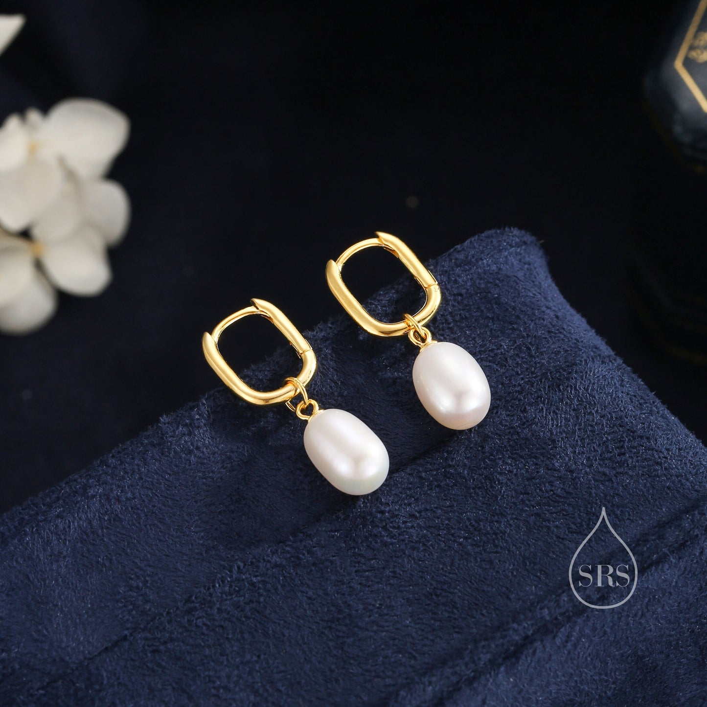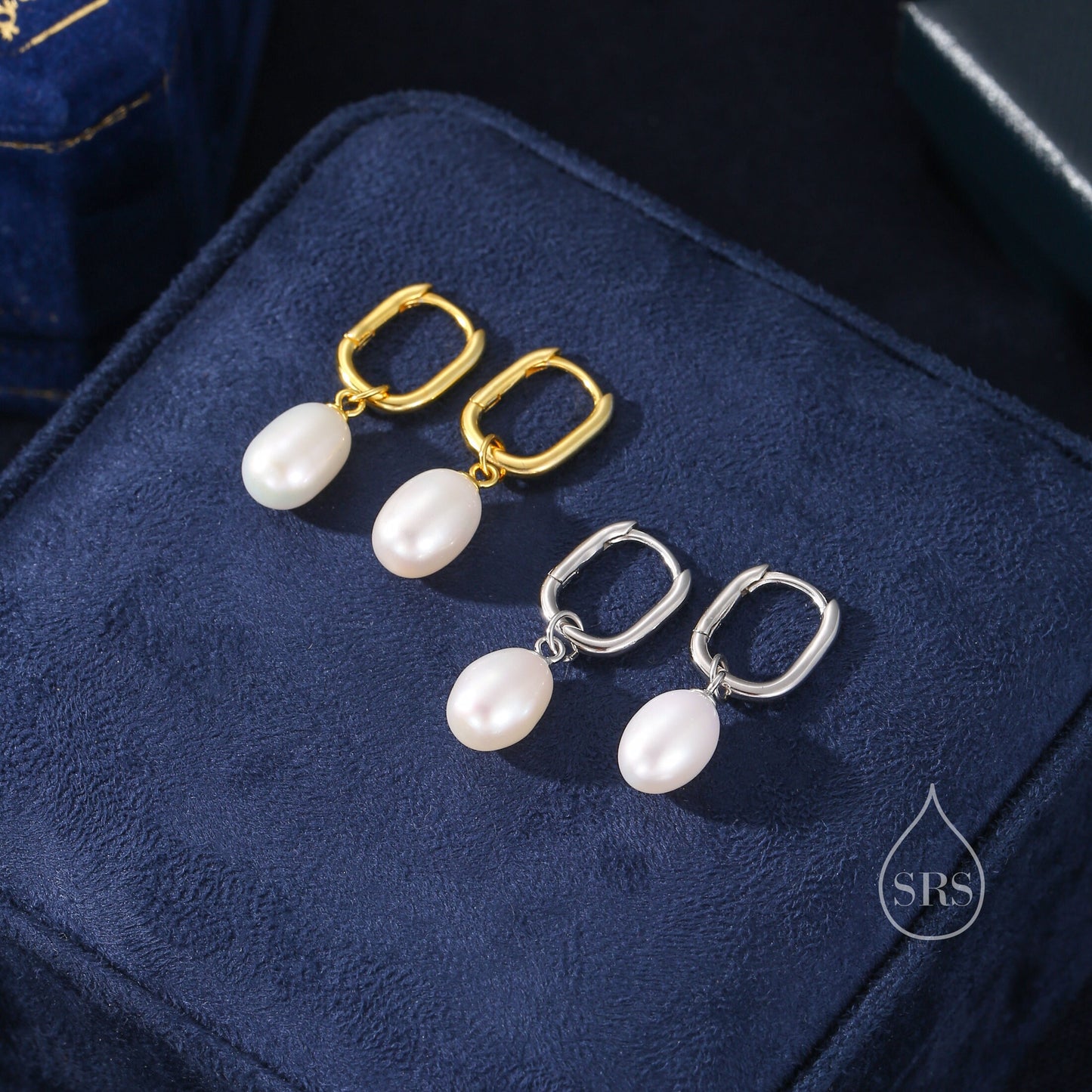 Oval Pearl Oval Hoop Earrings in Sterling Silver, Detachable Pearl Rectangle Hoop Earrings, Pearl Square Huggie Hoops, Keshi Pearls