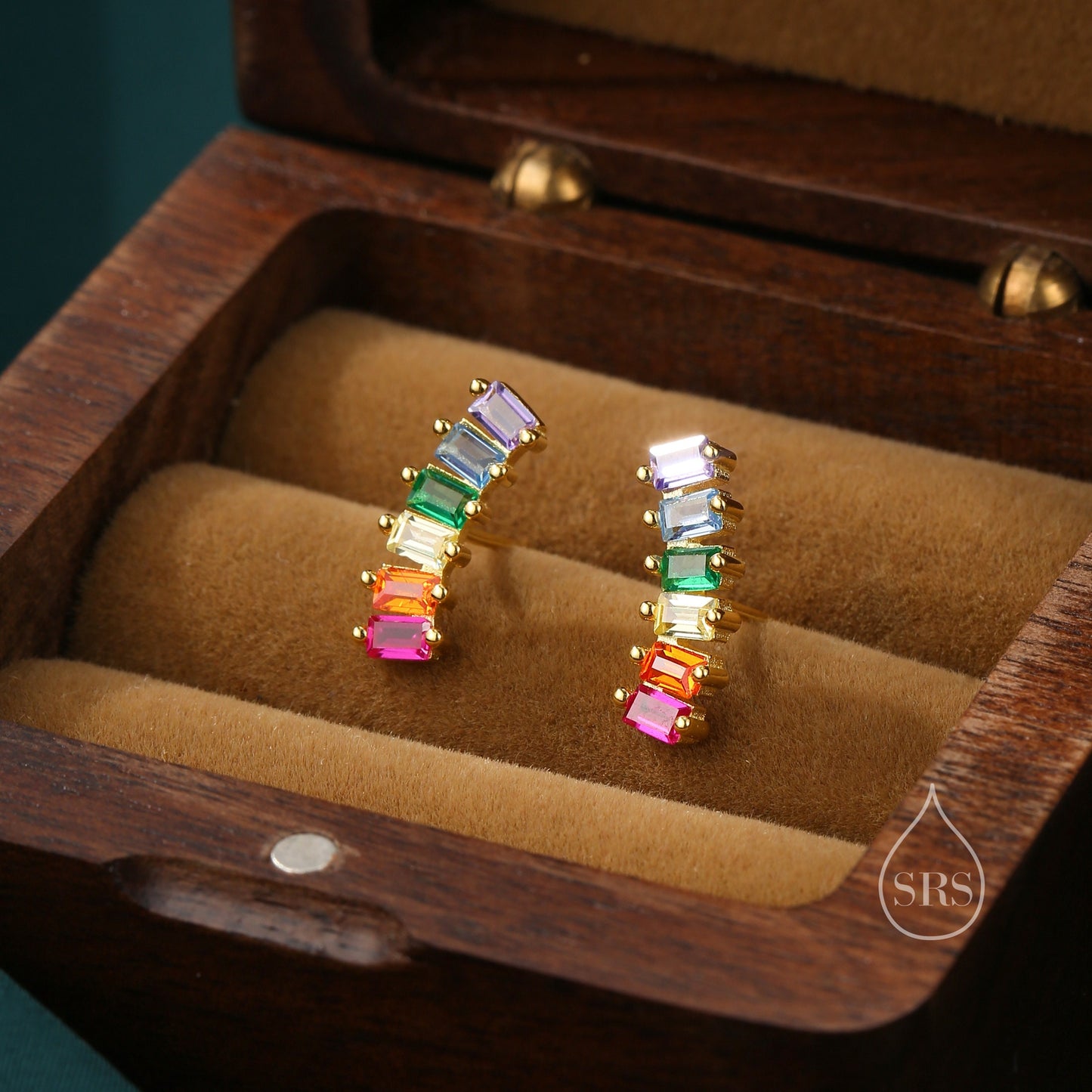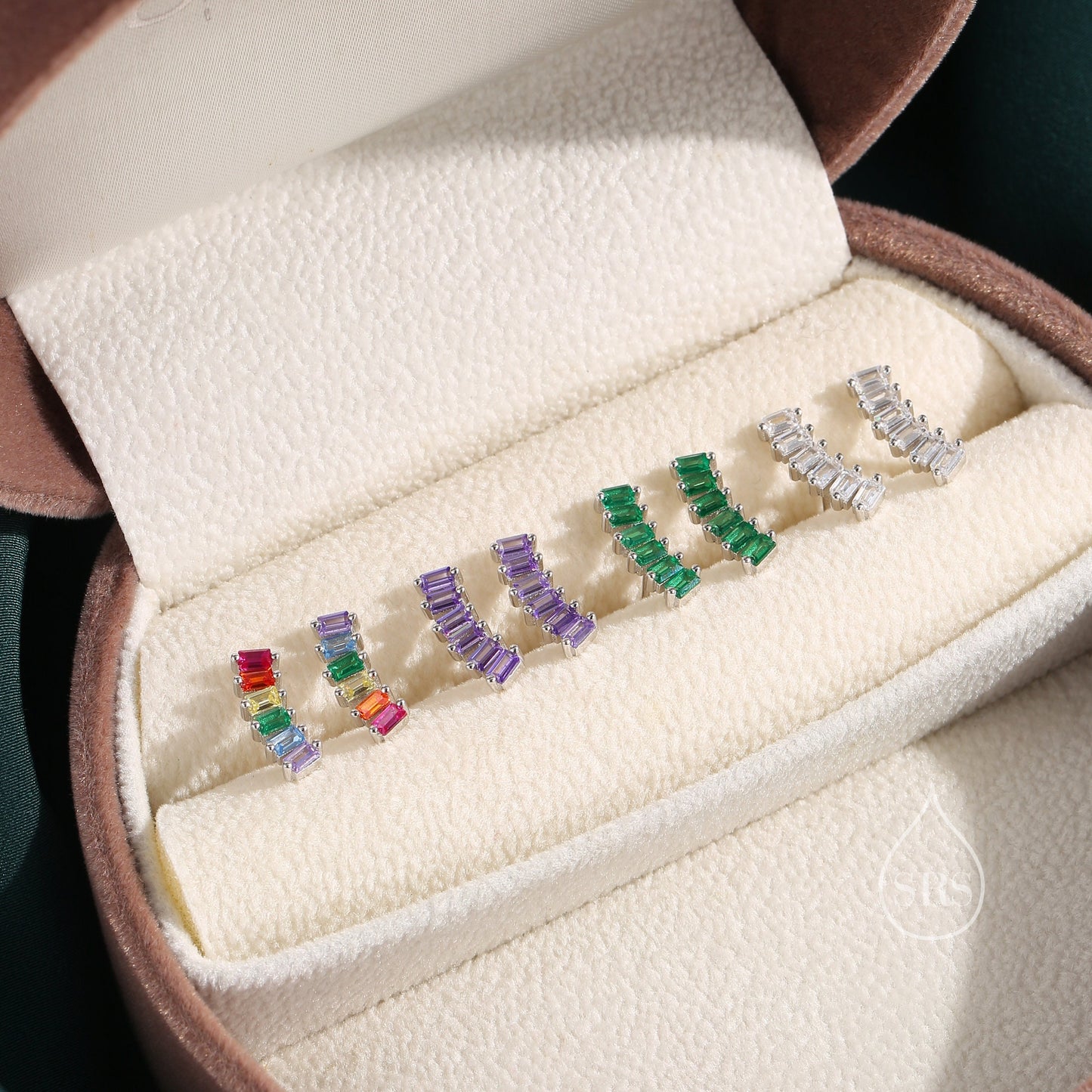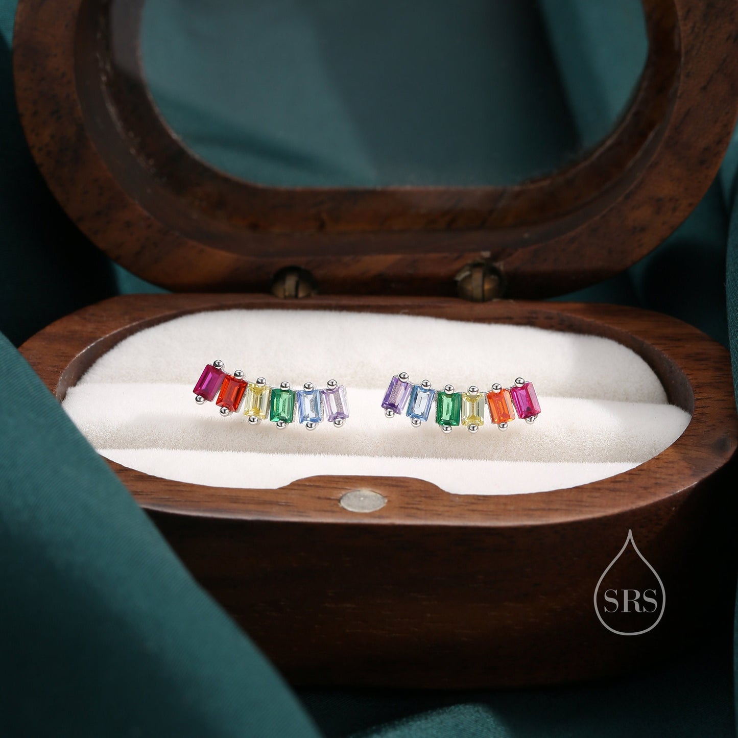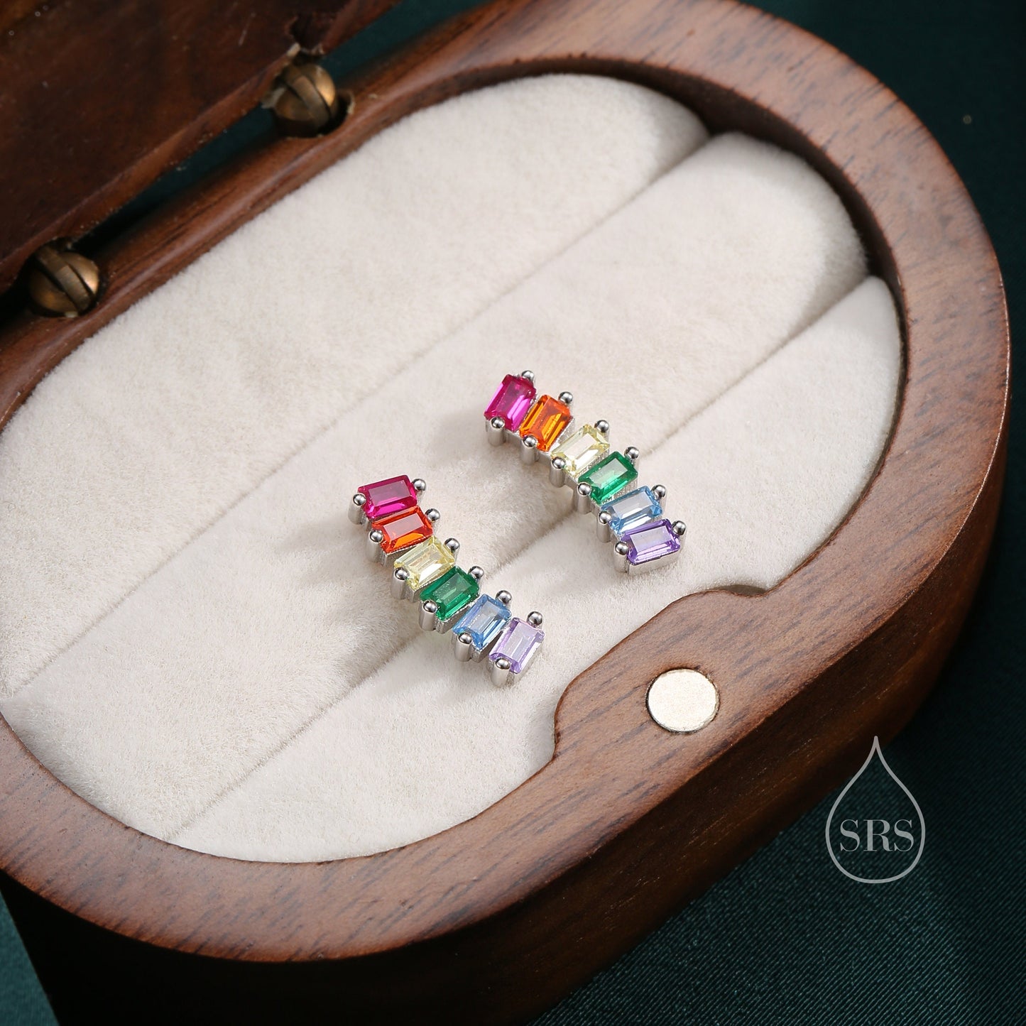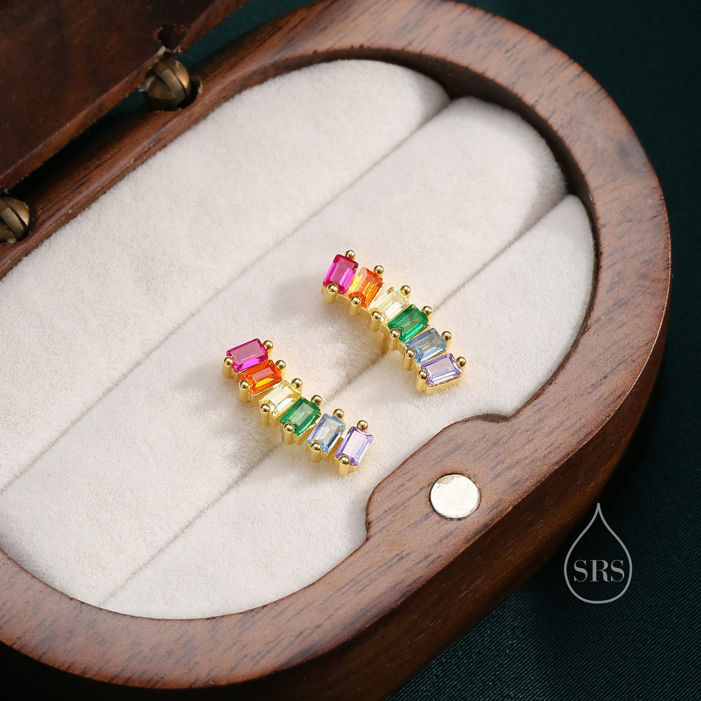 Rainbow Baguette CZ Stud Earrings in Sterling Silver, Silver or Gold, Rainbow Earrings, Rainbow Bar Earrings